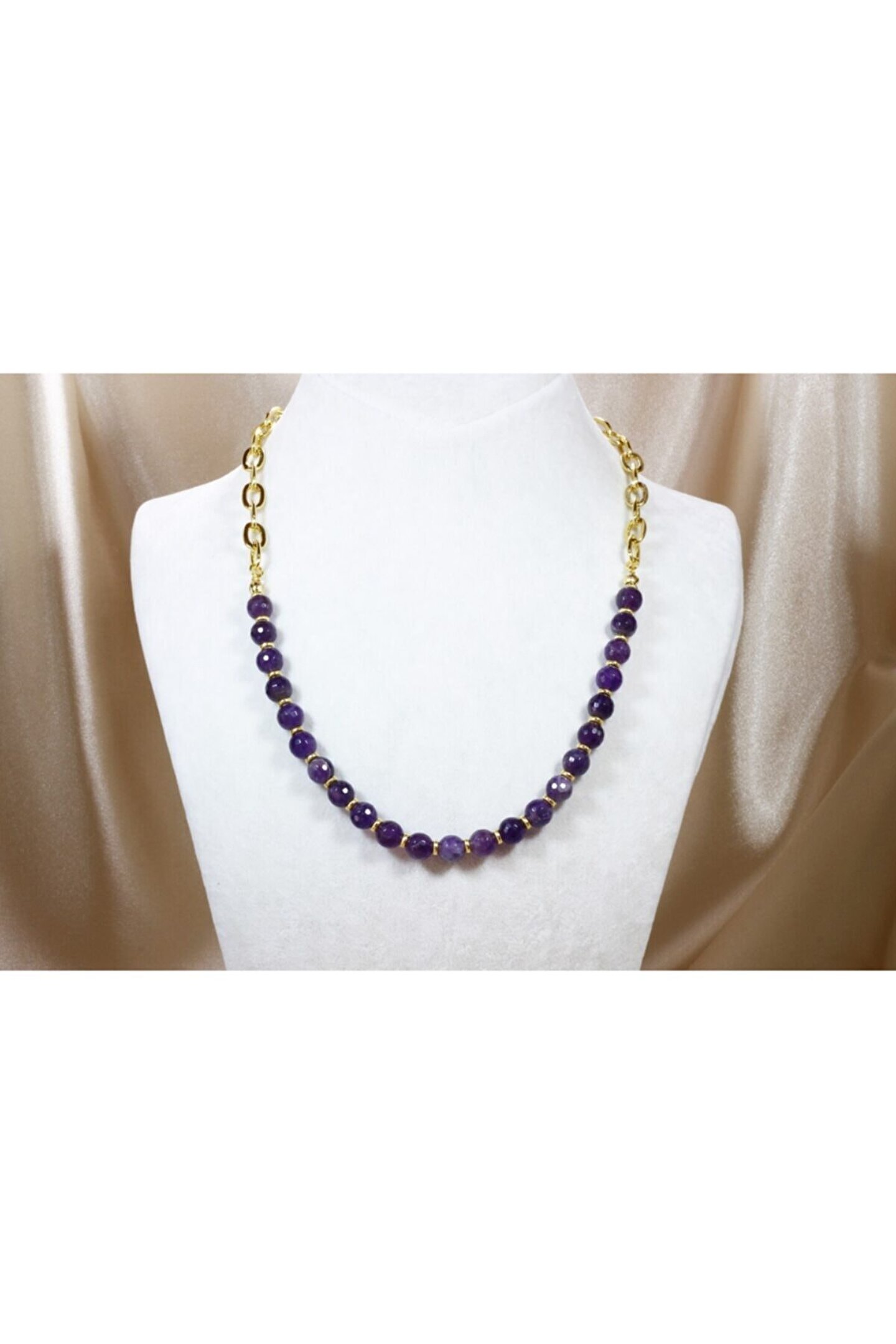 Altın Kaplama Zincirli Tasarım Kolye En tarz zincirlere en şifalı doğal taş yakışırdı. ; 2021 İlkbahar / Yaz modasının en iddaalı modellerinden biri şu an parmaklarınızın ucunda. ; Altın kaplama tarz zincirlerin parıltısı, faset kesimli ametist taşı ışıltısıyla buluştuğunda kendini özel hissetmek isteyen her kadın için muhteşem bir tasarım kolye ortaya çıktı. ; Butik olarak sınırlı sayıda özel tasarlanan Ametist Kolyeye sahip olmak için acele edin. ; Ametist Kolye tane ölçüleri 8 mm / Toplam Uzunluk 51 cm;