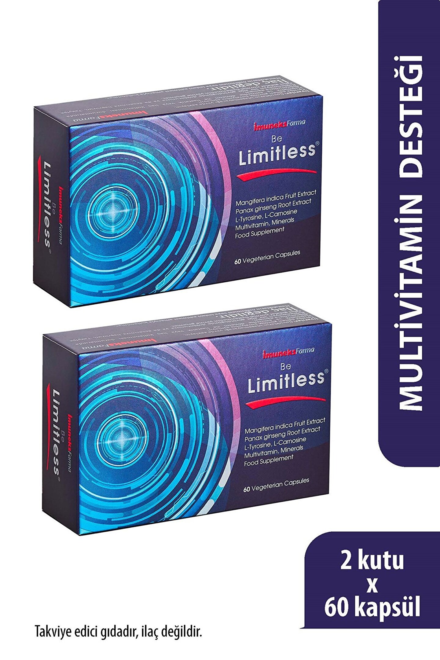 İmuneks Farma Be Limitless®Mangifera indica Mango Meyve ekstresi, Panax ginseng Kök Ekstresi, L-Tirozin, L-Karnosin, Multivitamin, Mineraller İçeren Takviye Edici Gıda x 2 Adet
