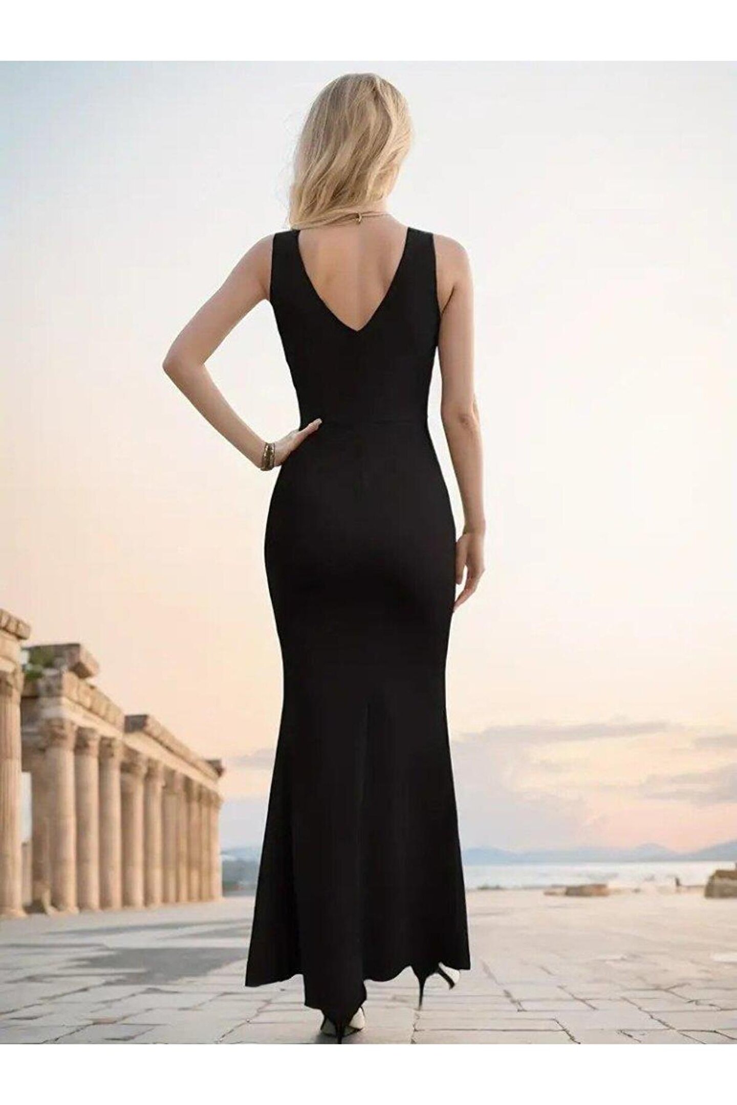 Kadın Askılı Kruvaze Yaka Yırtmaç Detaylı Janjan Krep Elbise