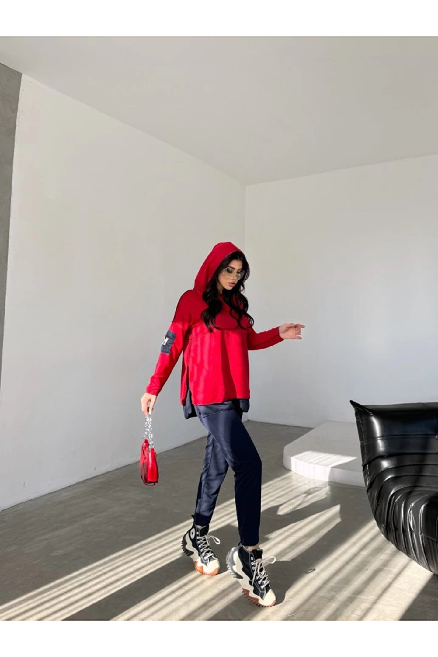 Kadın Kırmızı Kapşonlu Etek Ucu Detay Arma Ters Dikiş Gorunumlu Ikili Takım
