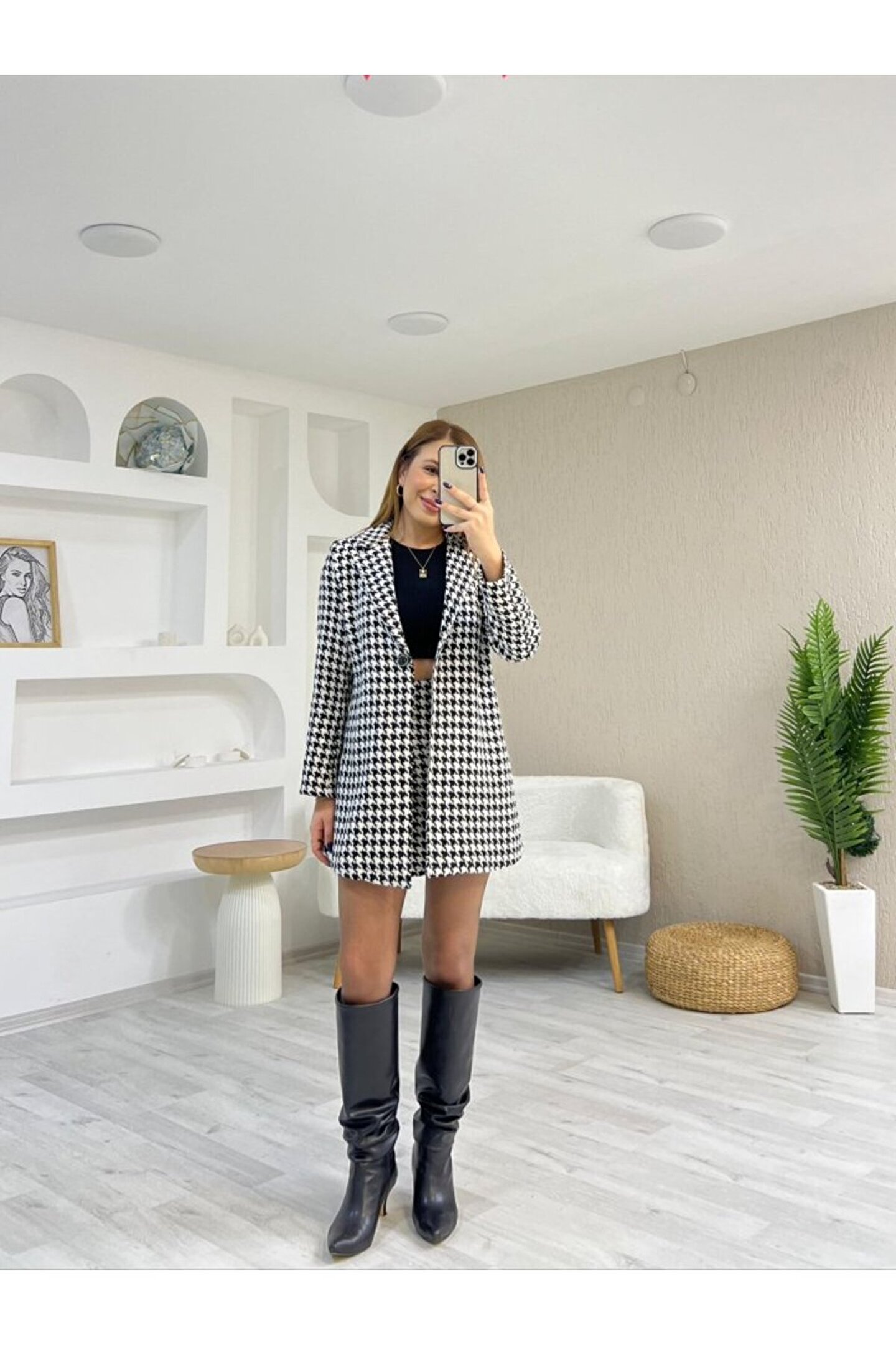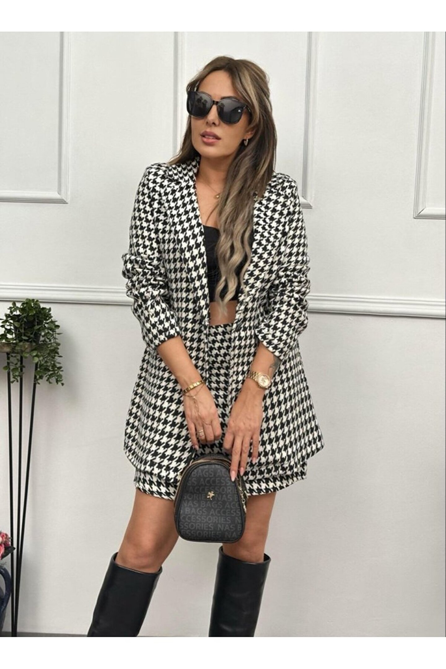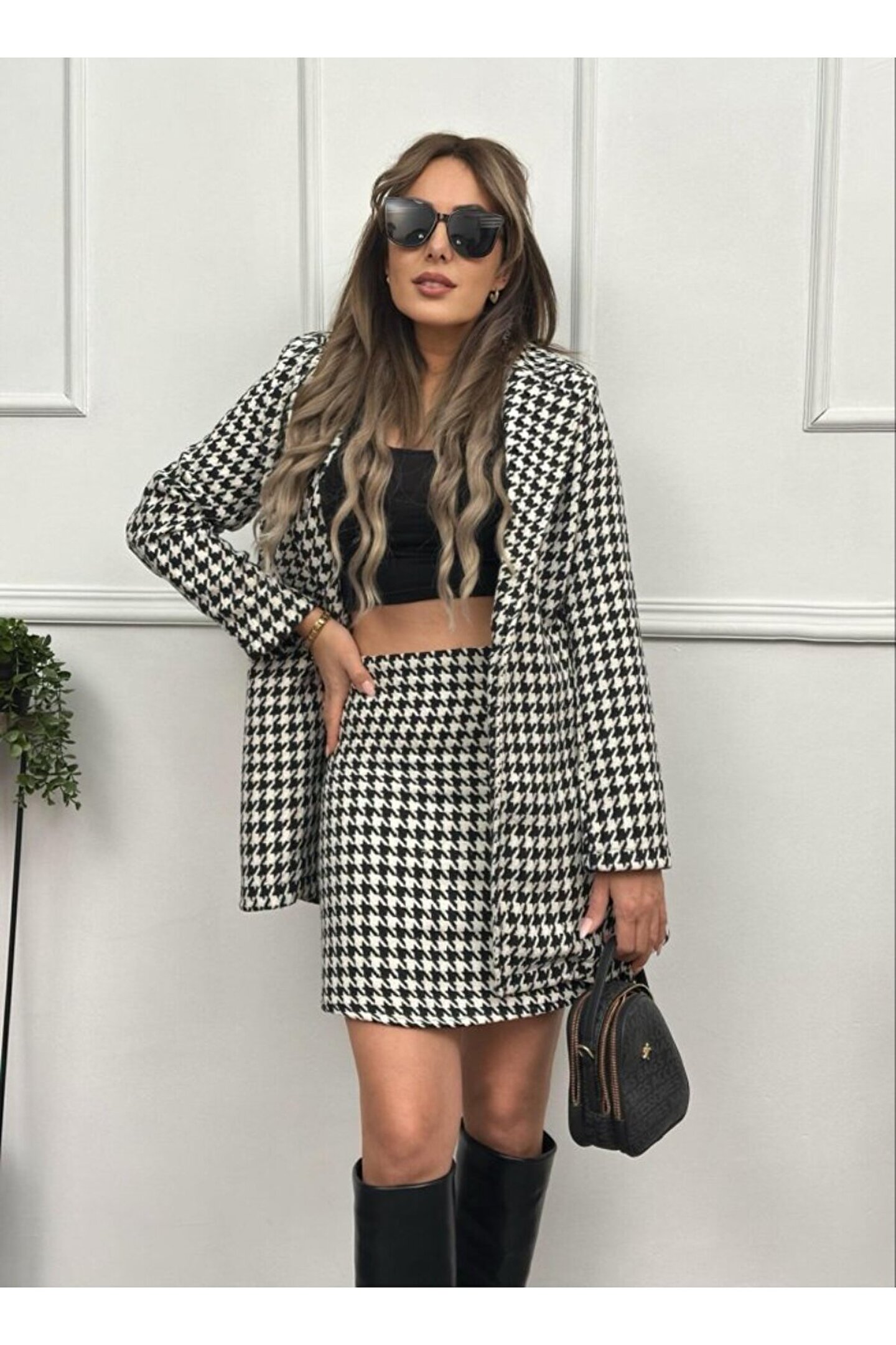 isez Kadın Kazayağı Desen Vatka Detay Kaban Ve Yüksek Bel Etek Ikili Takım
