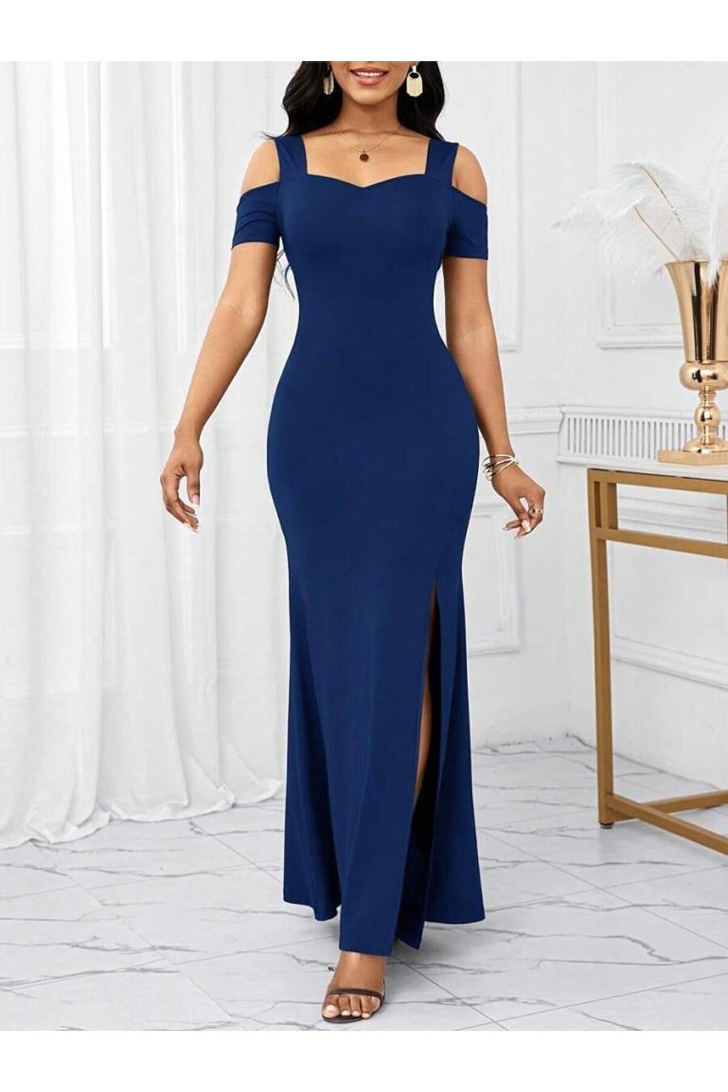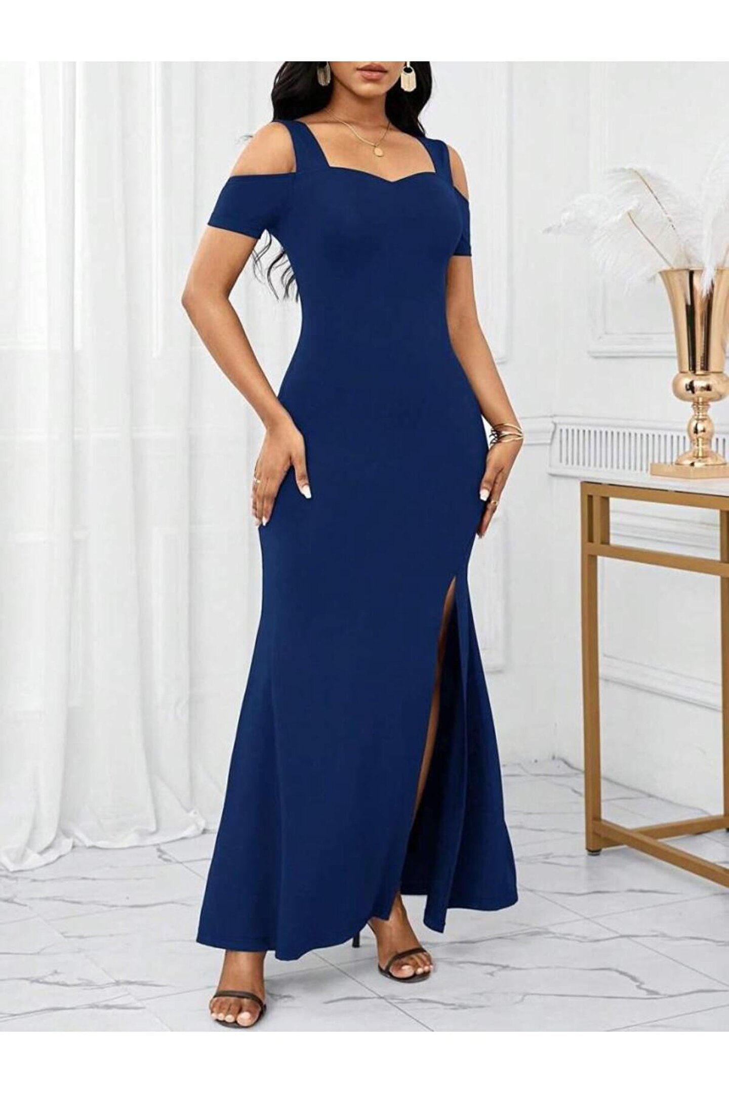 isez Kadın Omuzlardan Açık Askılı Yırtmaç Detaylı Uzun Ithal Krep Elbise