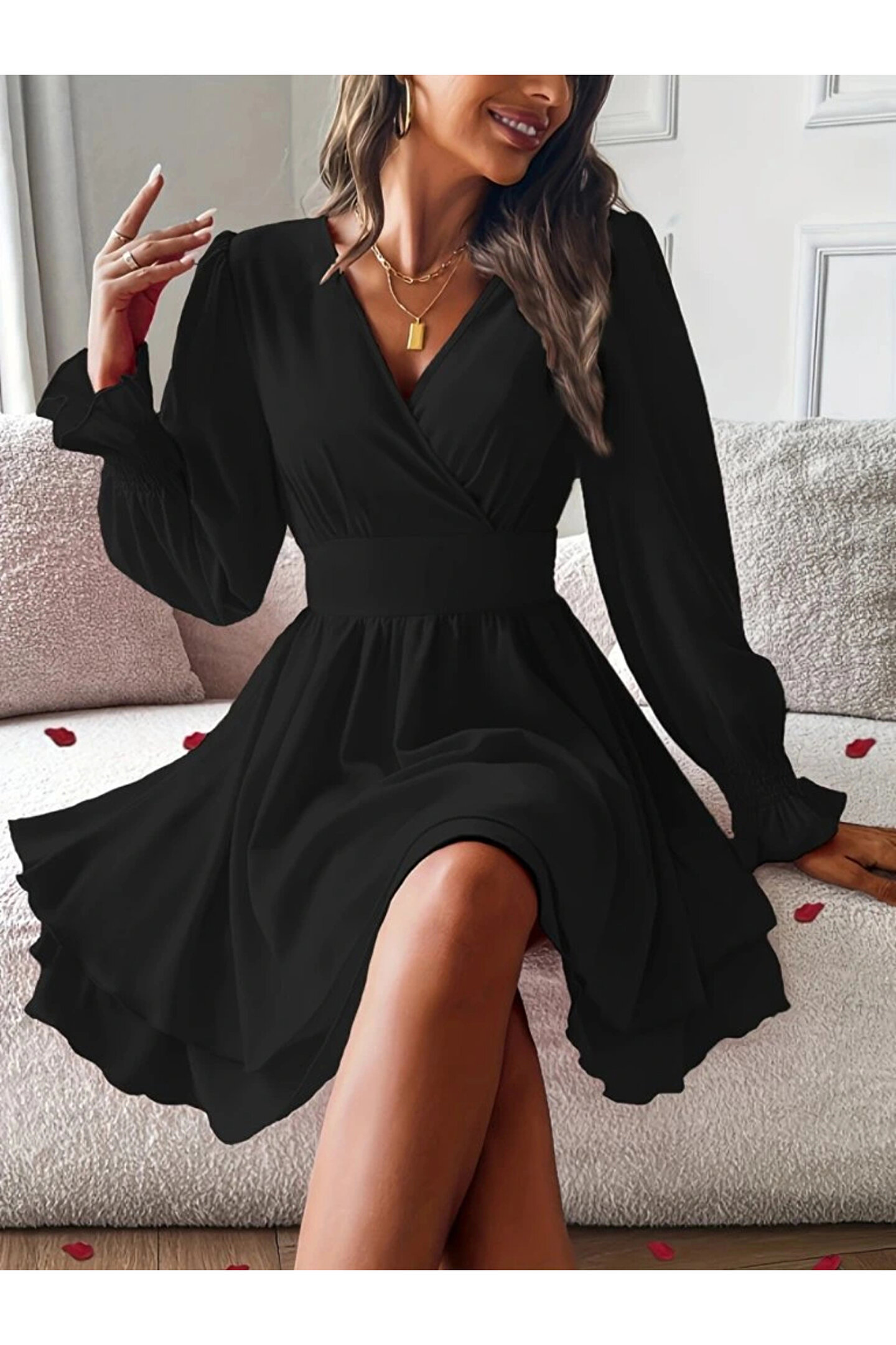 Kadın Uzun Kollu Kruvaze Yakalı Mini Sandy Elbise