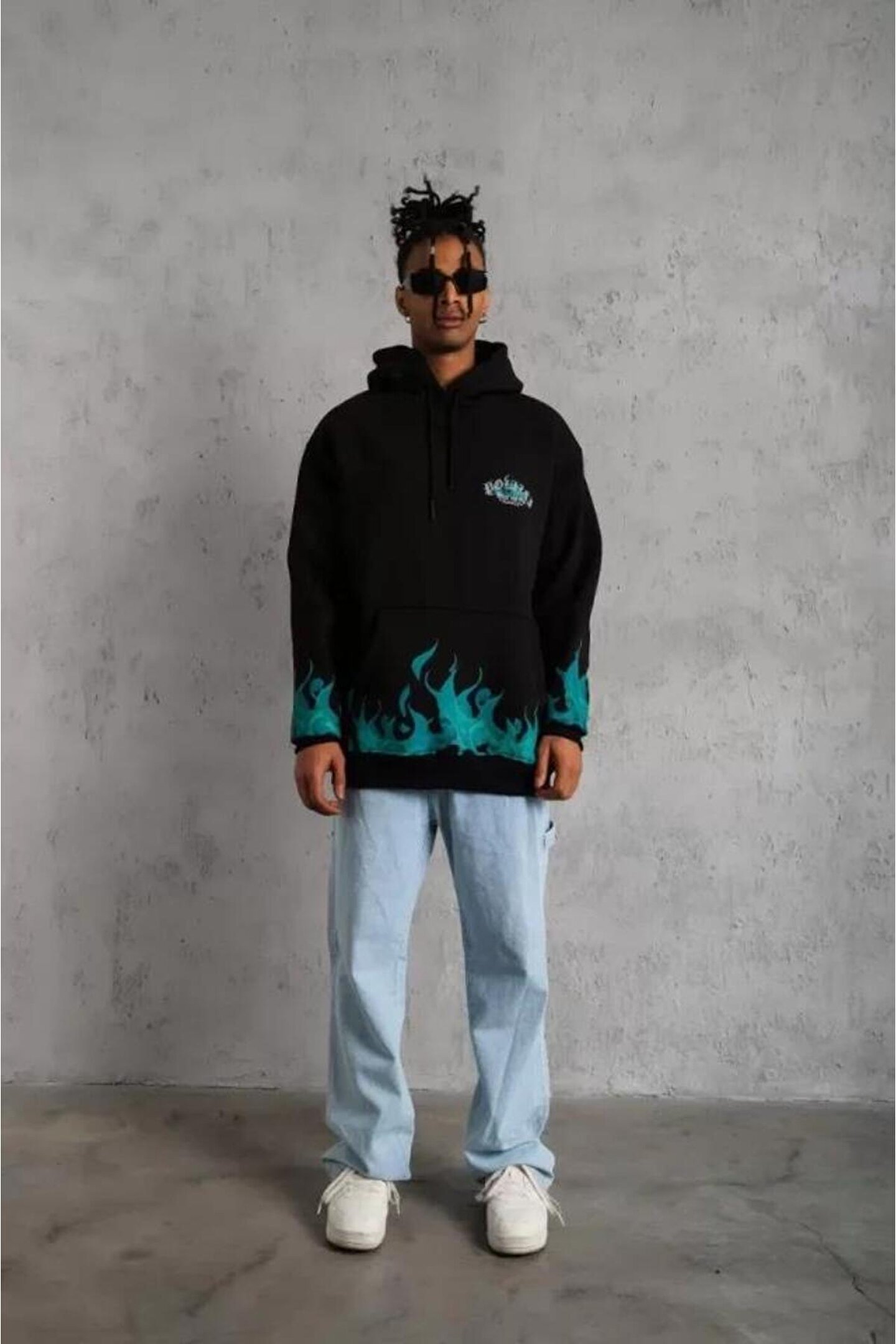 IVORA WEAR Erkek Üç İplik İçi Pamuklu Alev Baskılı Kapüşonlu Sweatshirt - Siyah