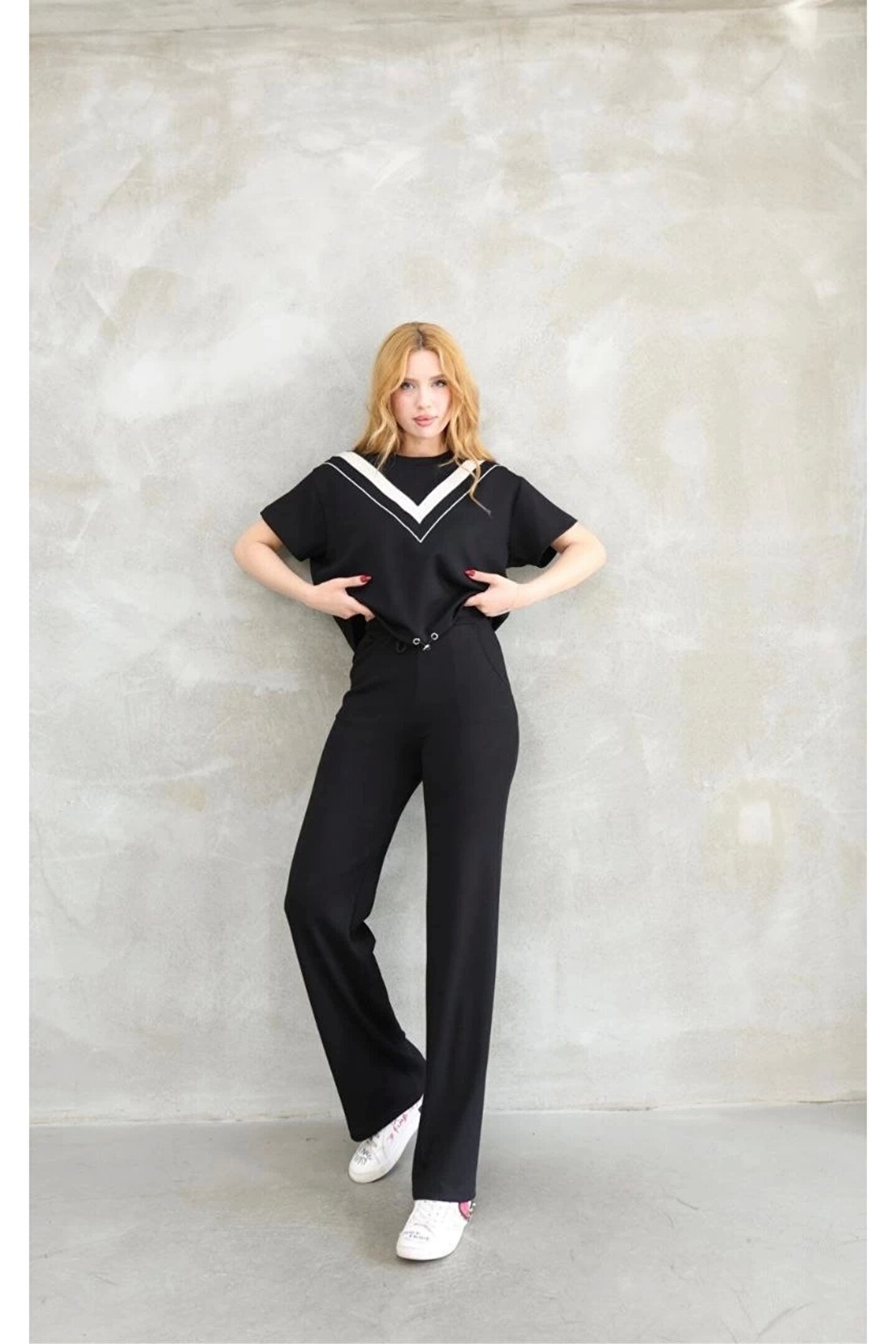 IVORA WEAR Osy Modal Yumuşak dokulu Kumaş Bisiklet Yaka Parçalı detaylı Kısa Kollu Takım - Siyah
