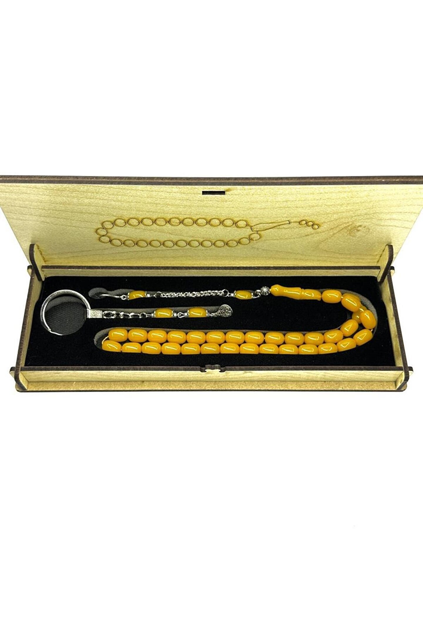 Ahşap Kutuda Anahtarlık Kombinli Kapsül Model Püsküllü 8-12mm Sıkma Kehribar Tesbih