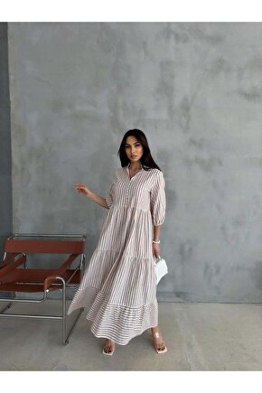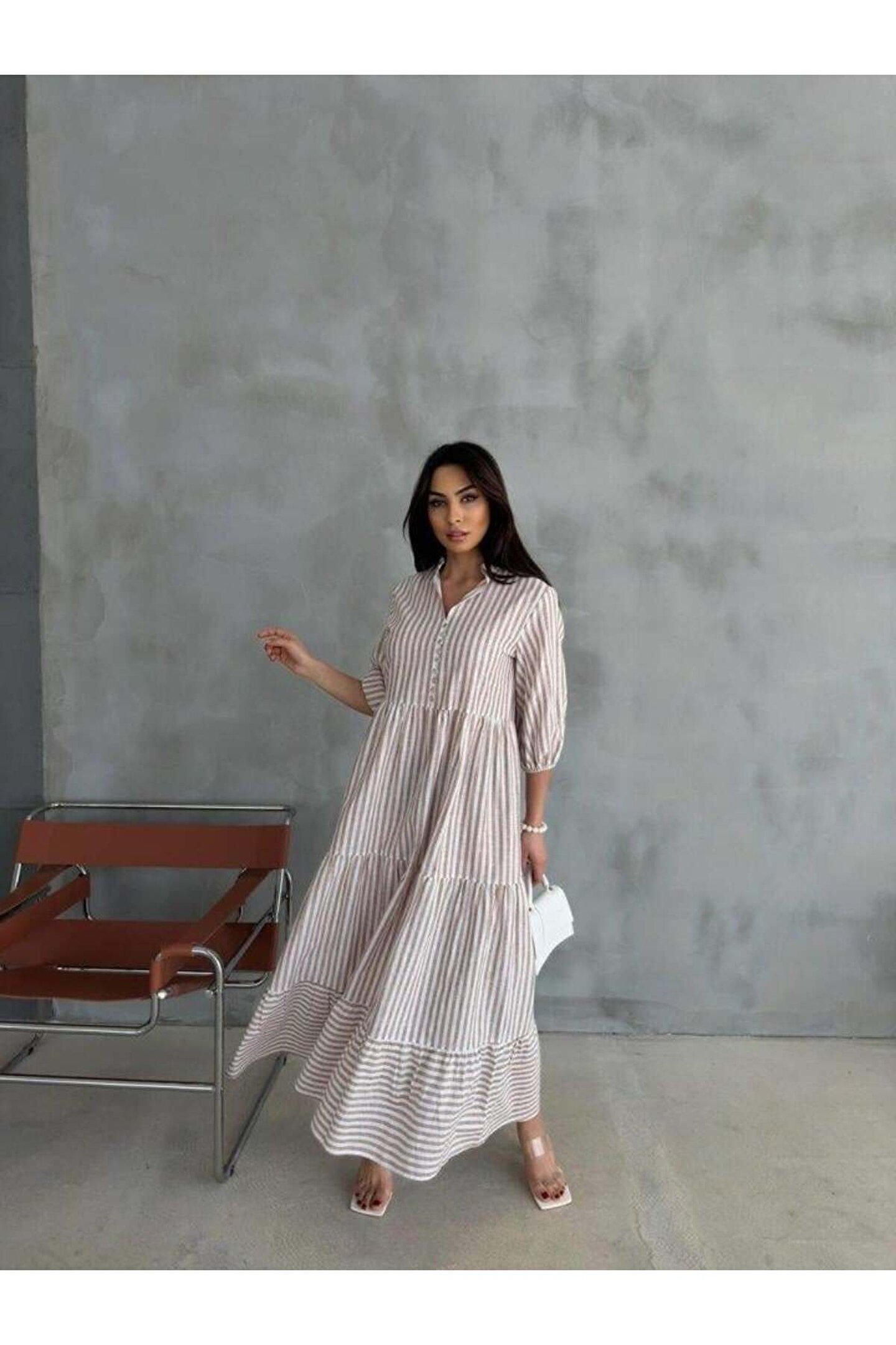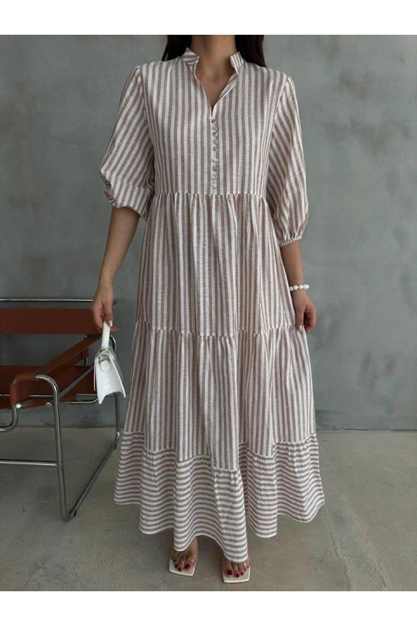 ÇİZGİLİ KETEN HAKİM YAKA DÜĞMELİ SALAŞ ELBİSE - Kahverengi