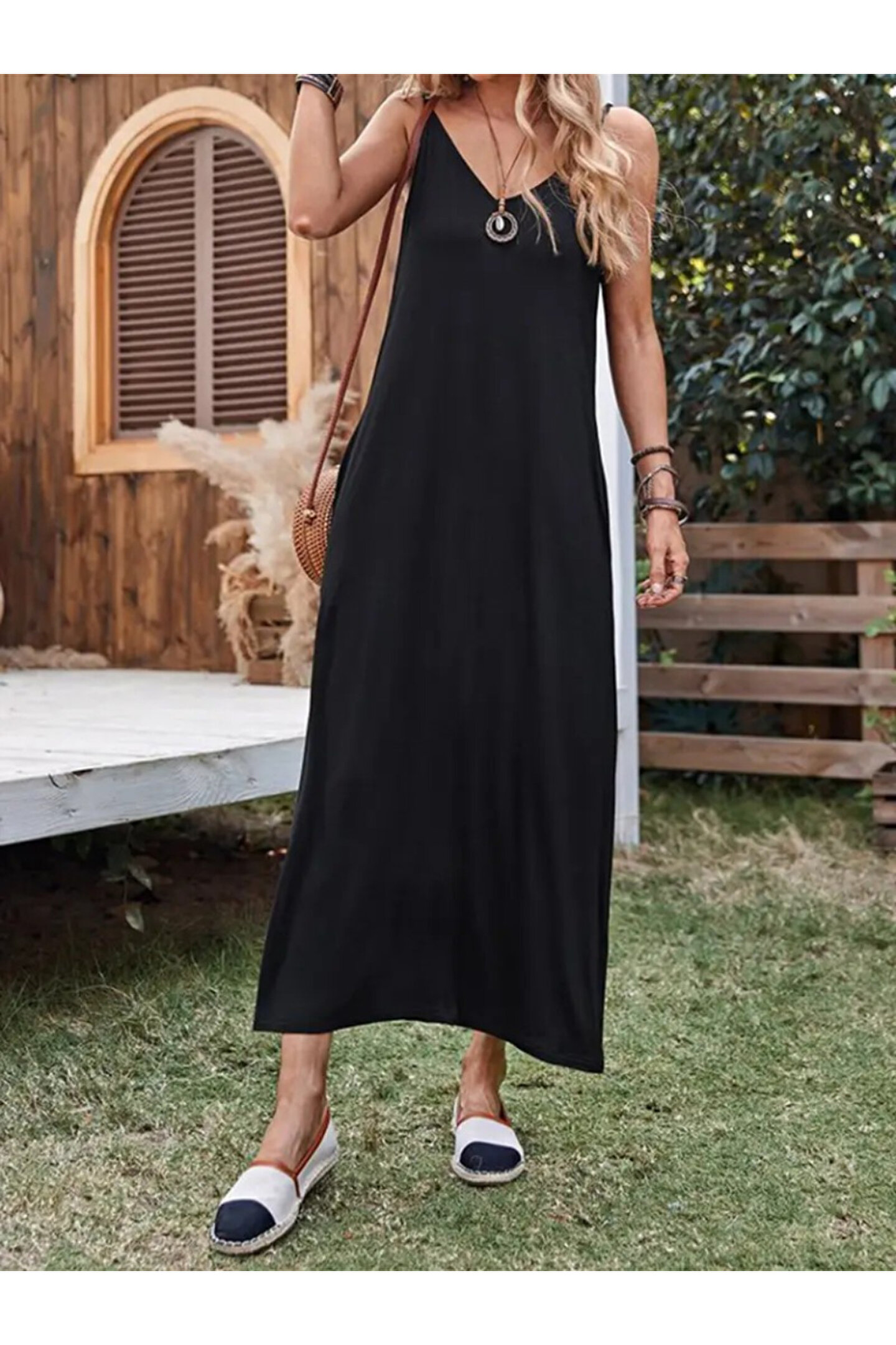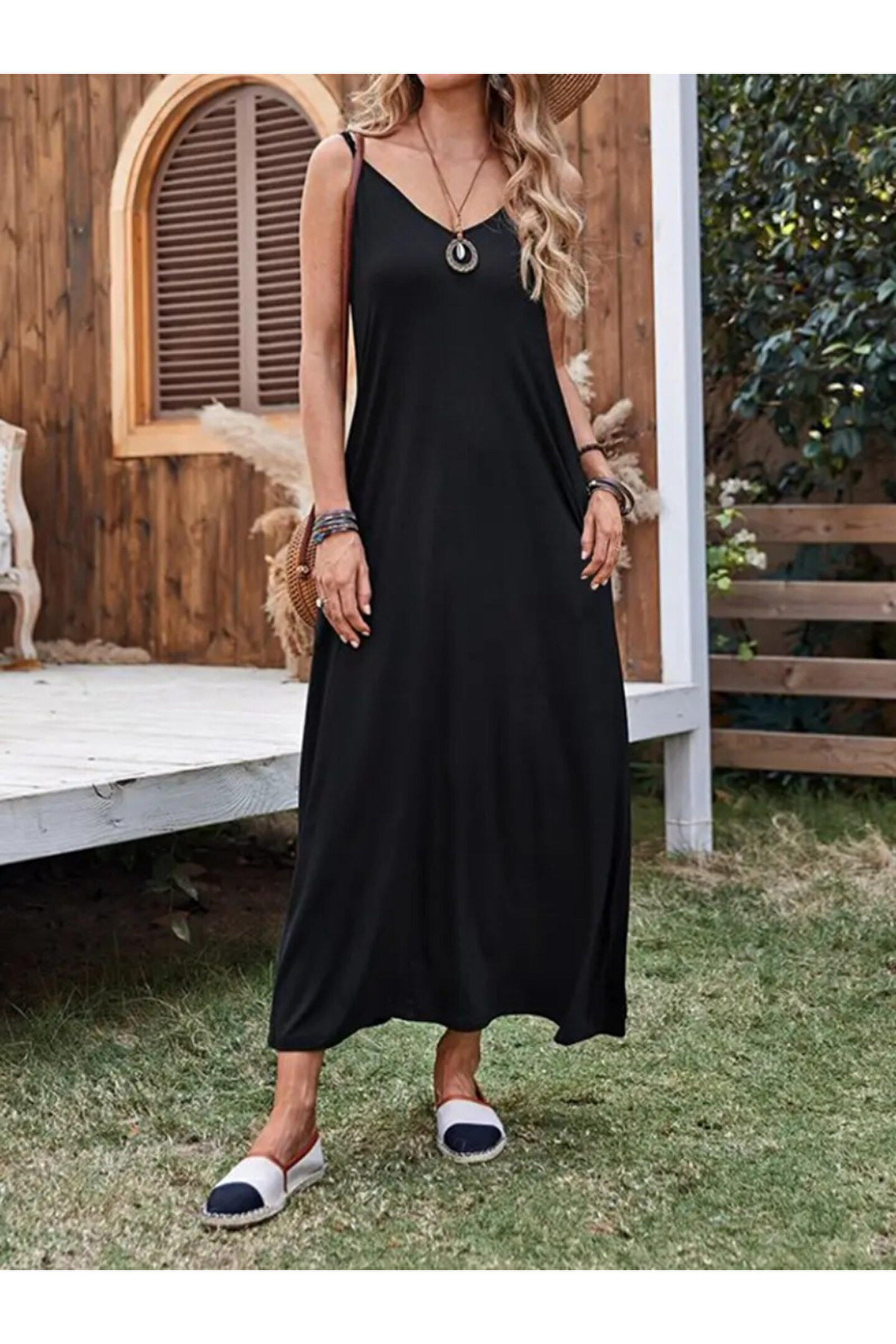 Kadın Ip Askılı Derin Geniş V Yakalı Uzun Viskon Elbise