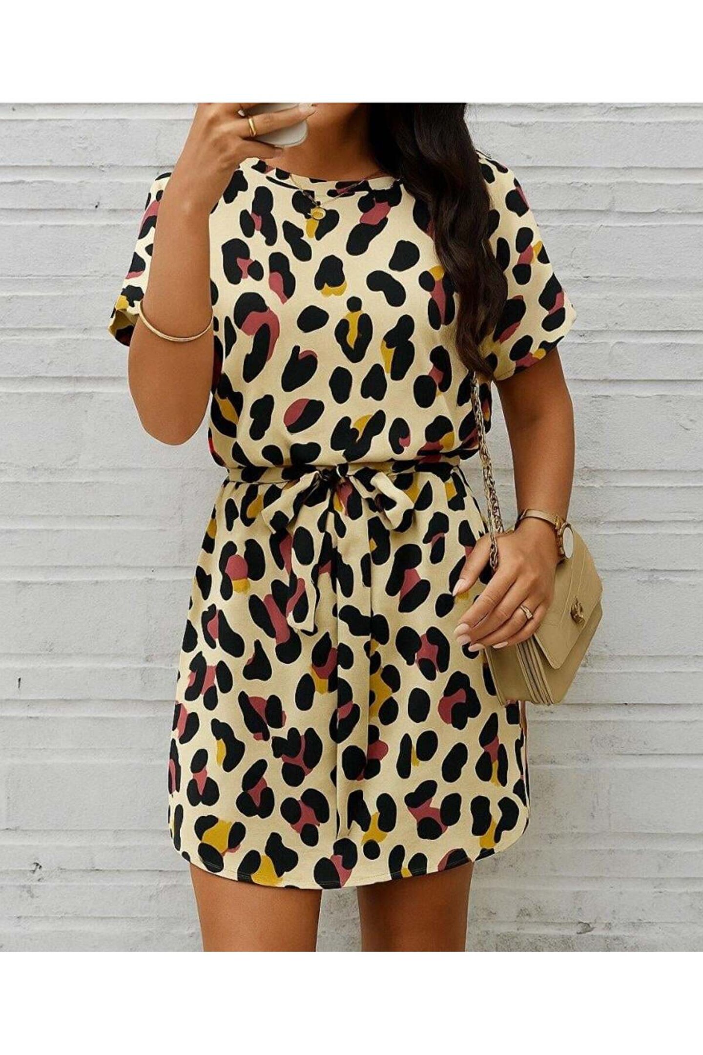 Kadın Kısa Kollu Yuvarlak Yaka Beli Kuşaklı Geometrik Desenli Süprem Elbise