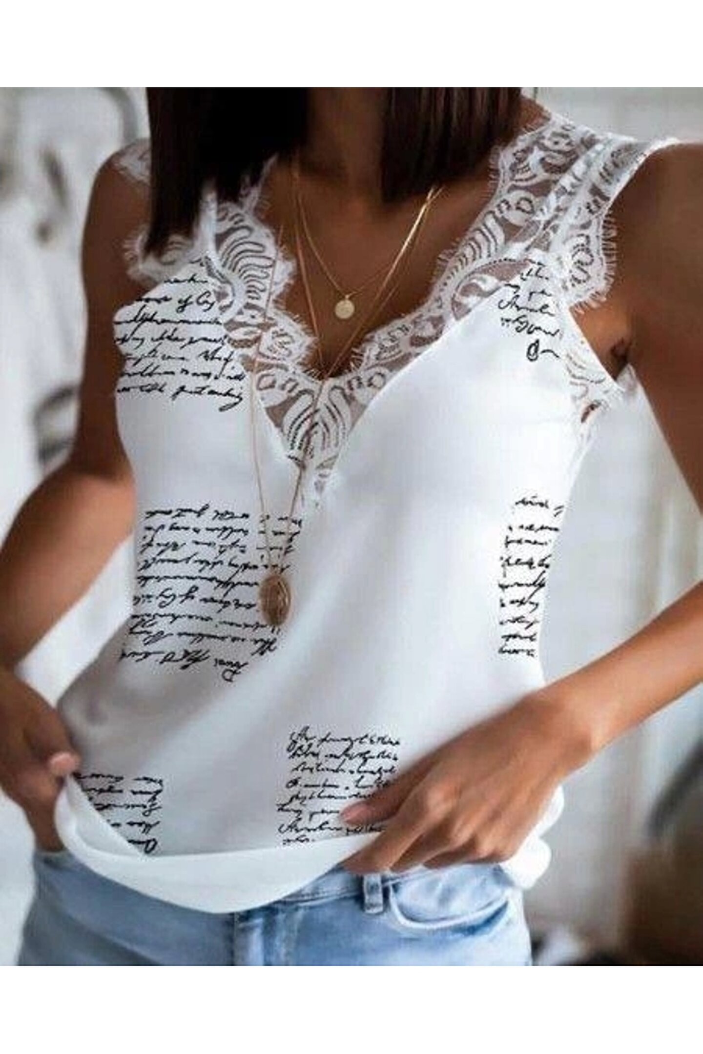 Kadın Mektup Desenli Dantel Detaylı Mikro Kumaş Bluz