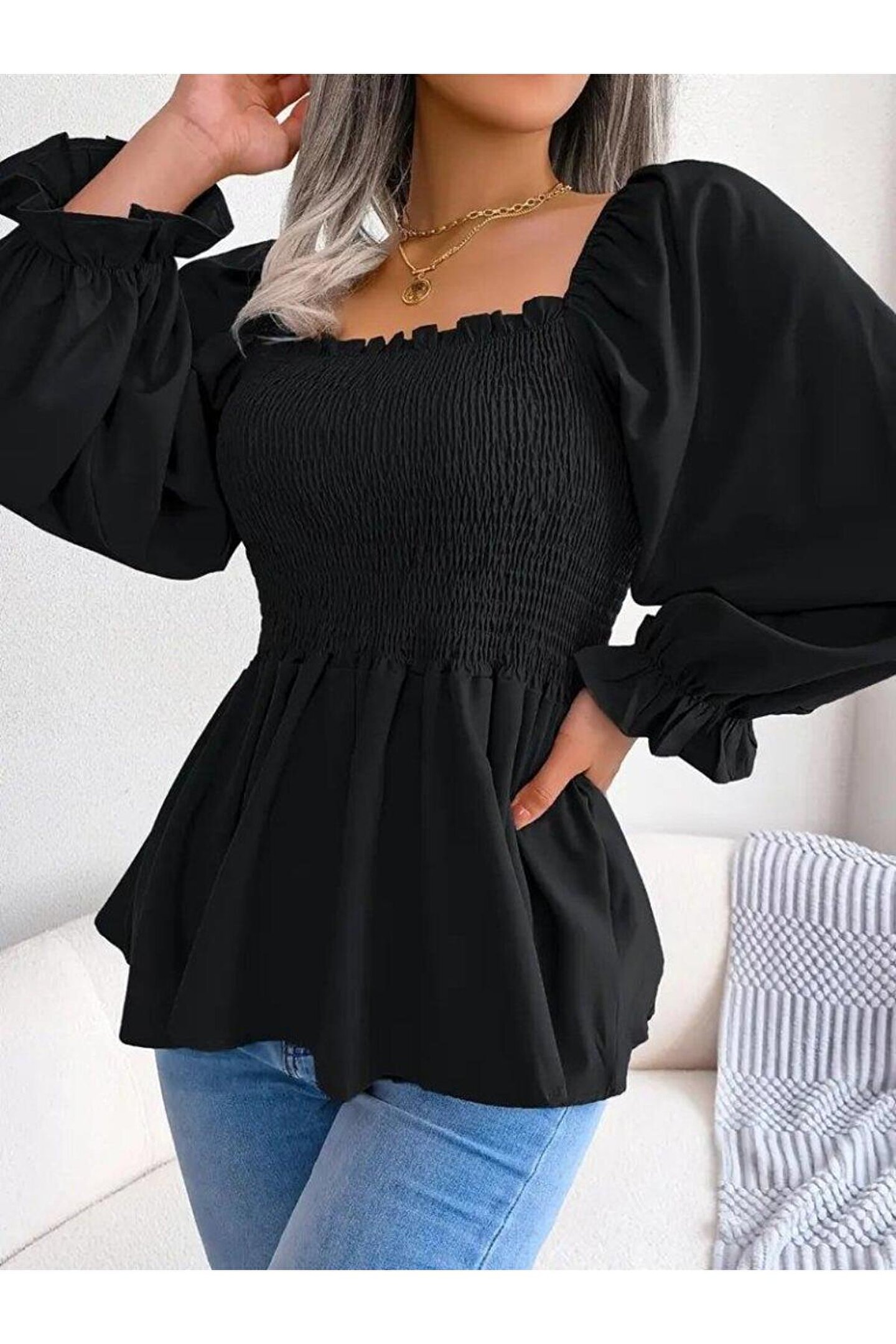- Kare yaka tasarımı ile modern ve şık bir görünüm sunar.; - Düz deseni sayesinde kolayca kombinlenebilir ve zamansız bir stil oluşturur.; - Krep dokuma tipi, yumuşak dokunuşuyla konforlu bir kullanım sağlar.; - Sürdürülebilirlik detayı ile çevre dostu bir tercih yapmanızı sağlar.; - Baskısız yüzeyiyle sade ve zarif bir görünüm elde edersiniz.; - Kapsız yapısı, rahat hareket etme özgürlüğü sunar.; - Orta kalınlıkta kumaşı mevsim geçişlerinde idealdir.; - Gipeli detaylar ile feminen ve trend bir hava katılır.; - Astarsız olması, hafifliği ve nefes alabilirliği artırır.; - Gündüzden geceye her ortamda rahatlıkla tercih edilebilir.; - Kemersiz tasarımı, vücut hatlarınıza uyum sağlayarak şık bir siluet oluşturur.; - İlkbahar / Sonbahar sezonu için idealdir; mevsim geçişlerinde rahatlıkla kullanılır.; - Glam koleksiyonuna ait bu parça, göz alıcı detaylarıyla dikkat çeker.; - Kutu yok olarak gönderilmesi, ambalaj maliyetlerini düşürerek çevreye duyarlı bir yaklaşım sergiler.; - Fashion Forward persona için tasarlanmış bu bluz, stil sahibi kadınların tercihi olacak.; - Cepsiz olması minimalist tarzı desteklerken pratiklikten ödün vermez.; - Türkiye menşei ile yerli üretim desteklenir ve kalite garantisi verir.; - Örme kumaş tipi dayanıklılığı arttırarak uzun süreli kullanım vaat eder.; - Comfort kalıbı sayesinde gün boyu rahat etmenizi sağlar.; - Kadın / Kız cinsiyetine hitap eden bu ürün her yaş grubundan yetişkinlere uygundur.; - Regular boyu ile farklı vücut tiplerine uyum sağlayarak ideal oturumu sunar.;