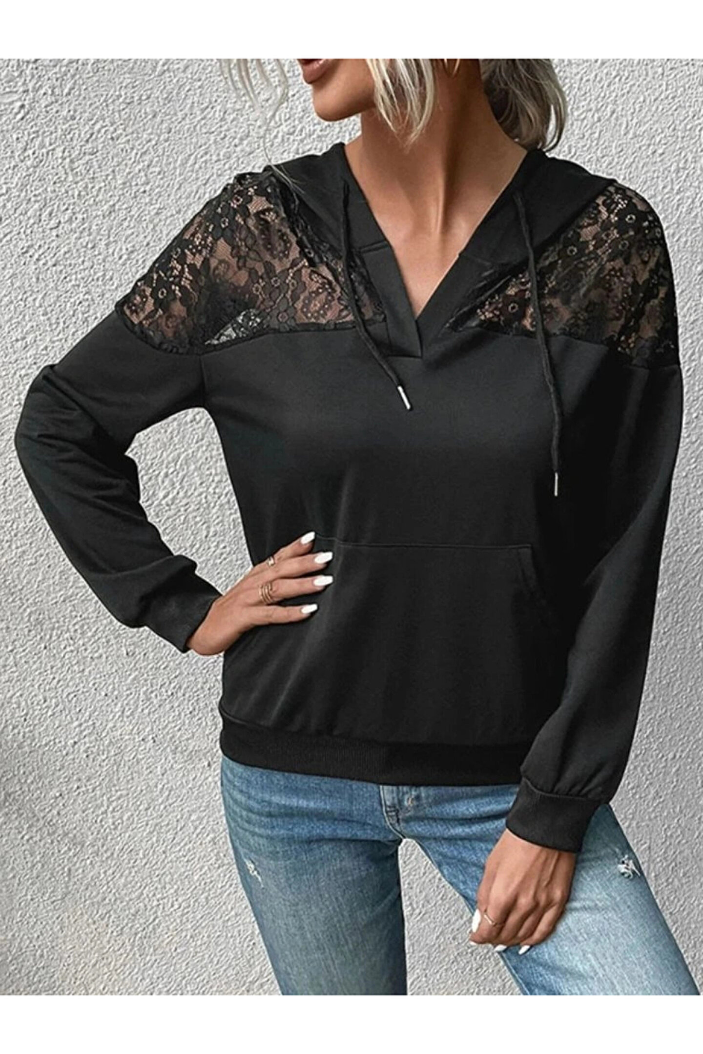 Kadın Uzun Kollu Kapşonlu Bağcıklı Dantelli Viskon Iki Iplik Bluz