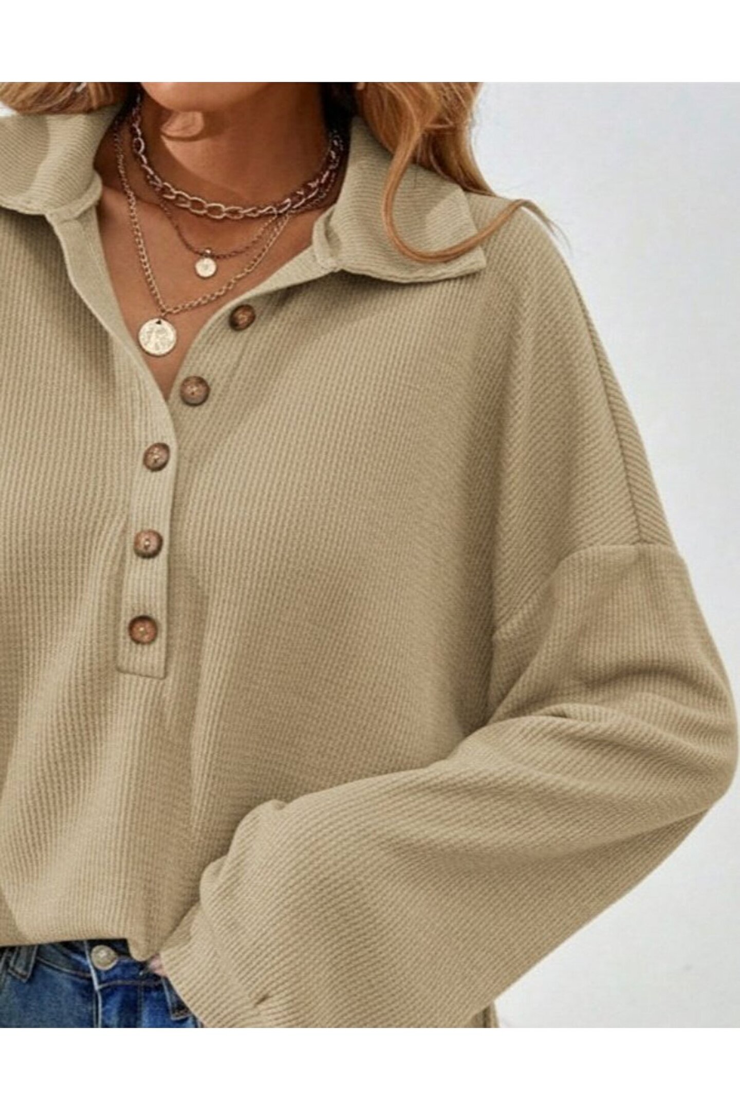 Kadın Uzun Kollu Yakalı Düğmeli Salaş Waffle Bluz