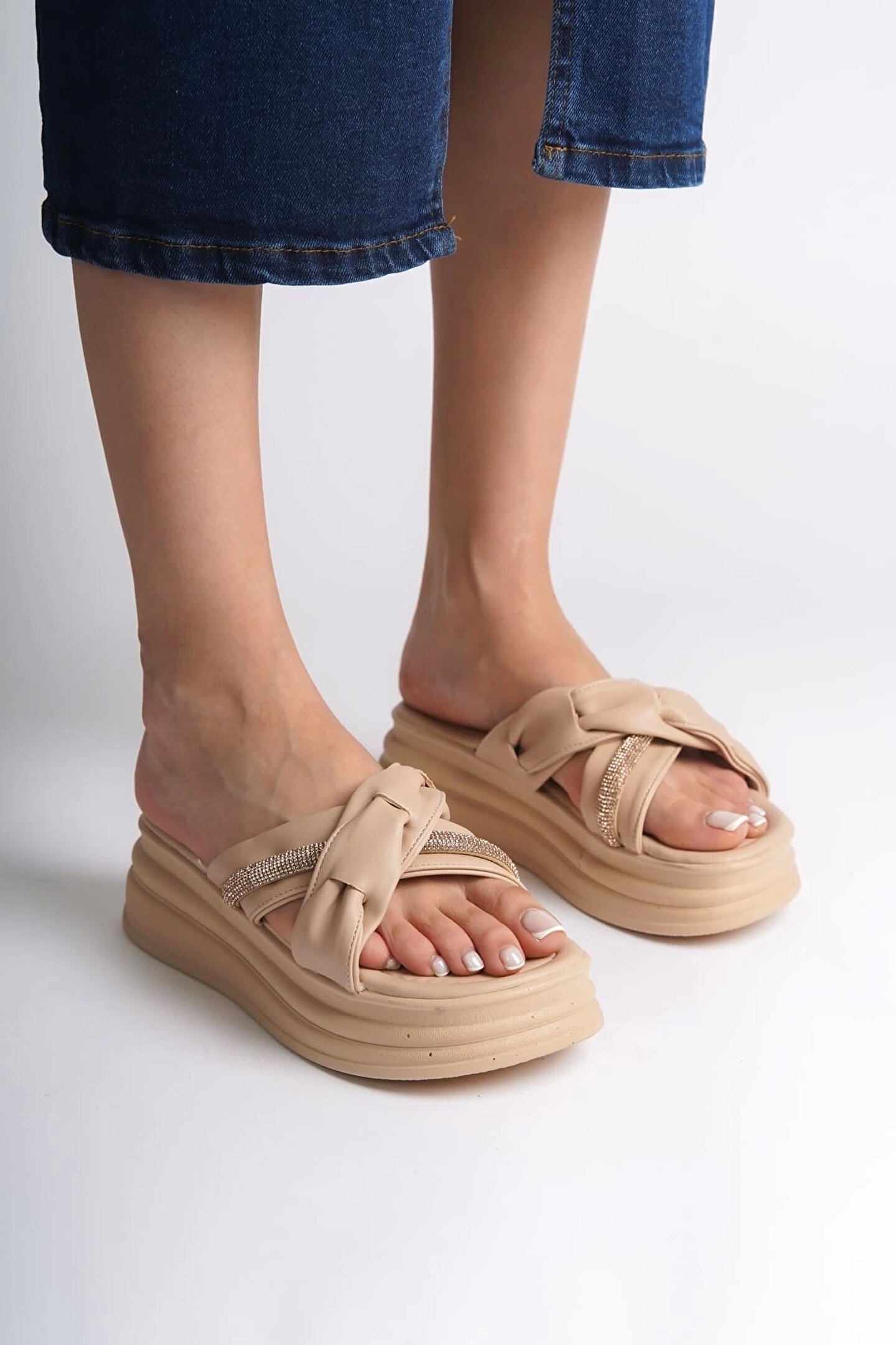 Joy Ayakkabı CLARA Düz Topuklu Kurdele Desenli Taşlı Kalın ve Ortopedik Taban Kadın Terlik CTT - Ten