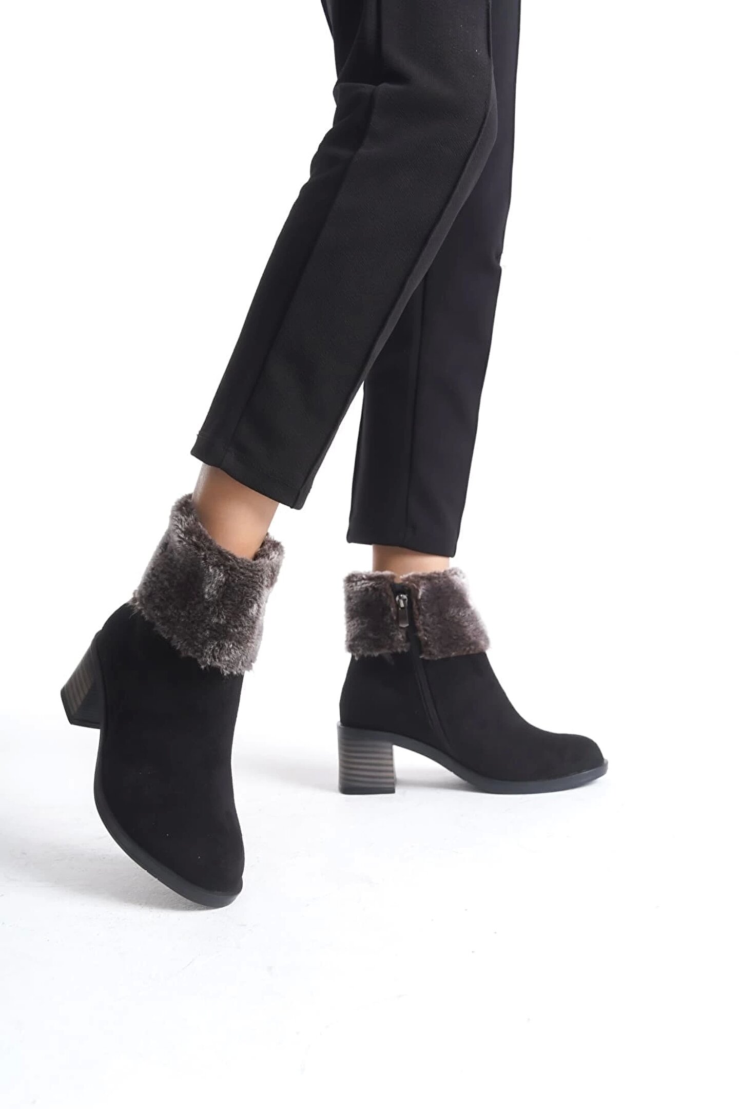 Joy Ayakkabı KATYA Fermuarlı Ortopedik Taban Topuklu Kürk Detaylı Süet Kadın Bot SST - Siyah