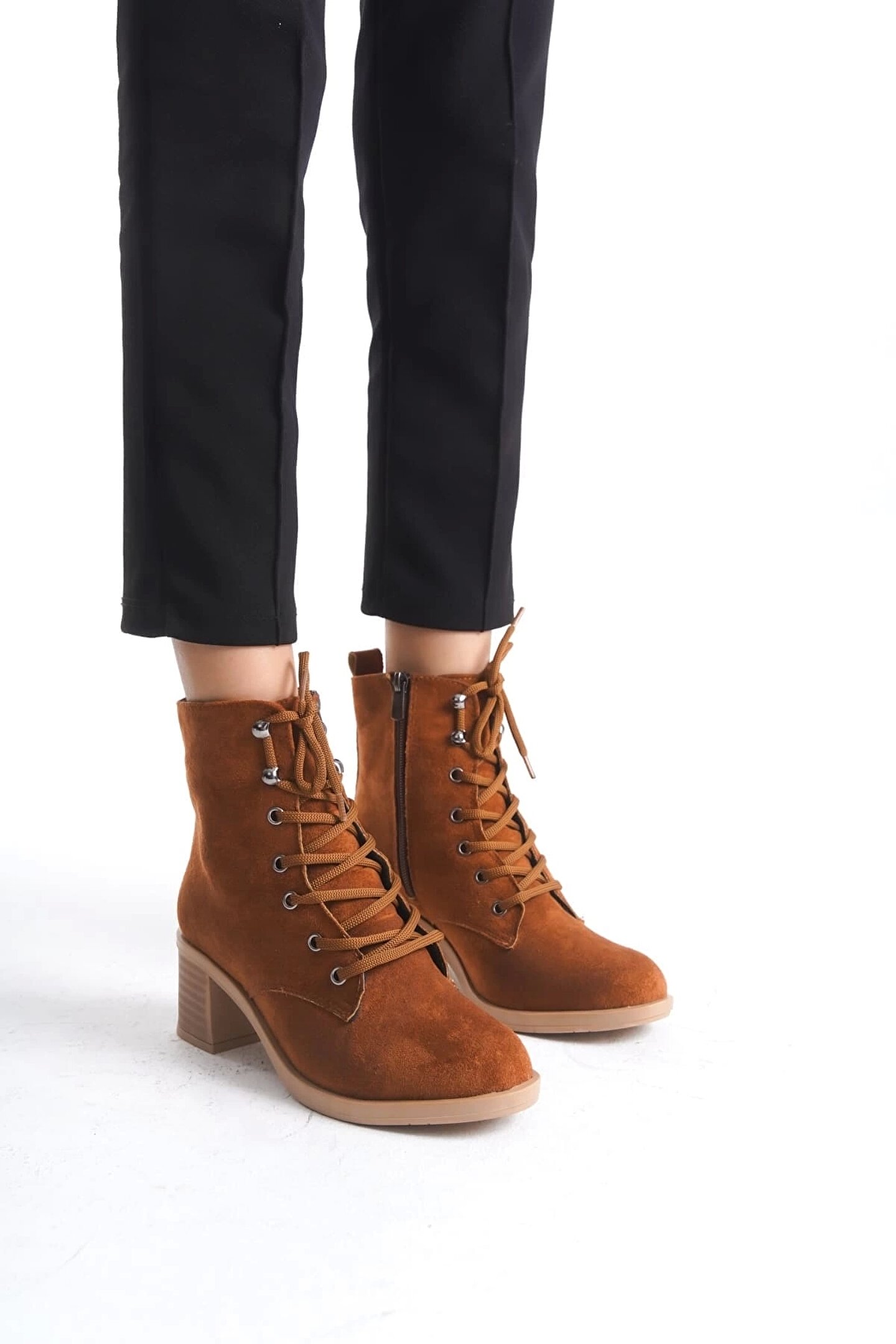 Joy Ayakkabı LENA Bağcıklı Fermuarlı Ortopedik Taban Topuklu Süet Kadın Bot - Taba