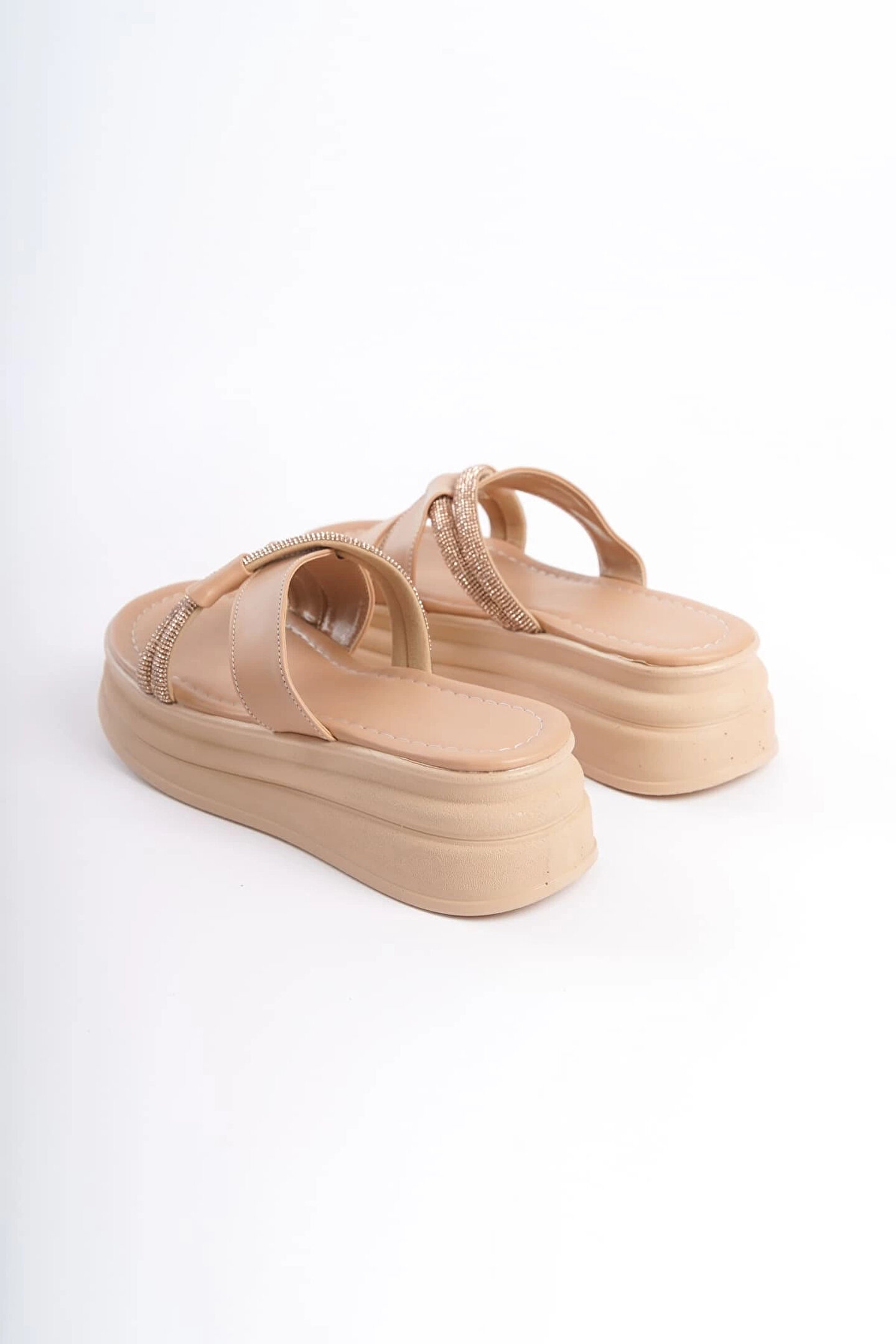 Joy Ayakkabı RUBY Düz Topuklu Taşlı Çapraz Şeritli Kalın ve Ortopedik Taban Kadın Terlik CTT - Ten