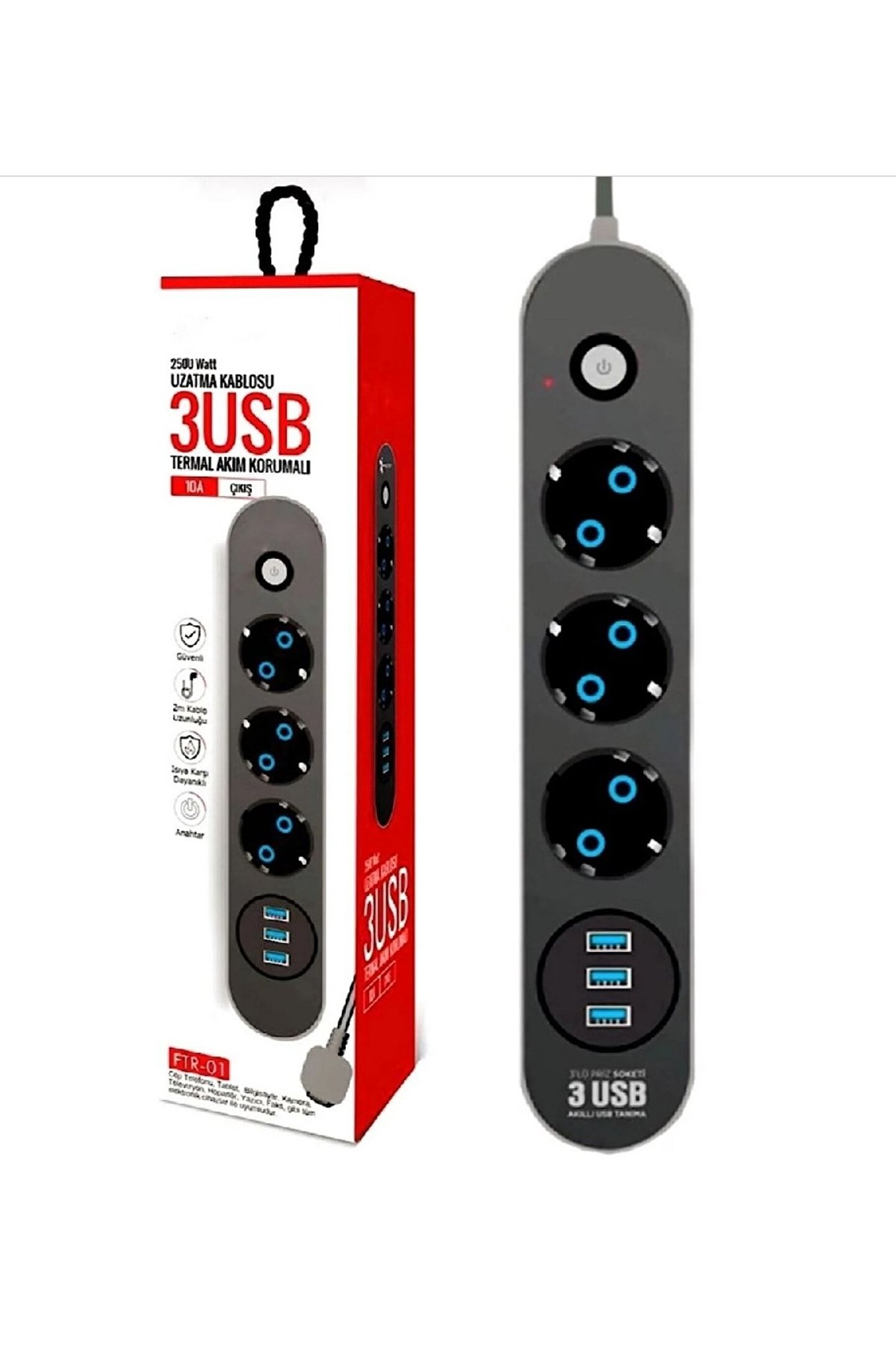 3 Soket 3 Usb Şarj Termal Akım Korumalı Priz 2 Metre Kablo Çoklu Priz 3 lü Priz