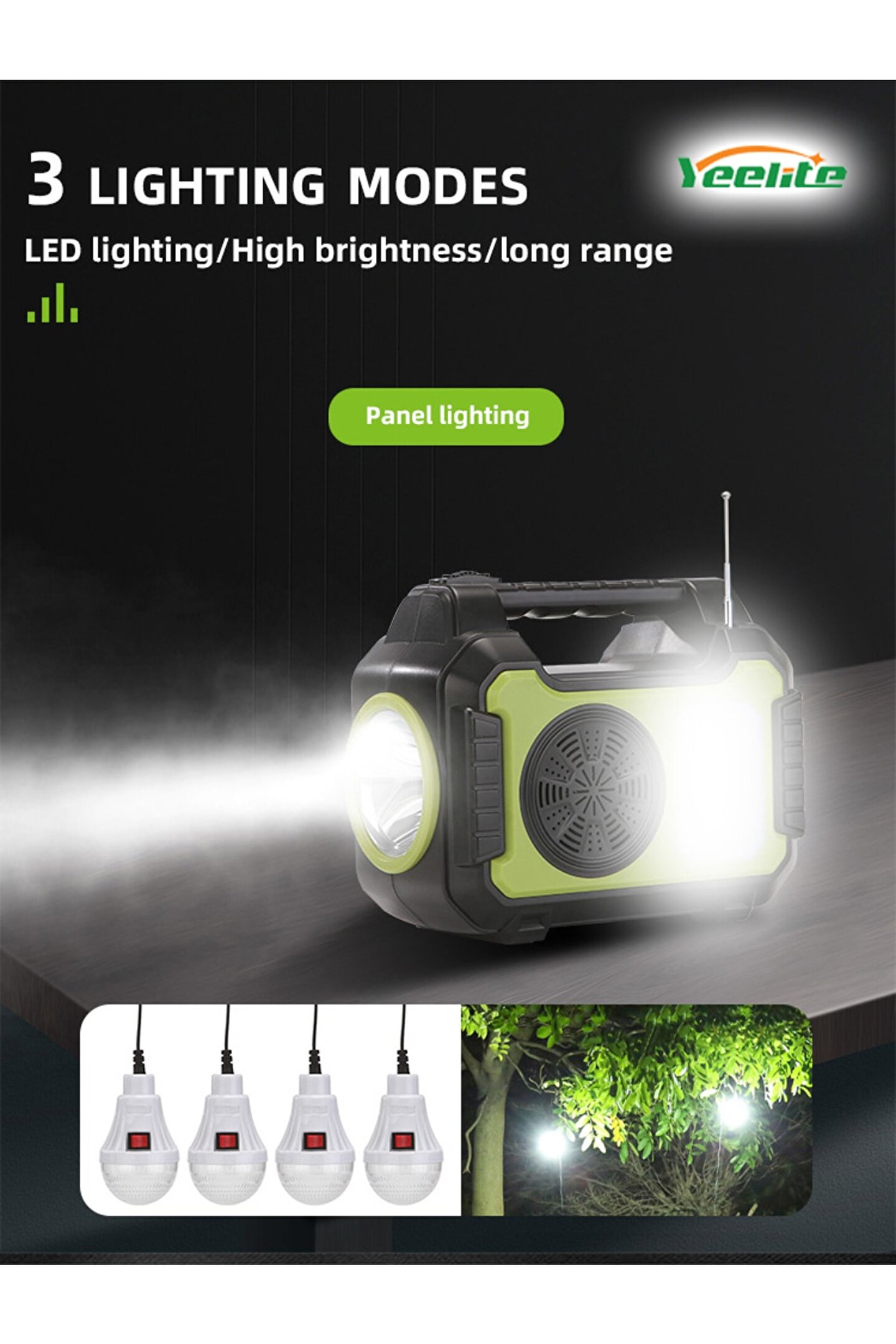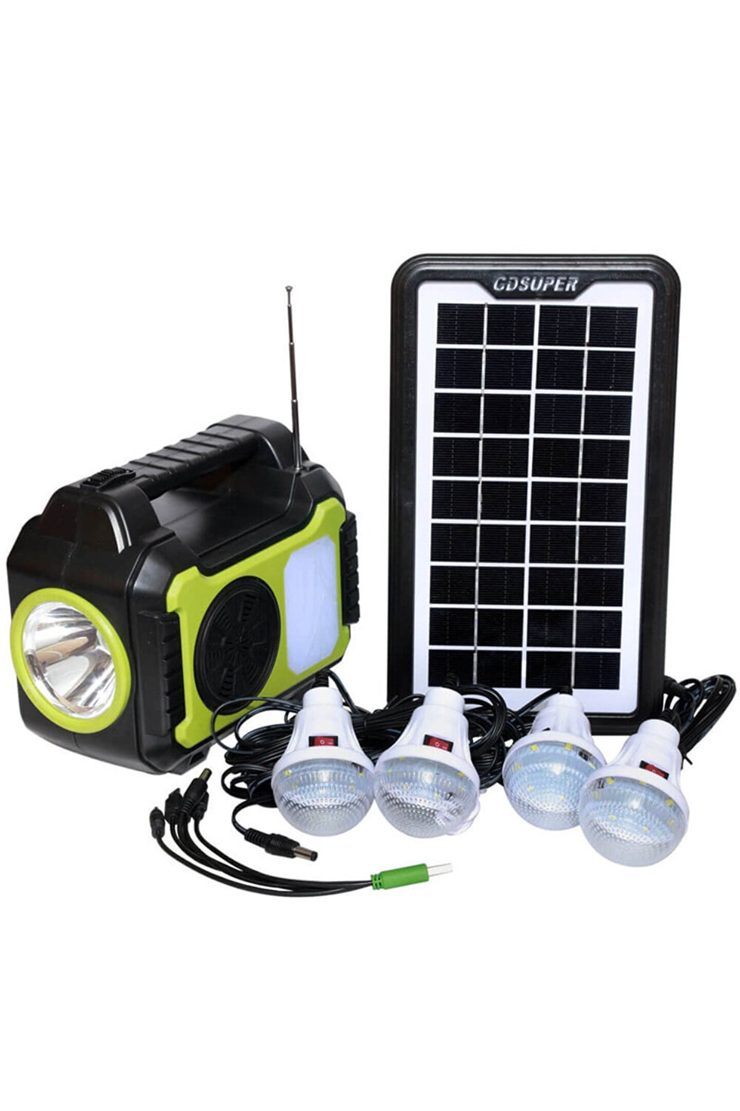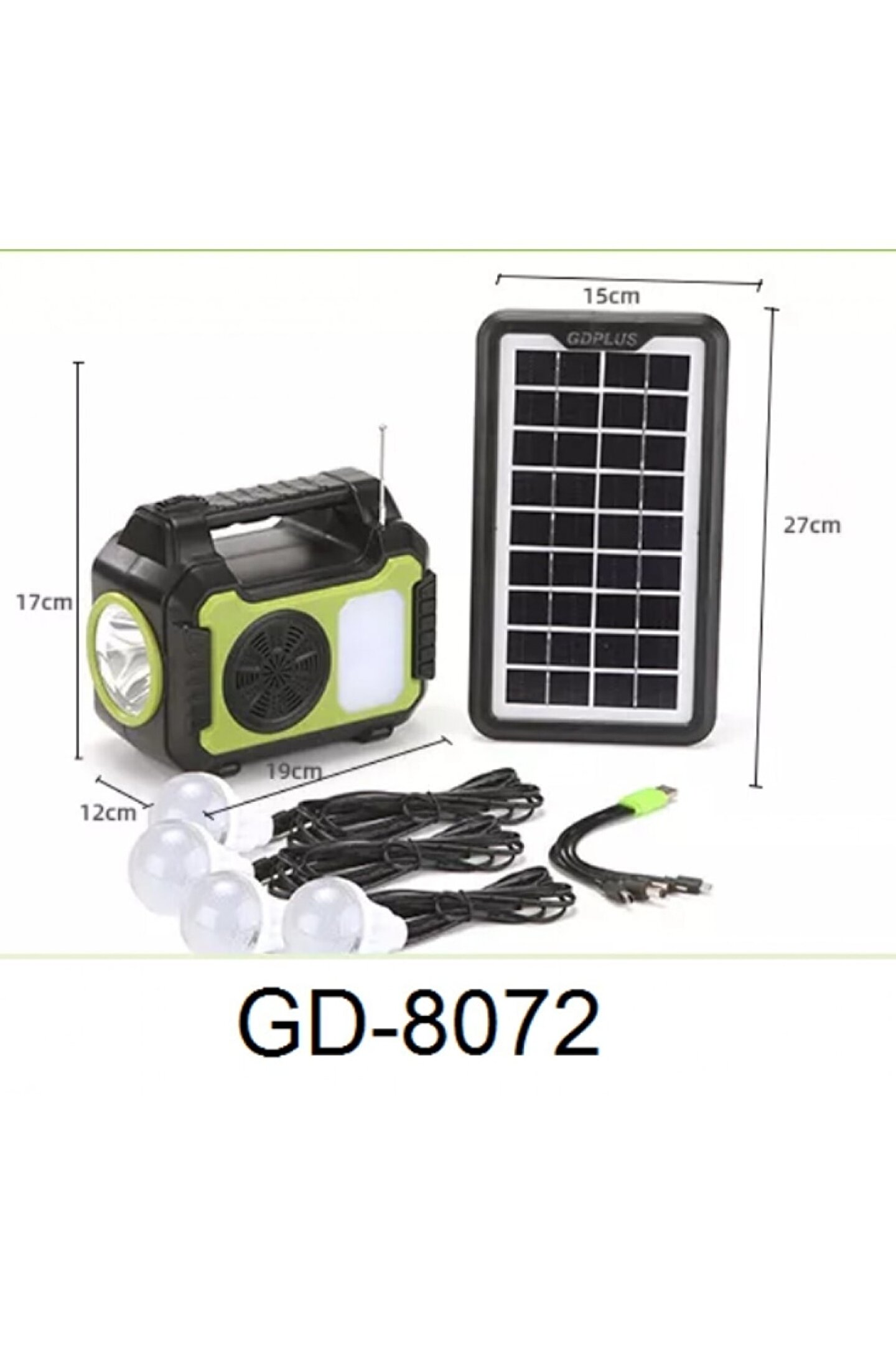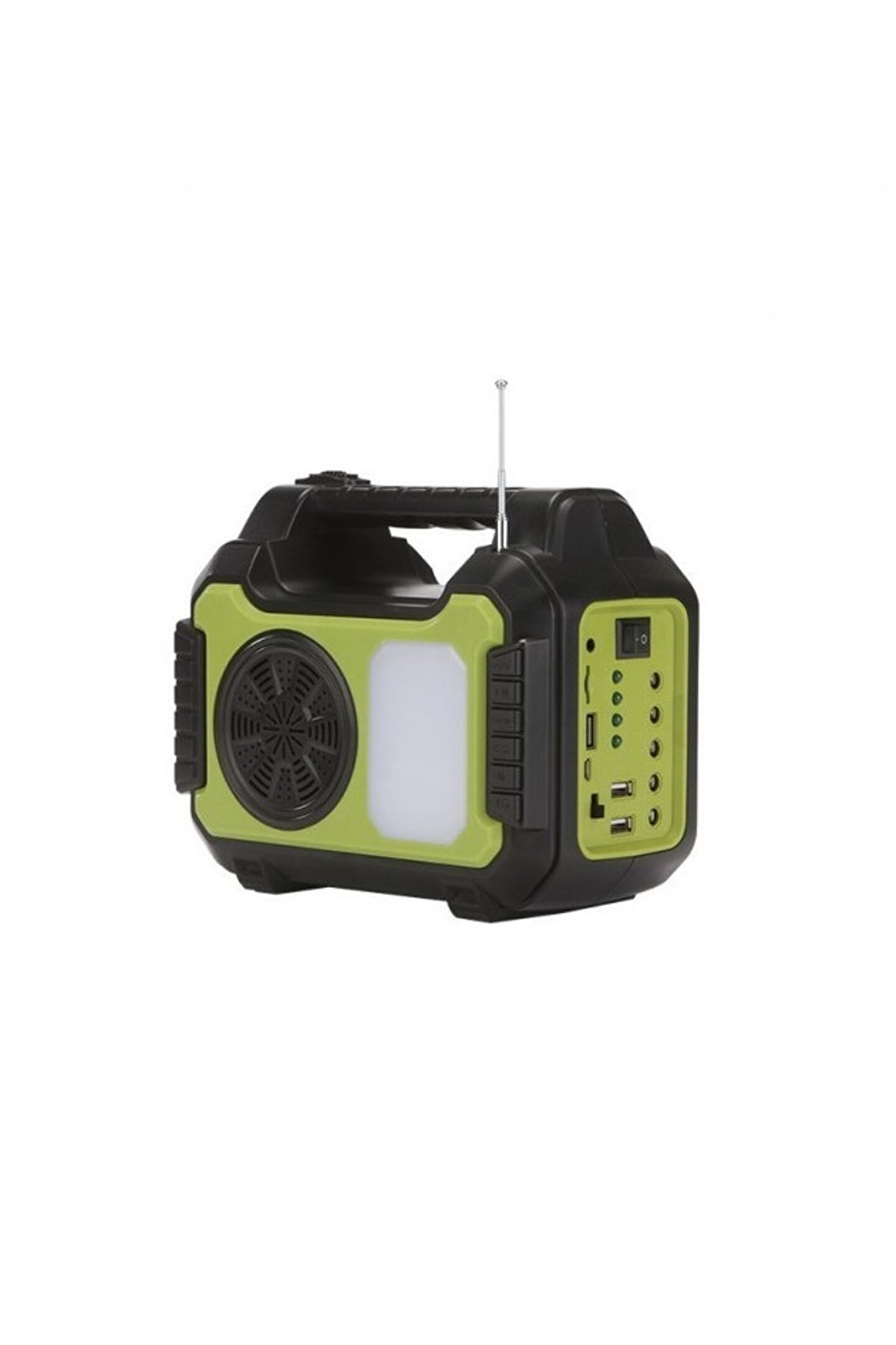 Solar aydınlatma ve şarj sistemi; Sistemde güneş paneli, LED el feneri, her biri ayrı açma/kapama anahtarlı 4 adet LED lamba, birden fazla cihazı şarj etmek için USB kablo demeti ve FM radyo bulunmaktadır; TF kartı destekler; Bluetooth 5; 0 bağlantısı; Açık hava etkinlikleri veya acil durumlar için idealdir; Mükemmel aydınlatma otonomisi ve pil doluluk göstergesi; Güneş veya elektrik tarafından şarj edilir; LED lamba kablo uzunluğu: 4 m; Güneş paneli: 6V 3; 5W; Güneş paneli boyutu: 27x15x1; 5cm; El feneri boyutu: 19x17x12cm; Pil kapasitesi: 10000 mAh; Şarj süresi: 8; 10 saat; 4 ADET LAMBA İLE 15; 20 SAAT AYDINLATMA 1 ADET LAMBA İLE 60; 80 SAAT AYDINLATMA SD KART VE USB GİRİŞİ FM RADYO 2 ADET 5V USB ÇIKIŞI;
