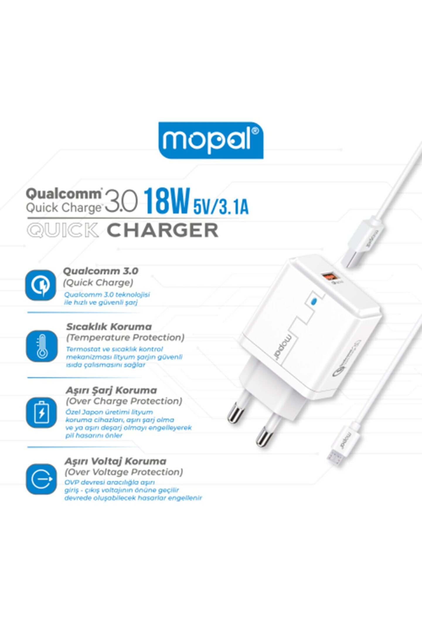 Mopal mikro USB şarj başlığı ve data kablosu, 5V 3,1A 18W güç kapasitesiyle hızlı ve etkili bir şarj deneyimi sunar; Qualcomm 3; 0 Quick Charge teknolojisi sayesinde cihazlarınızı daha hızlı şarj edebilir ve enerji tasarrufu sağlayabilirsiniz; İthalatçı garantisi altında olan bu ürün, satın alma sonrasında da güvenle kullanabileceğiniz anlamına gelir; Belirtilmemiş garanti süresi ile, ürününüzün uzun ömürlü kullanımını garanti altına alırsınız;