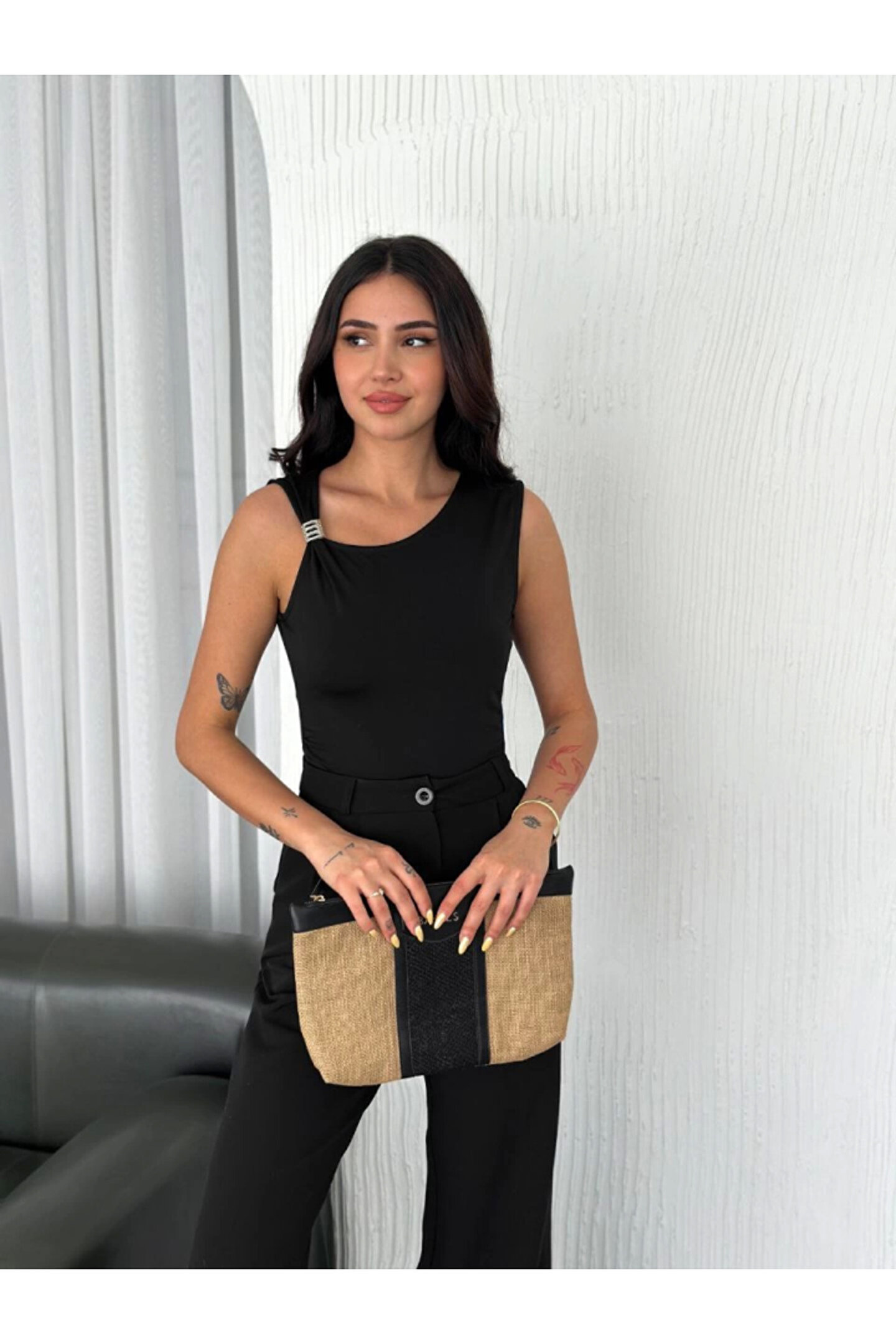 Osy Modal Yumuşak Dokulu Kumaş Bisiklet Yaka Sıfır Kol Bluz Omuz Toka Aksesuar Detaylı - Siyah