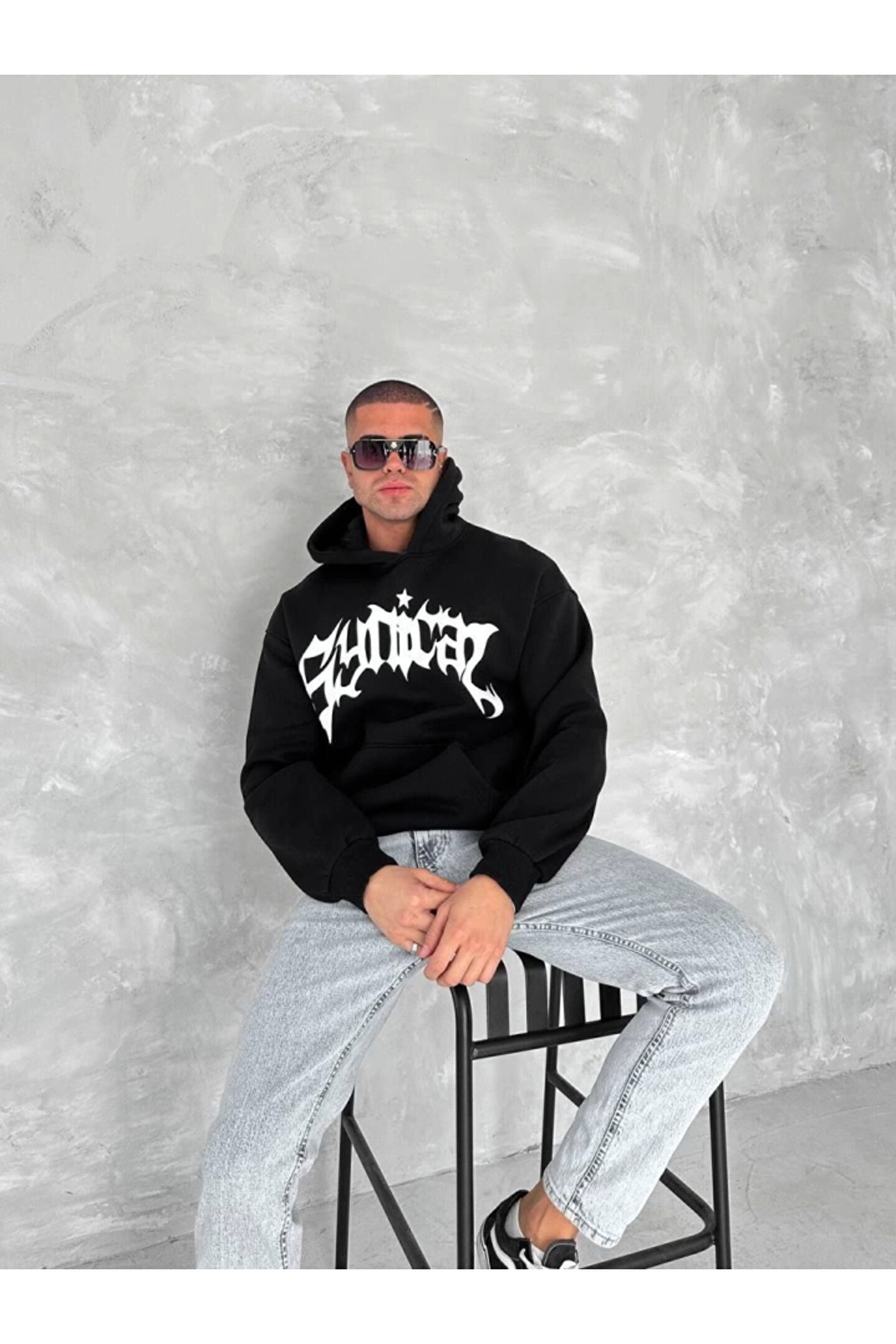 Unisex Üç İplik Kapşonlu Baskılı SweatShirt - Siyah