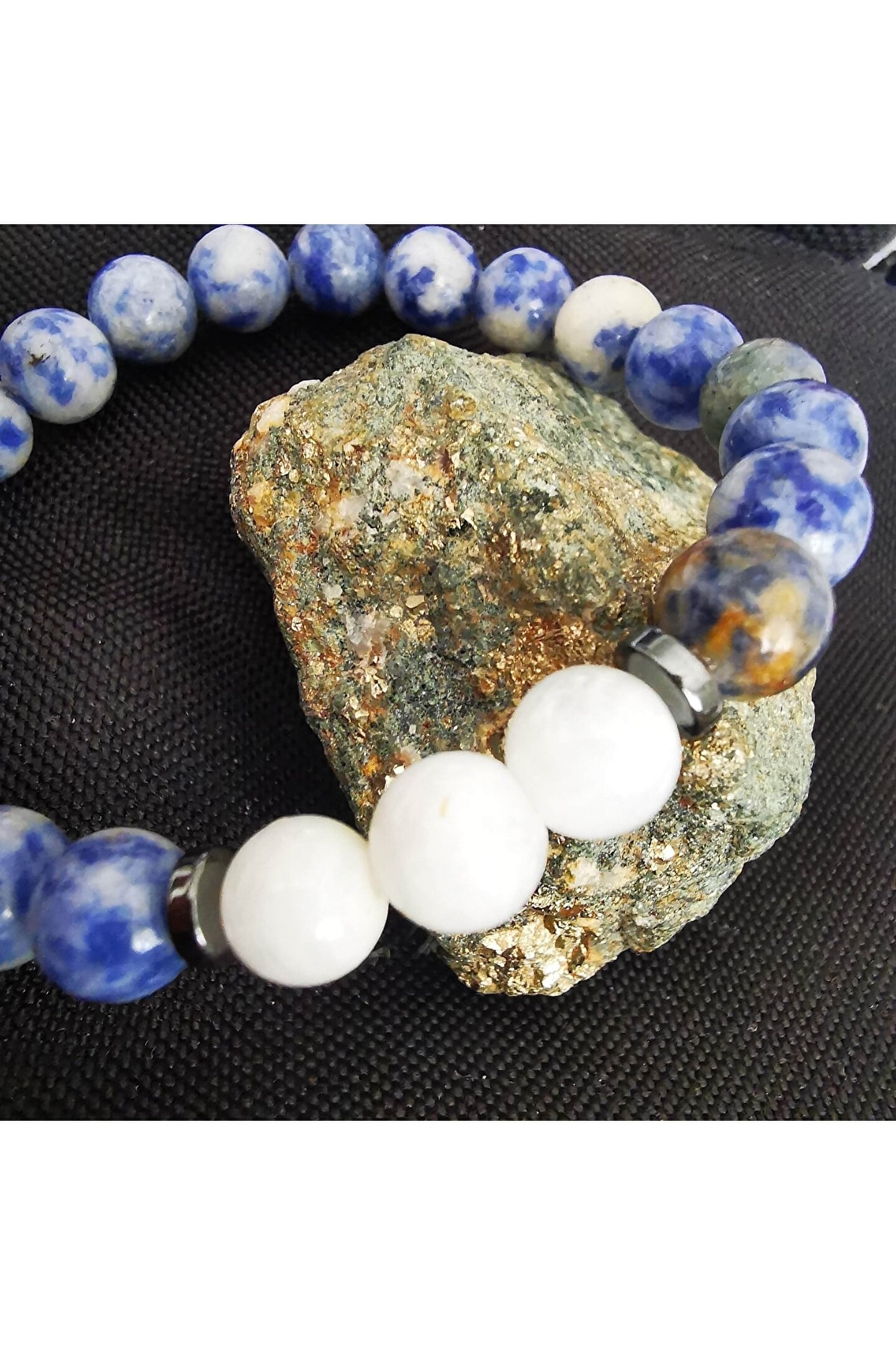 - Doğal taş kullanımı sayesinde her bileklik benzersiz ve otantik bir görünüm sunar; - Aytaşı ve sodalit gibi değerli taşların birleşimi, bilekliğe zarif bir parlaklık kazandırır; - 8mm boyutundaki taşlar, bileklikte hem şıklığı hem de rahatlığı bir arada sunar; - Doğal taşların renk ve desen farklılıkları, her bir bilekliğin kendine özgü bir karaktere sahip olmasını sağlar;