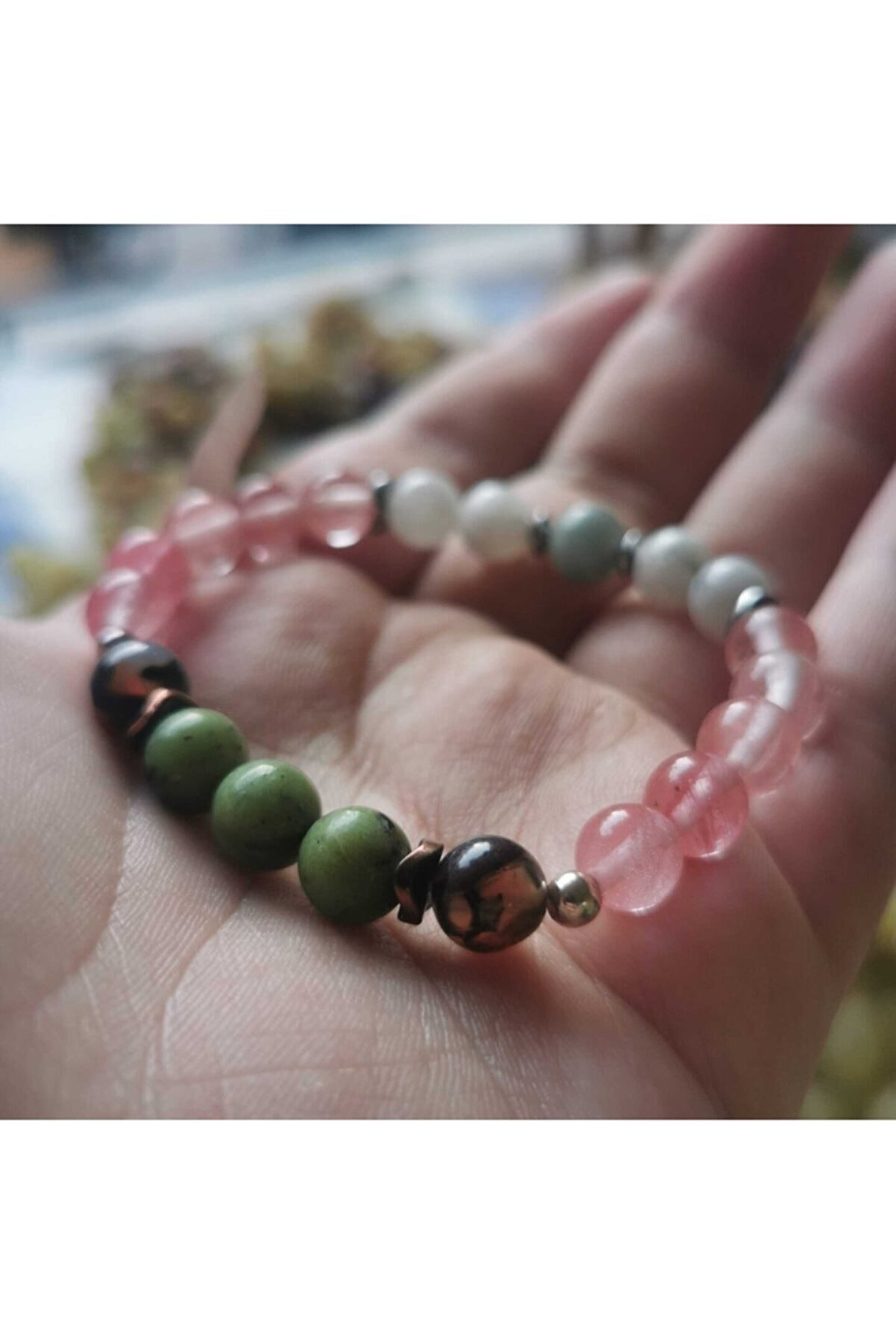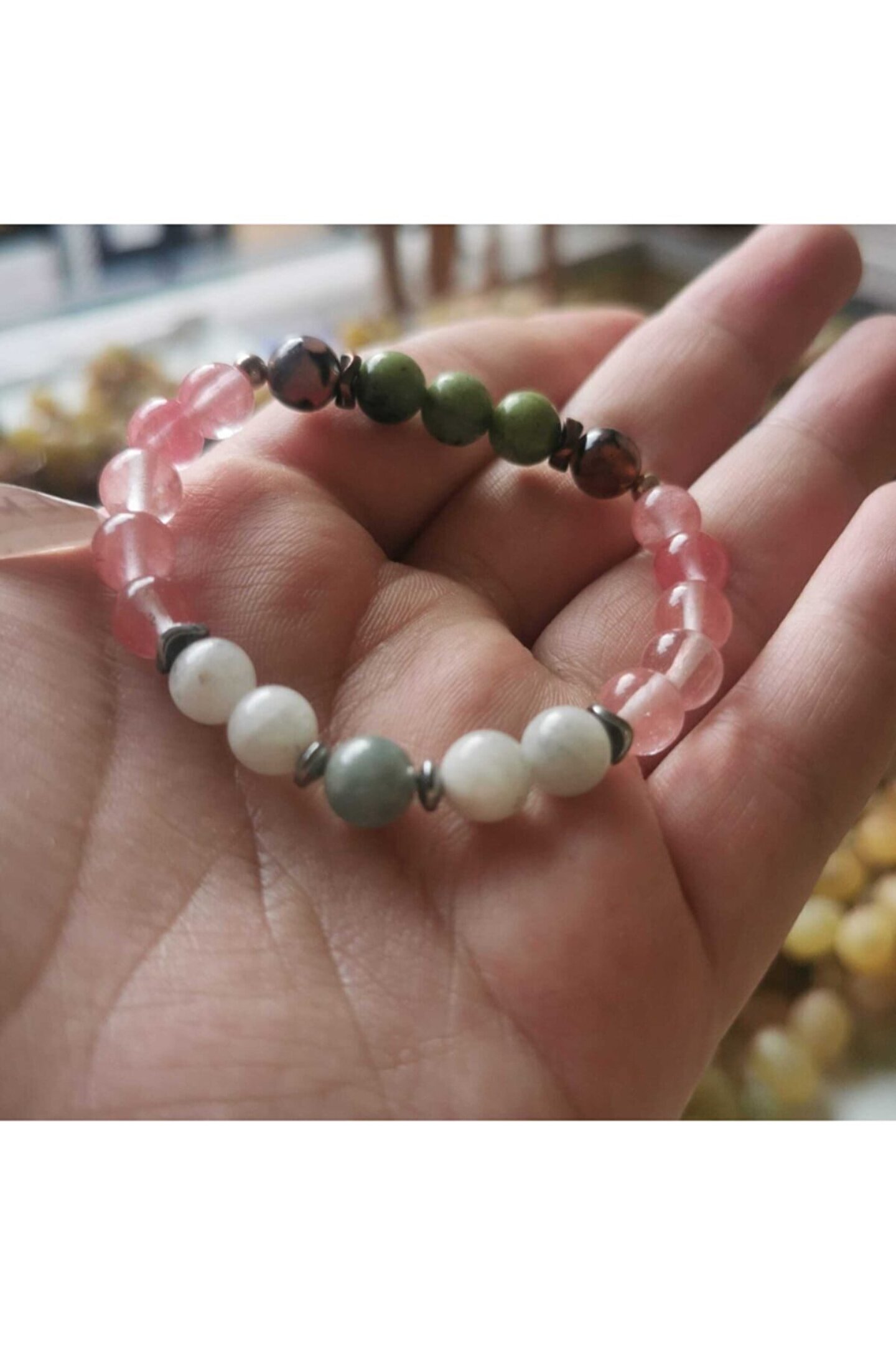 KAM Doğal Taş Takı ; YENGEÇ Burcu %100 Doğal Taş Bileklik YENGEÇ Burcu Bilekliği, YENGEÇ burcunun özellikleri dikkate alınarak YENGEÇ burcuna özel olarak seçilmiş taşlar ile oluşturulmuştur ; ÜRÜNLER GÖNDERİLMEDEN ÖNCE SİRKELİ ve SAF SU İÇERİSİNDE BEKLETİLMİŞTİR. ; %100 doğal taşlar ve doğal malzemeler kullanılarak özel olarak üretilmiştir. ; YENGEÇ Burcu Taşları: Aytaşı 4, Gül Kuvars 10, Akik 2, Yakut 1, Yeşim 3 adet. ; Ürünlerimizin tamamı %100 doğal taşlar ve doğal malzemeler kullanılarak üretilmiştir. (Plastik, tahta, silikon boncuklar kesinlikle kullanılmamıştır.) ;