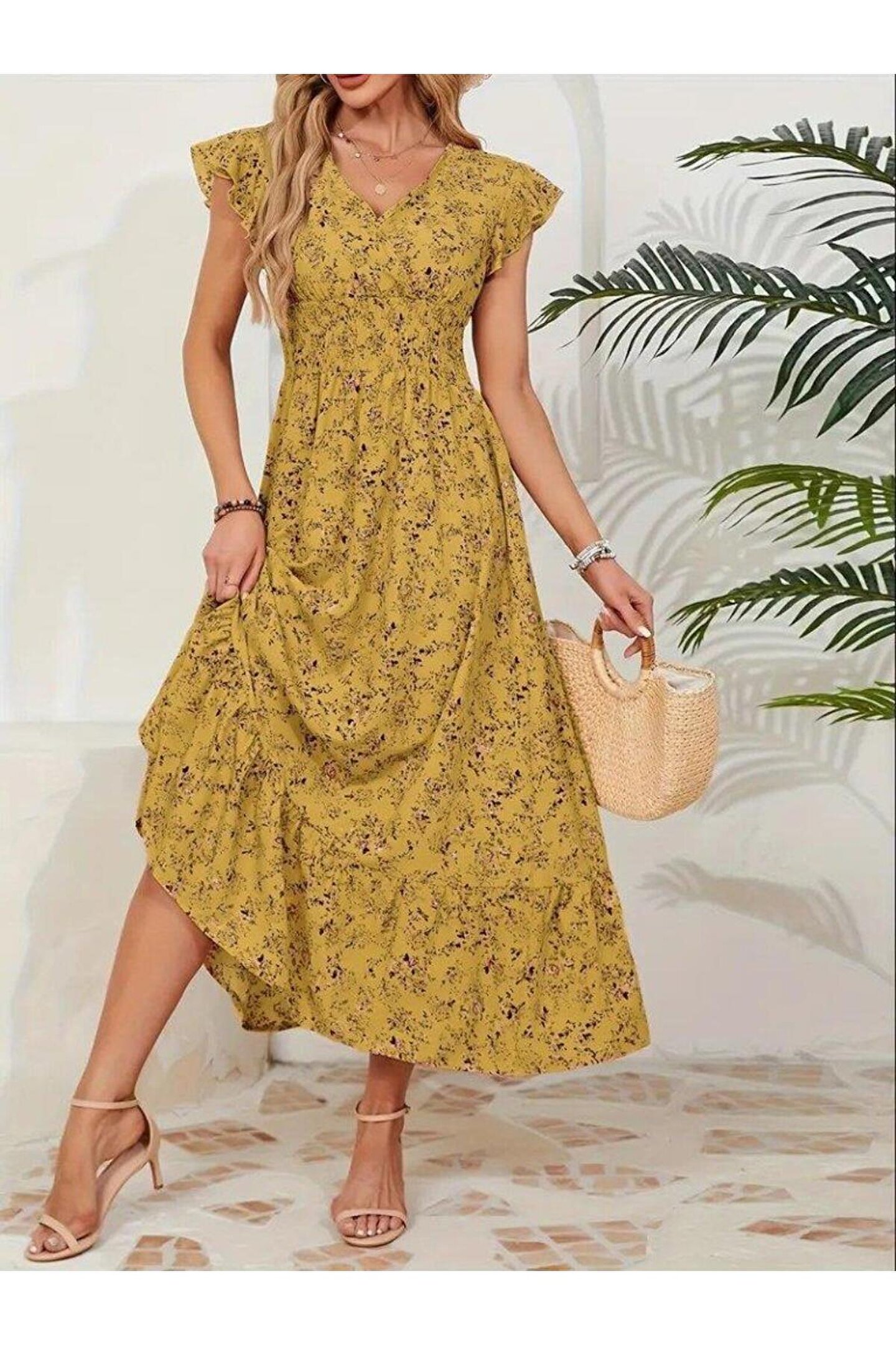 Kadın Kısa Kollu Kruvaze Yaka Beli Lastikli çiçek Desenli Elbise