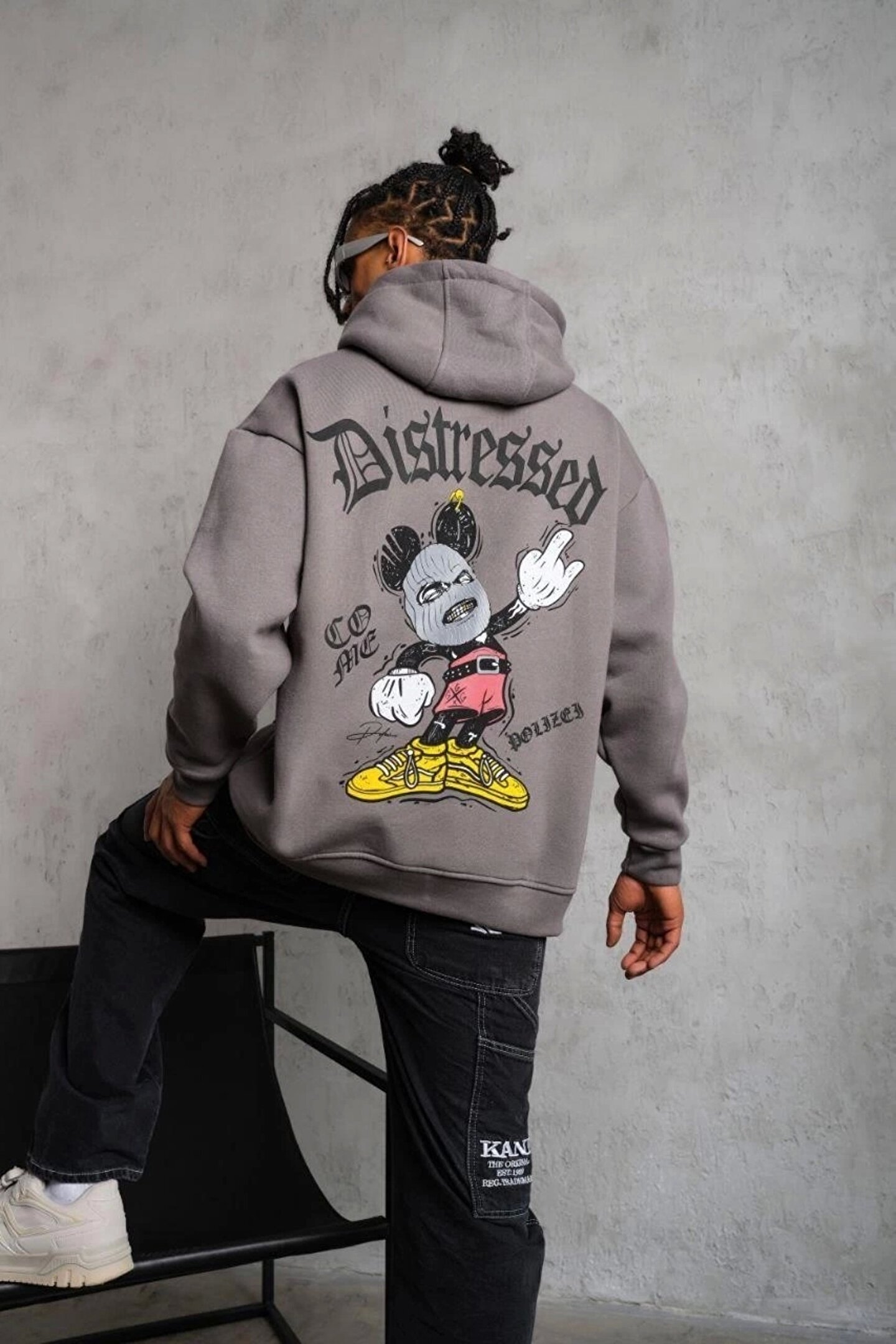 Erkek Üç İplik Baskılı Kapüşonlu Sweat - Gri
