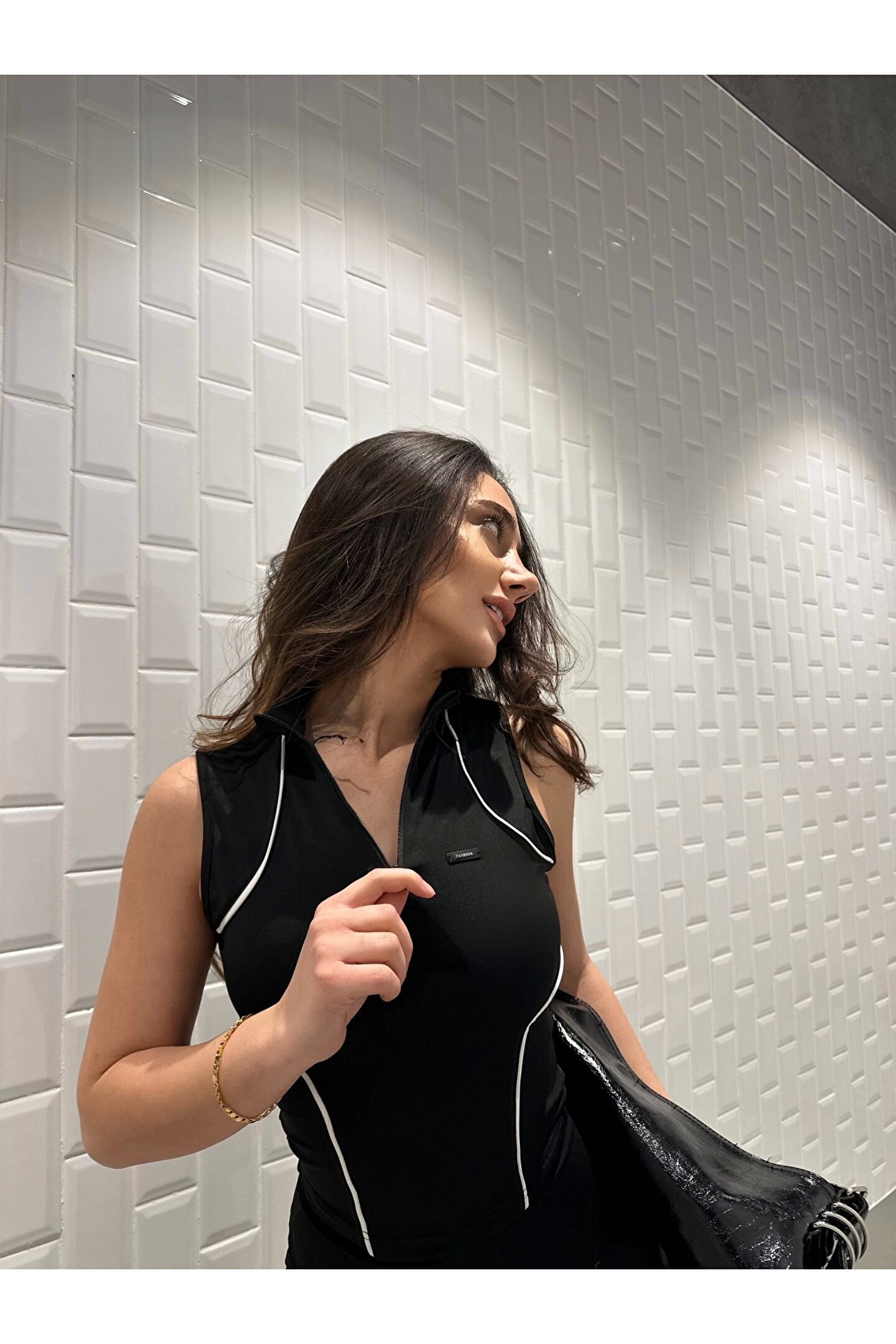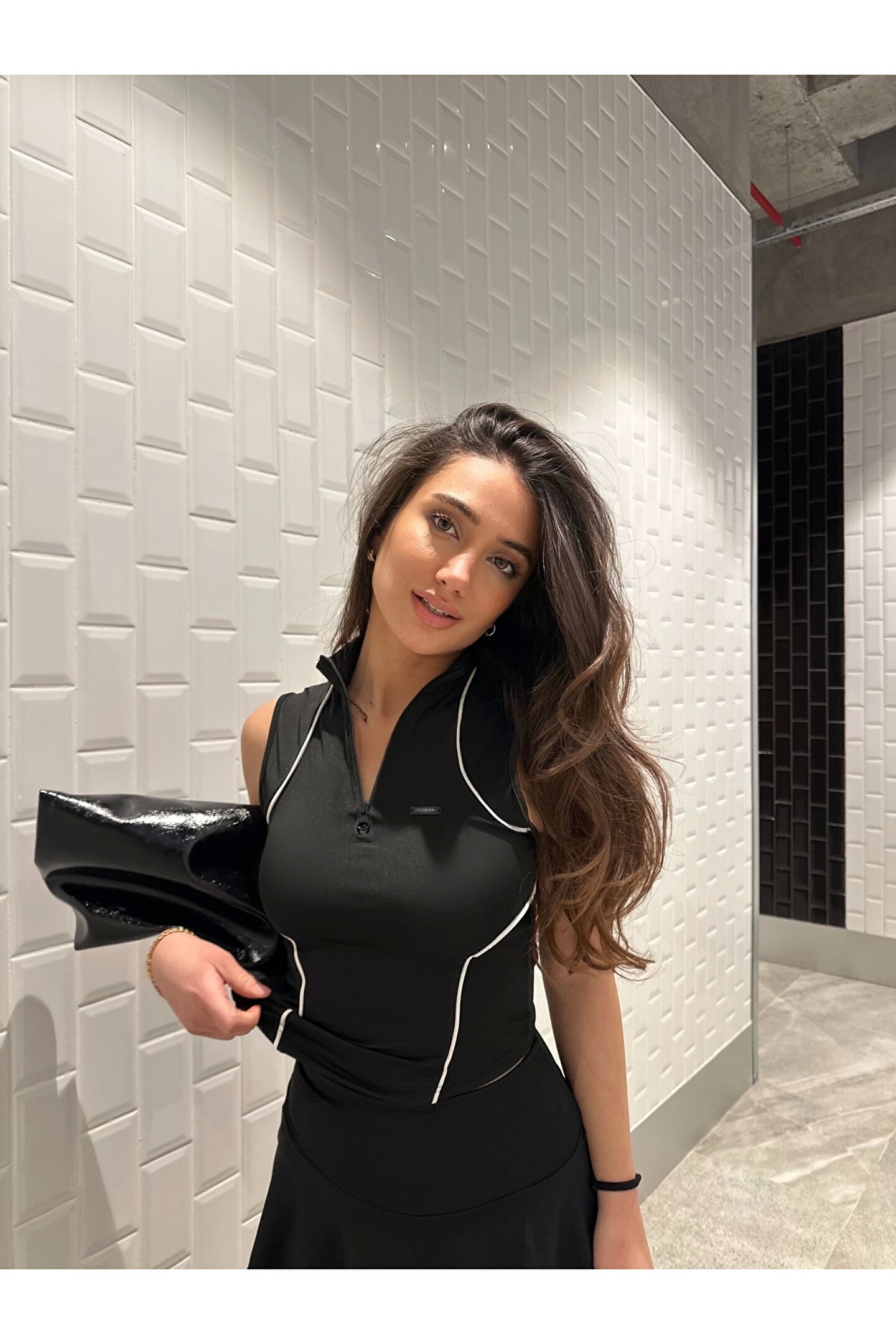 KarşıVitrin Siyah Fermuarlı Bilyeli Bluz