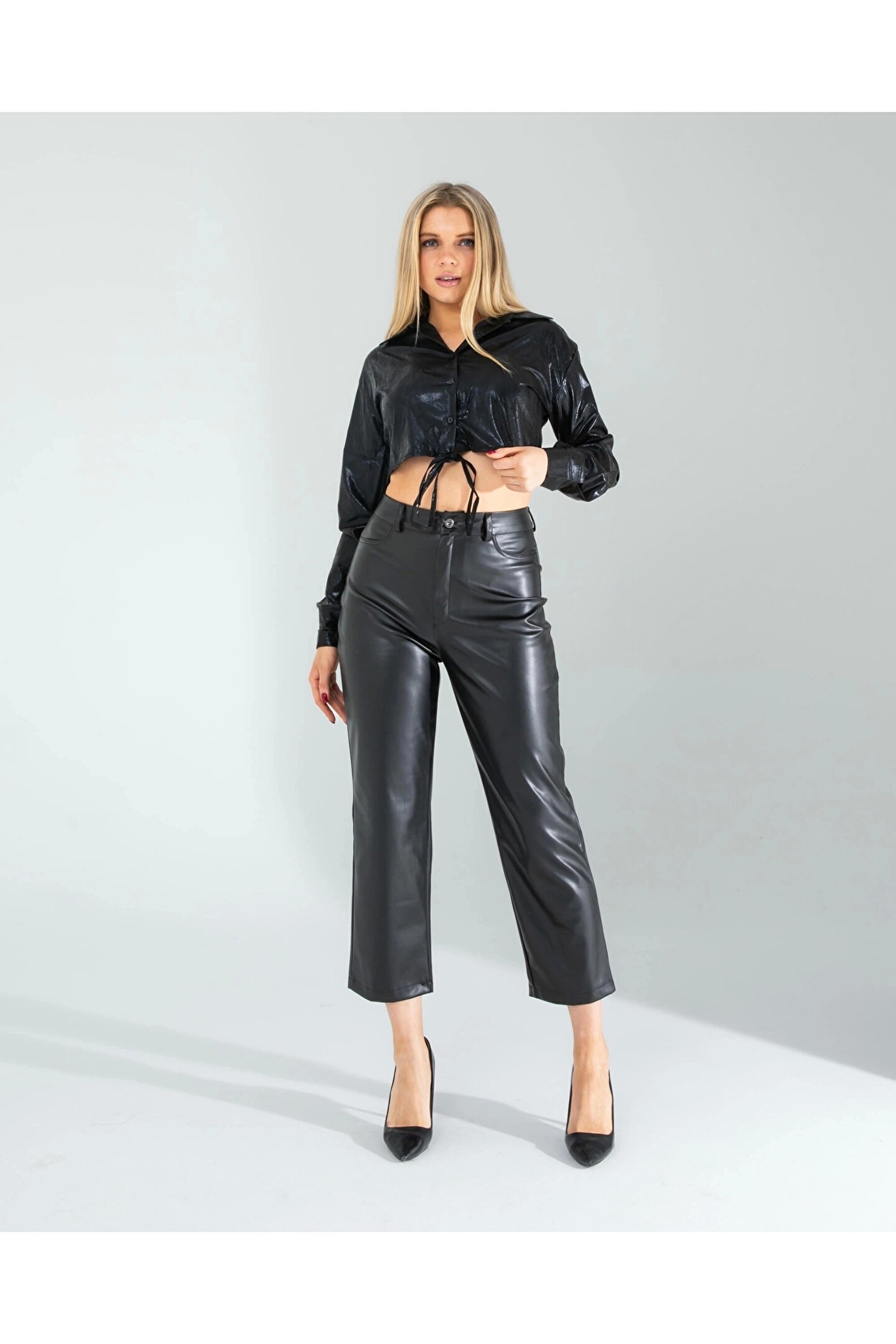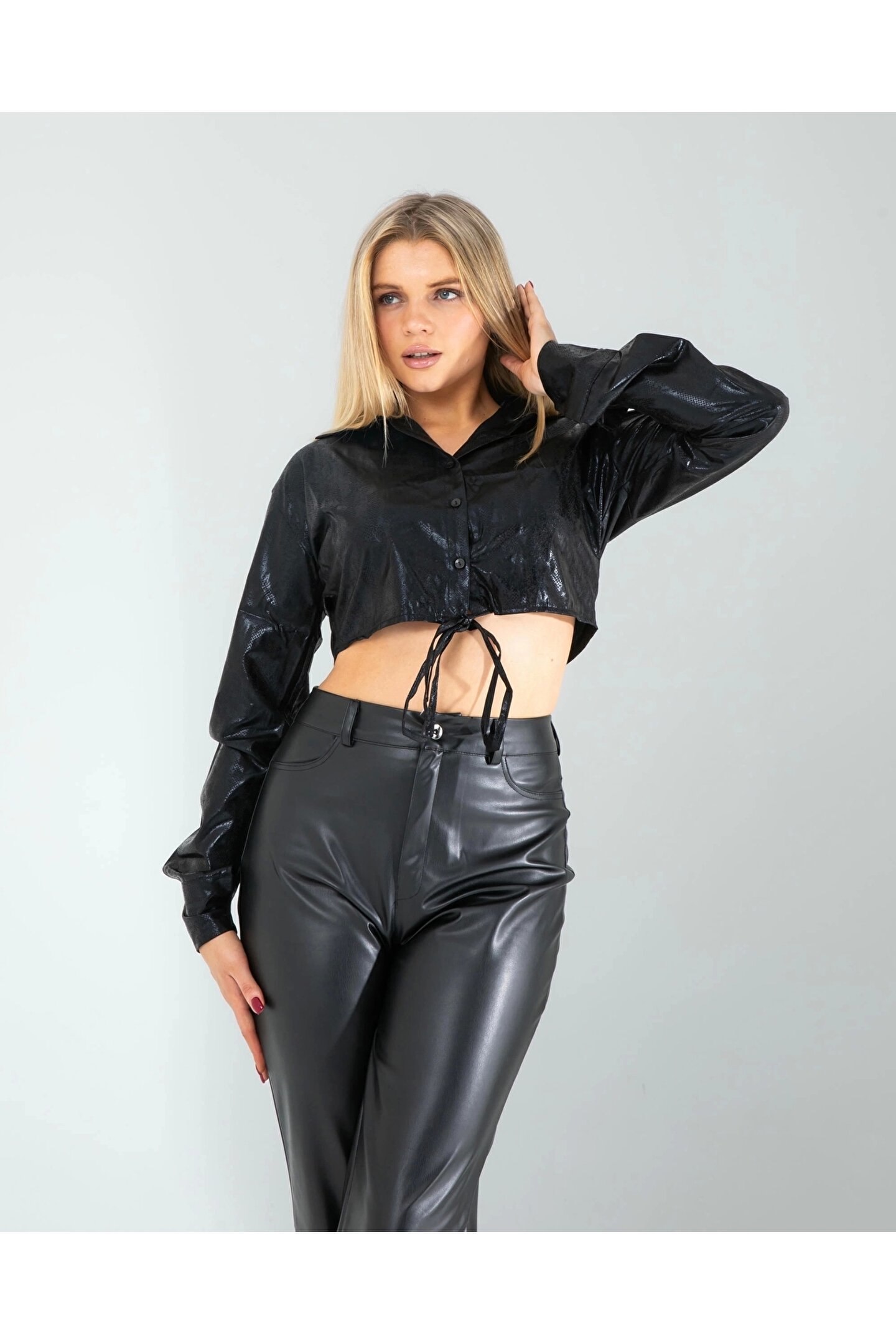 KarşıVitrin Siyah Yılan Varaklı Beli Bağcıklı Gömlek