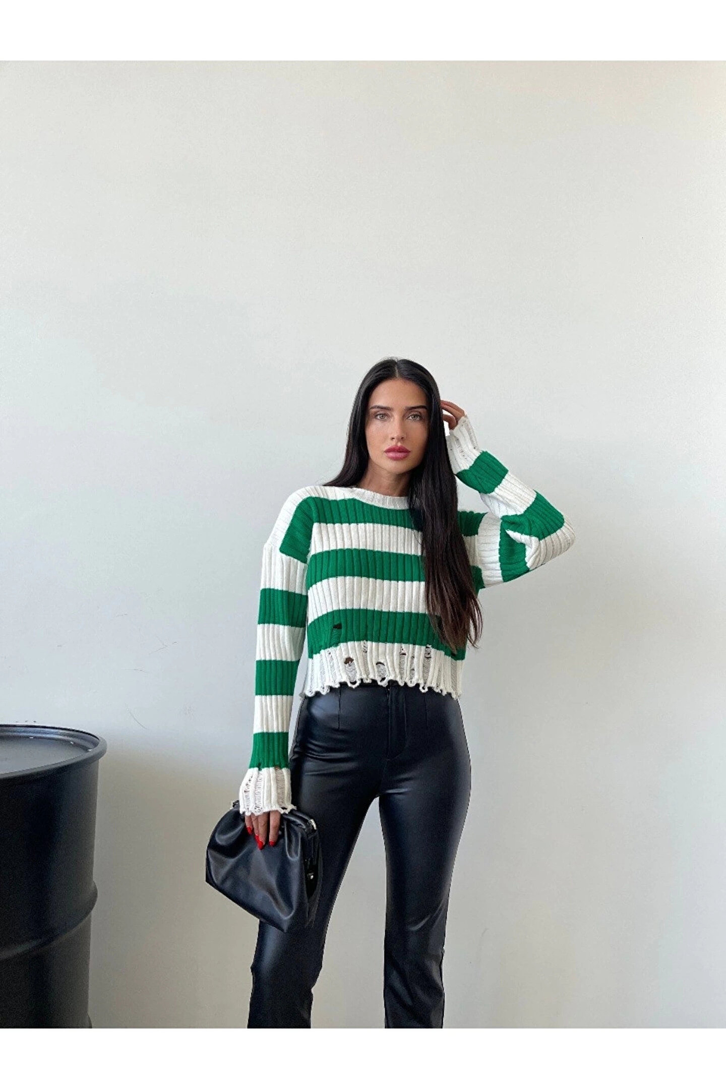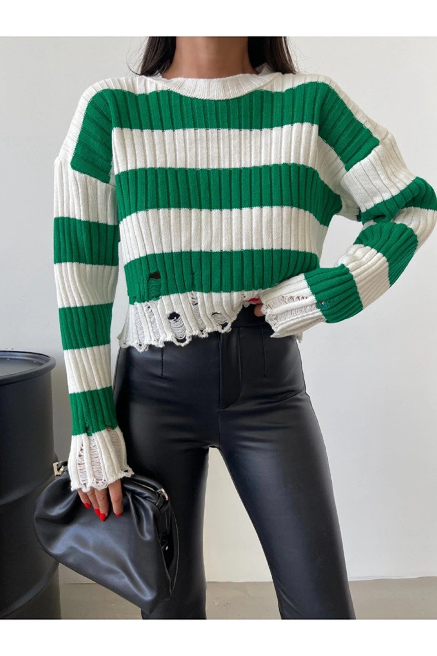 KarşıVitrin Yeşil Çizgili Yırtık Detaylı Triko Kazak