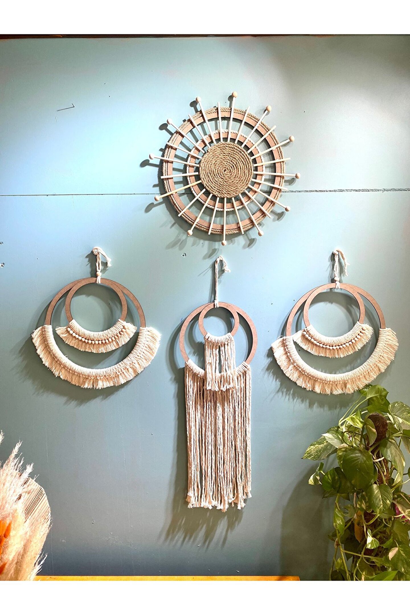 Bohem Makrome Hasır Ayna Duvar Dekorasyon Ürünü 3’lü Set