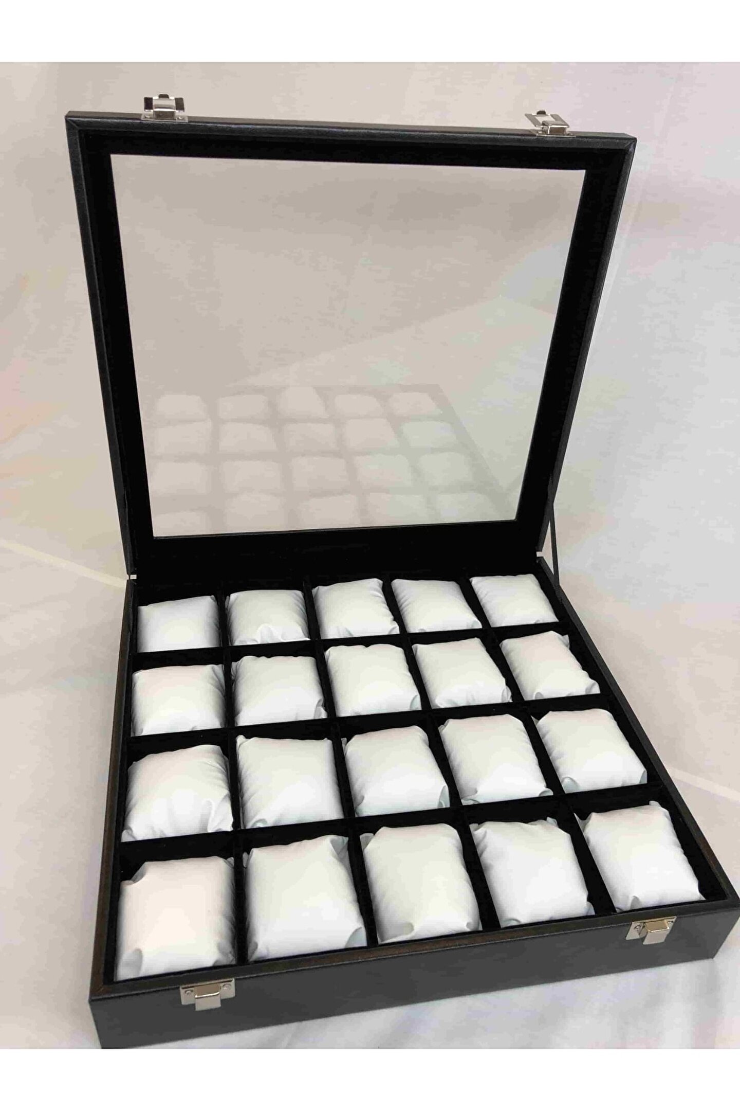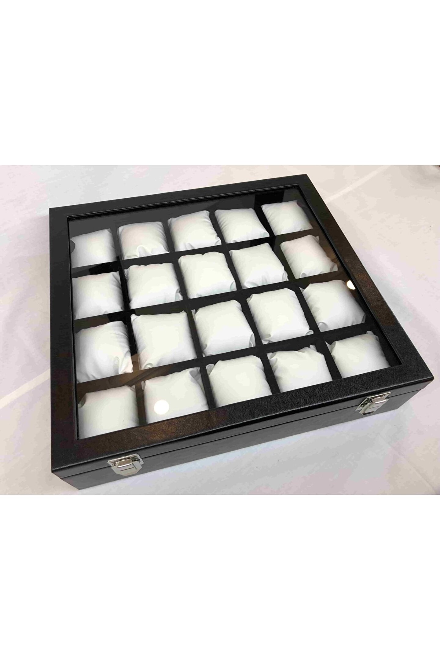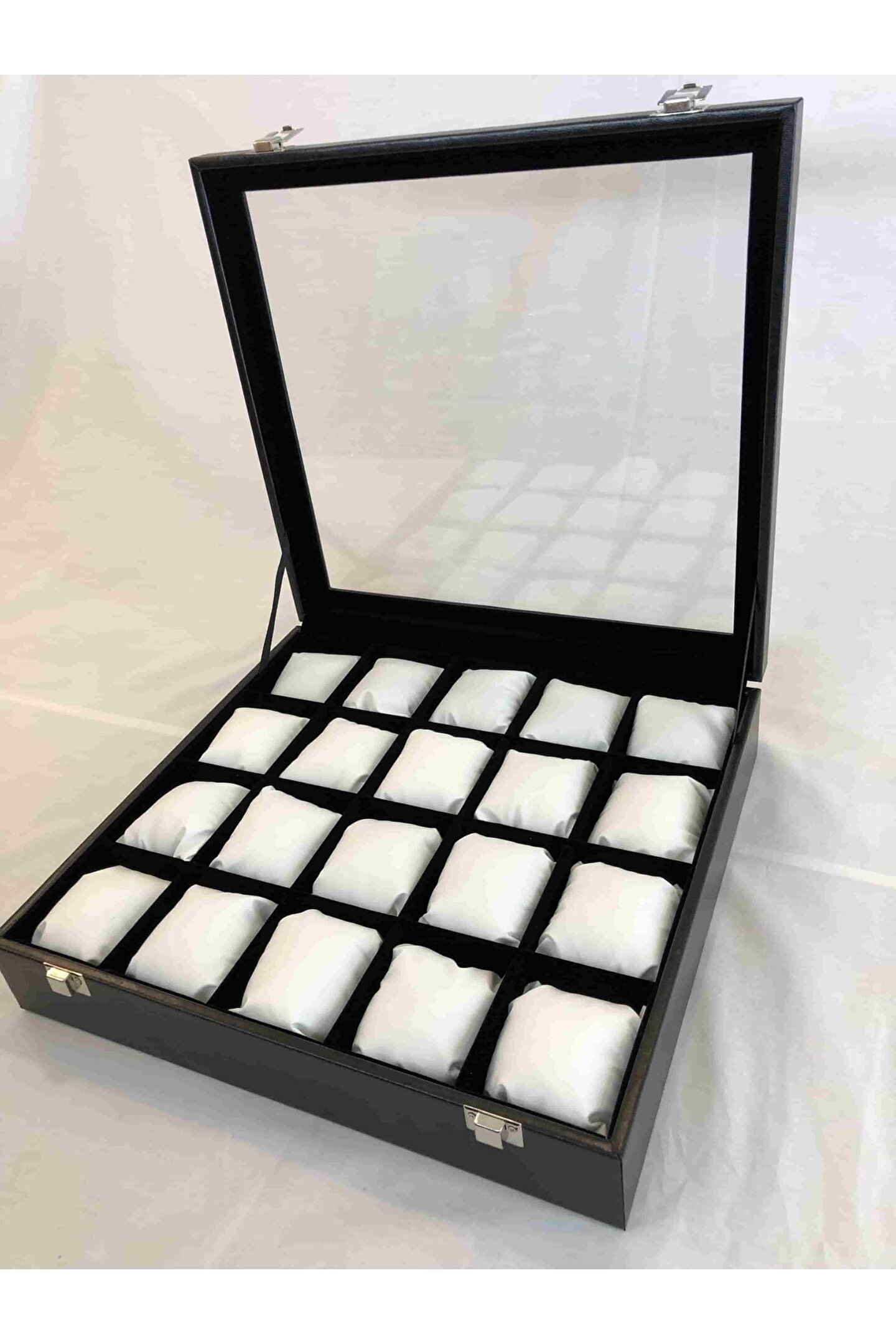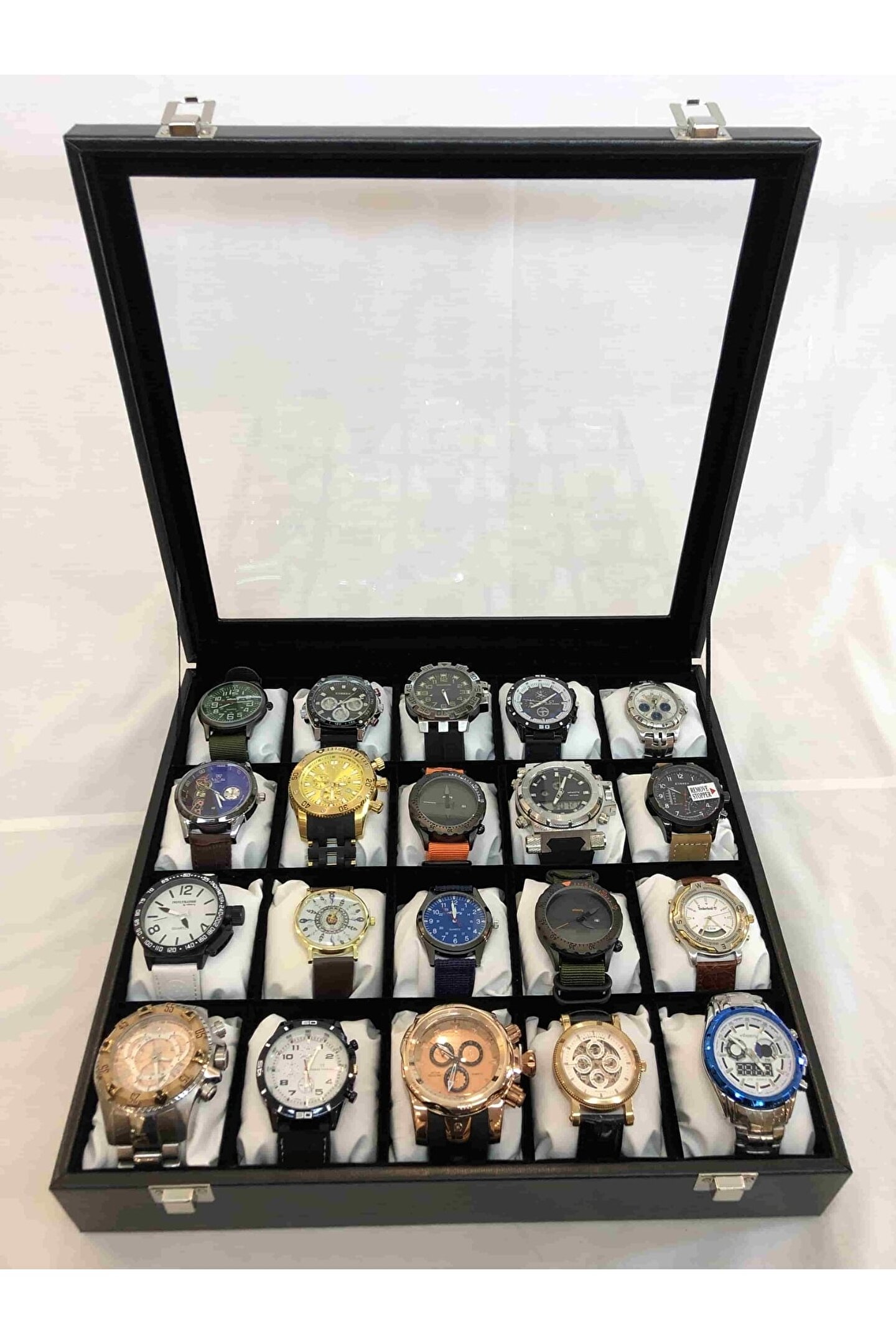 Kelepir Fırsatlar 20 Bölme Görsel Cam Kapak Ahşap Iskelet Siyah Deri Kaplı Şık 20li Özel Kadın Saat Kutusu