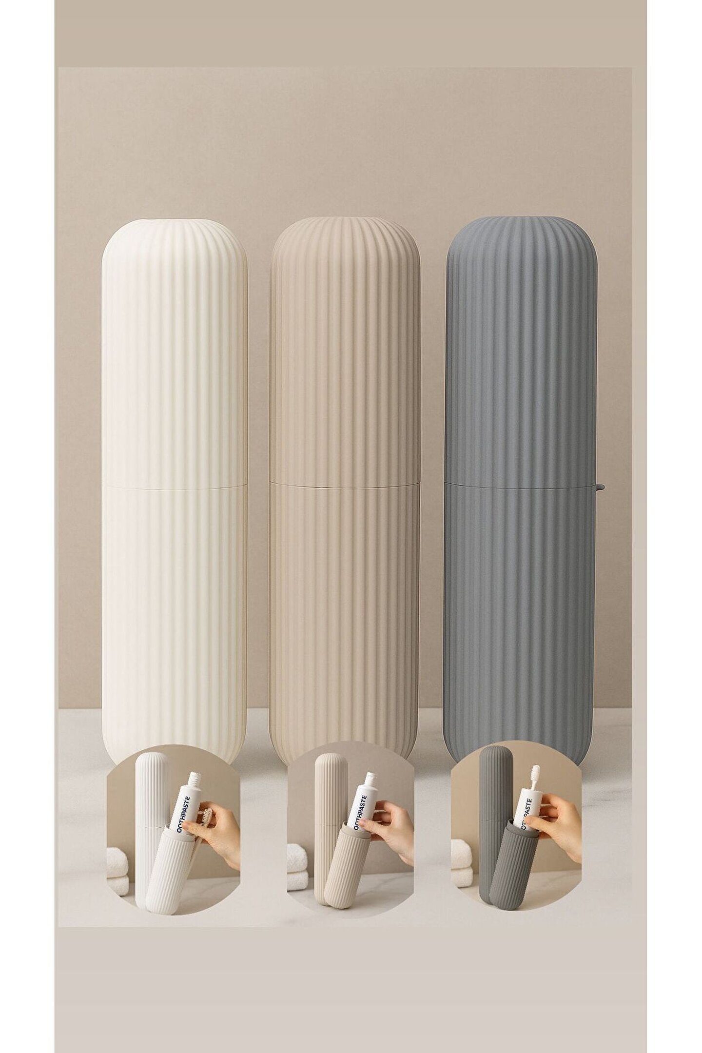 Bu 3’lü taşınabilir diş fırçası ve diş macunu saklama kabı seti, şık tasarımı ve pratik kullanımıyla seyahatlerinizde hijyeninizi korumanıza yardımcı olur.; Krem, bej ve gri renk seçenekleriyle her zevke hitap eder.; Silindirik formu sayesinde kolayca çantaya sığar ve diş fırçası ile macununuzu dış etkenlerden korur.; Hafif yapısıyla taşımayı kolaylaştırırken, çizgili dış yüzeyi modern bir görünüm sunar.; ; stok durumuna göre renk gönderilir; Ürün Özellikleri: •Ürün Türü: Diş fırçası ve macun taşıma kabı •Paket İçeriği: 3 adet (Krem, Bej, Gri siyah beyaz) •Malzeme: Sağlığa uygun dayanıklı plastik •Tasarım: Dikey çizgili, silindirik form •Kullanım Alanı: Seyahat, kamp, spor salonu, ofis •Özellikler: Hafif, portatif, suya dayanıklı, hijyenik taşıma sağlar •Kapasite: 1 diş fırçası ve 1 diş macunu için uygundur •Boyut: Standart seyahat boyutu