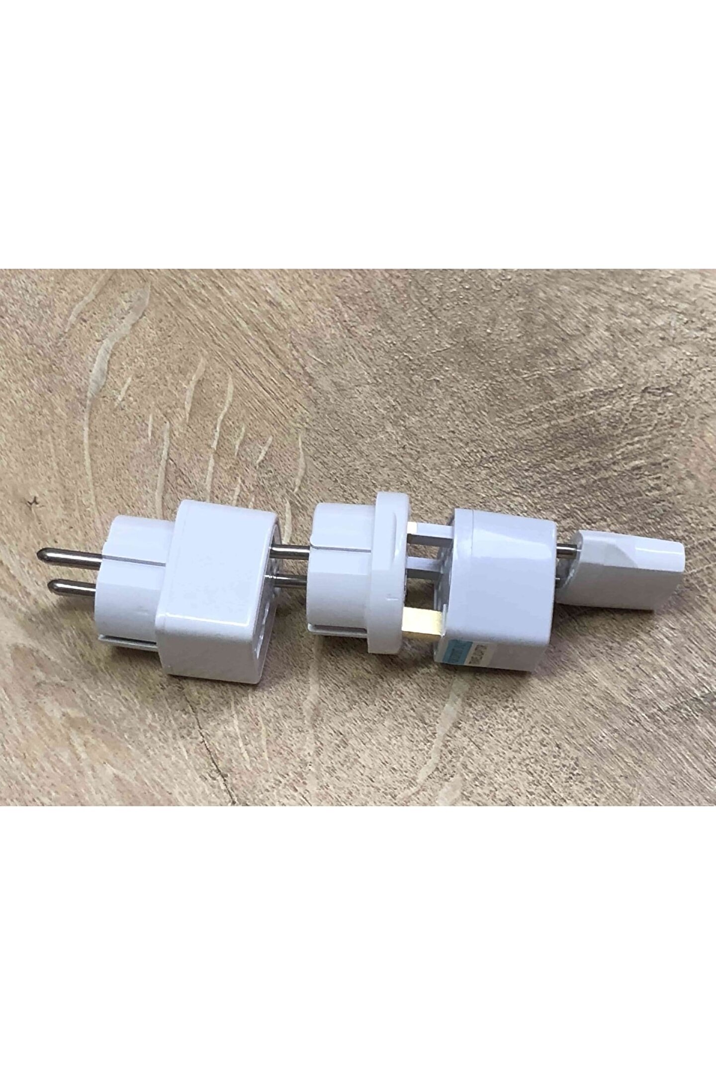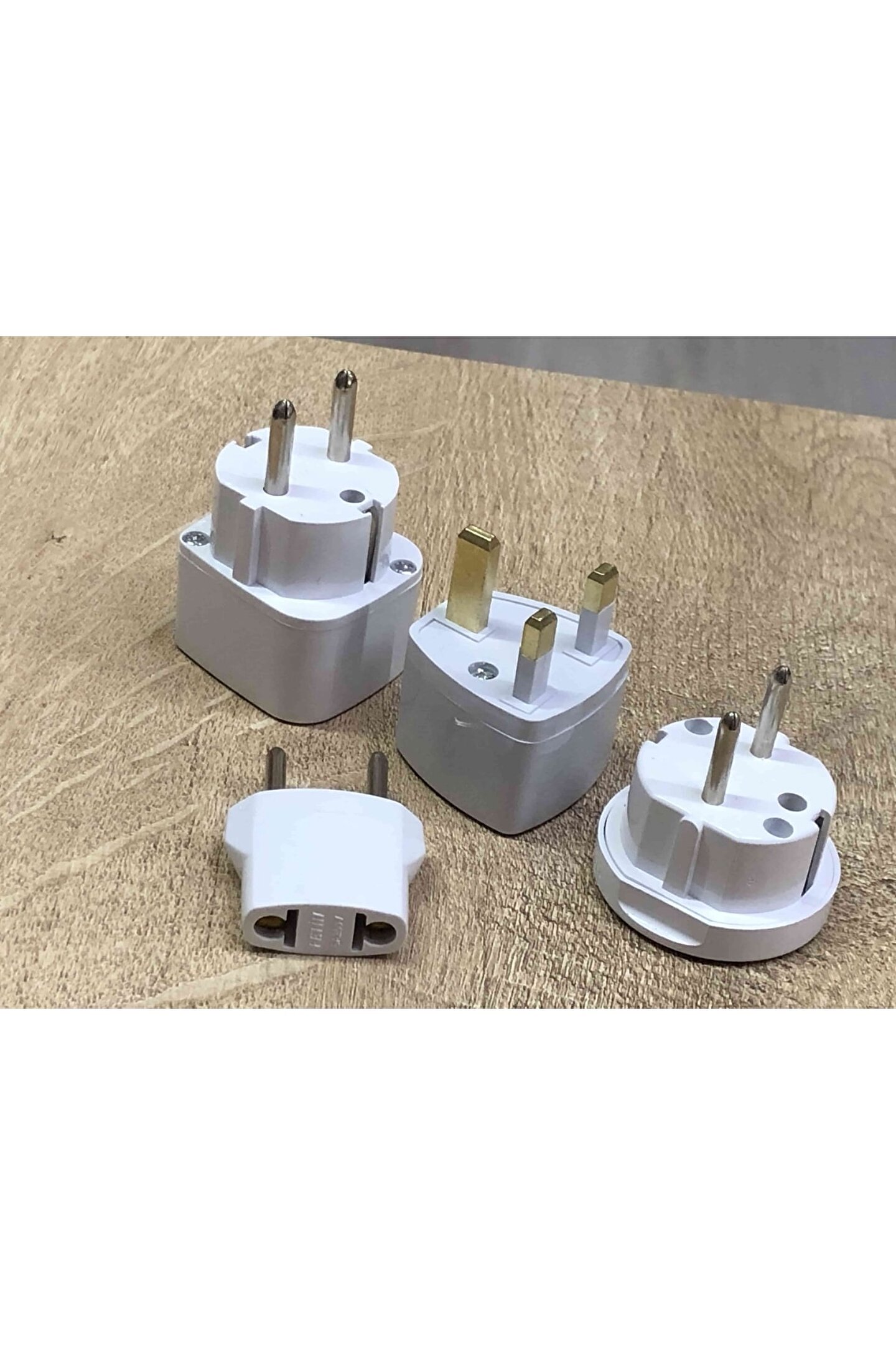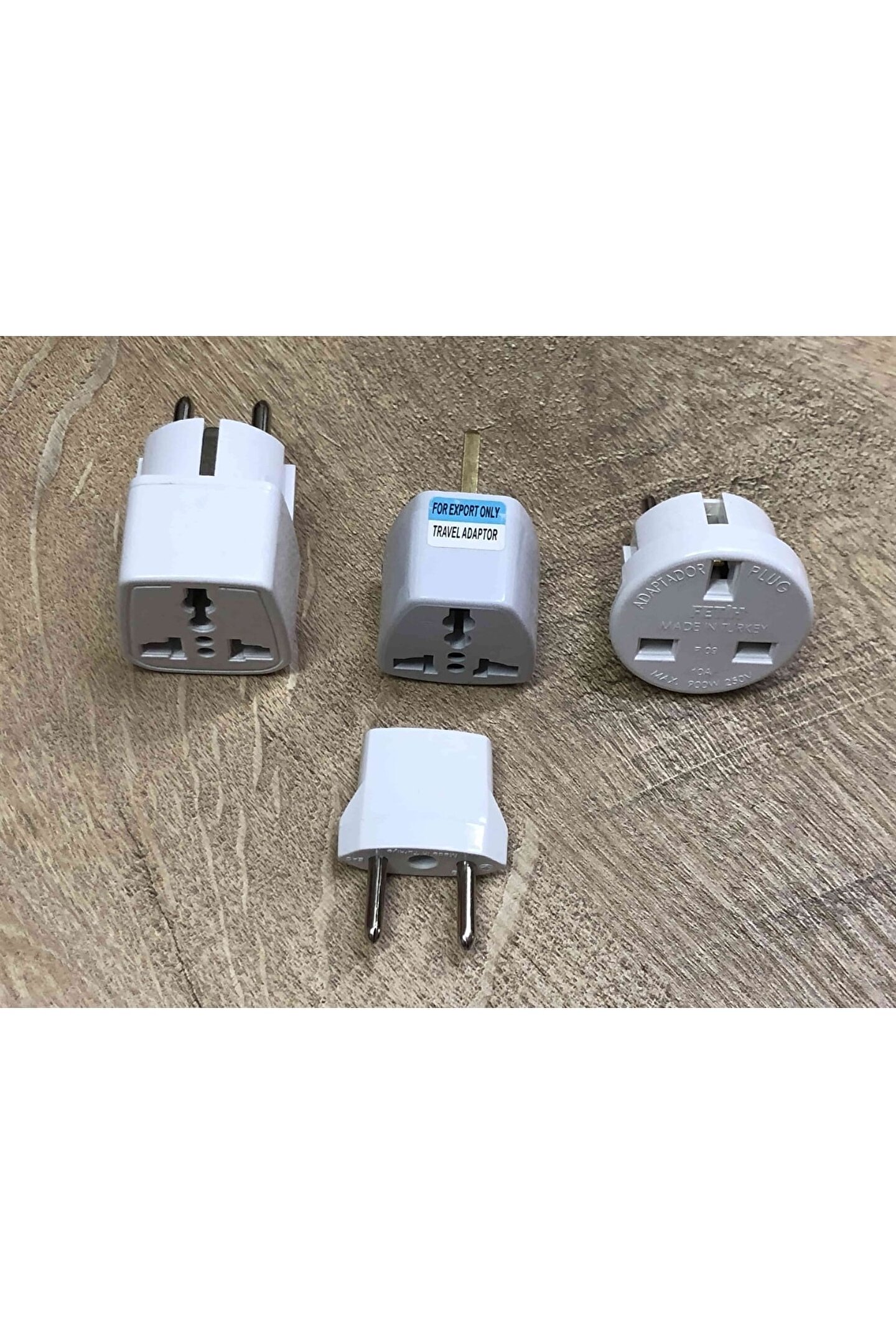 4 adet birbirinden farklı beyaz plastik çevirici dönüştürücü elektrik fiş ucu ; 1. Ingiliz ucunu türk prizine çeviren beyaz renkli yuvarlak topraklı dönüştürücü ; 2. Amerikan + ingiliz ucunu türk prizine çeviren beyaz renkli kare tipi dönüştürücü ; 3. Amerikan 2 pinli duz elektrik ucunu türk prizine dönüştüren küçük siyah renk çevirici ; 4. Amerikan ingiliz avrupa fişini ingiliz avusturalya fişine çevirici 3 kalın bacaklı adaptör ; Yurtdışındaki prizlere uygun ürünleri çalıştırma konusundaki problemi çözmek için kullanılır ; 4 adet resimde görülen çeviriciler gönderilecektir ;
