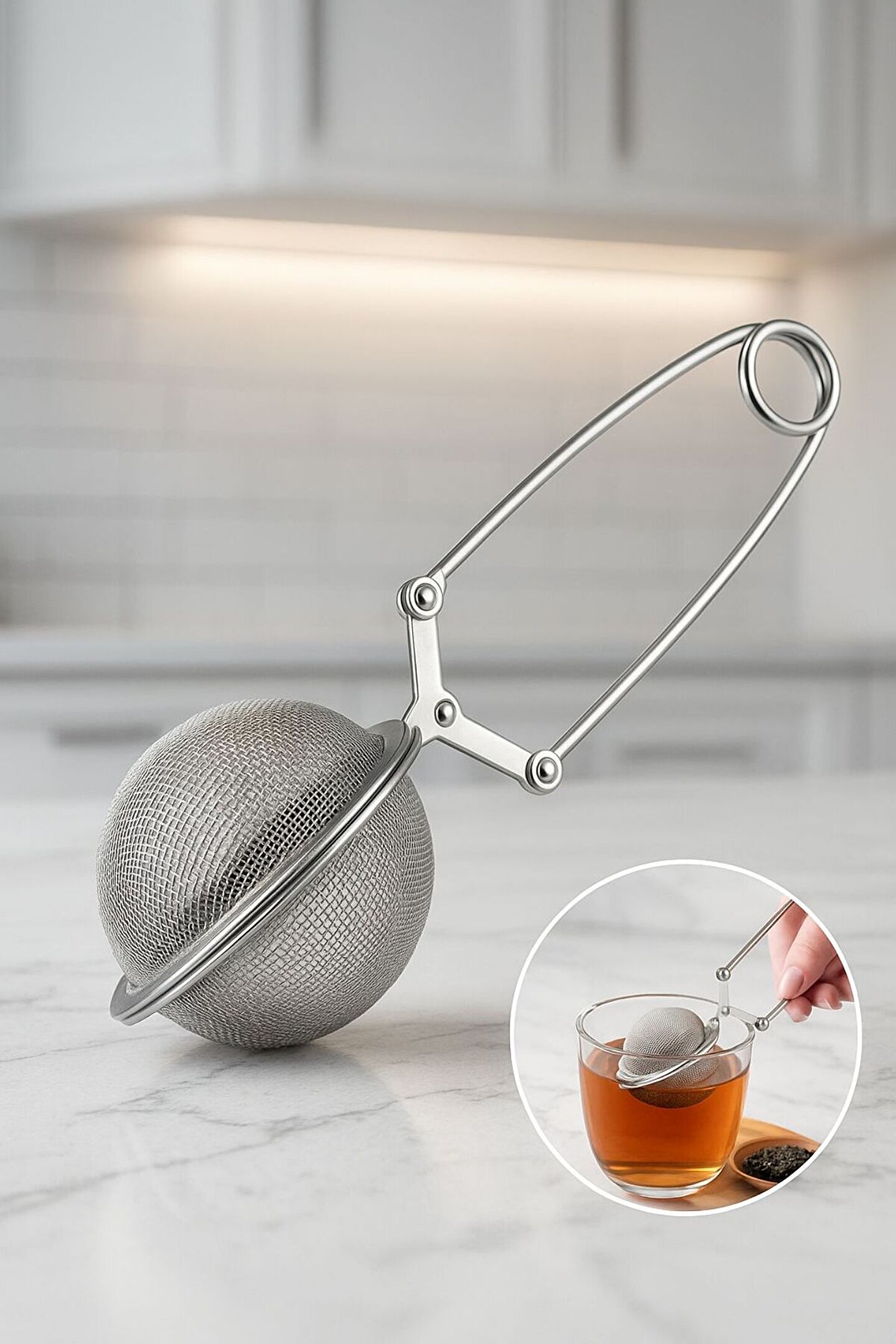 Bu pratik ve şık paslanmaz çelik top çay süzgeci, gevşek yaprak çaylarınızı zahmetsizce demlemenizi sağlar.; Ergonomik yaylı sapı sayesinde kolayca açılır ve kapatılır, top şeklindeki ince telli tasarımı ise çayın aromasını en iyi şekilde ortaya çıkarır.; Cam kupa, bardak ya da demlik içinde rahatça kullanılabilir.; Hem mutfağınızda hem de ofisinizde sağlıklı ve hijyenik çay keyfi sunar.; ; Ürün Özellikleri: •Malzeme: Paslanmaz çelik •Top tasarım: İnce örgü tel ile maksimum süzme •Sap tipi: Yaylı, ergonomik tutuş •Kullanım: Bitki çayları, siyah çay, aromatik karışımlar için uygun •Temizlik: Elde yıkanabilir veya bulaşık makinesinde yıkanabilir •Dayanıklı ve uzun ömürlü yapı