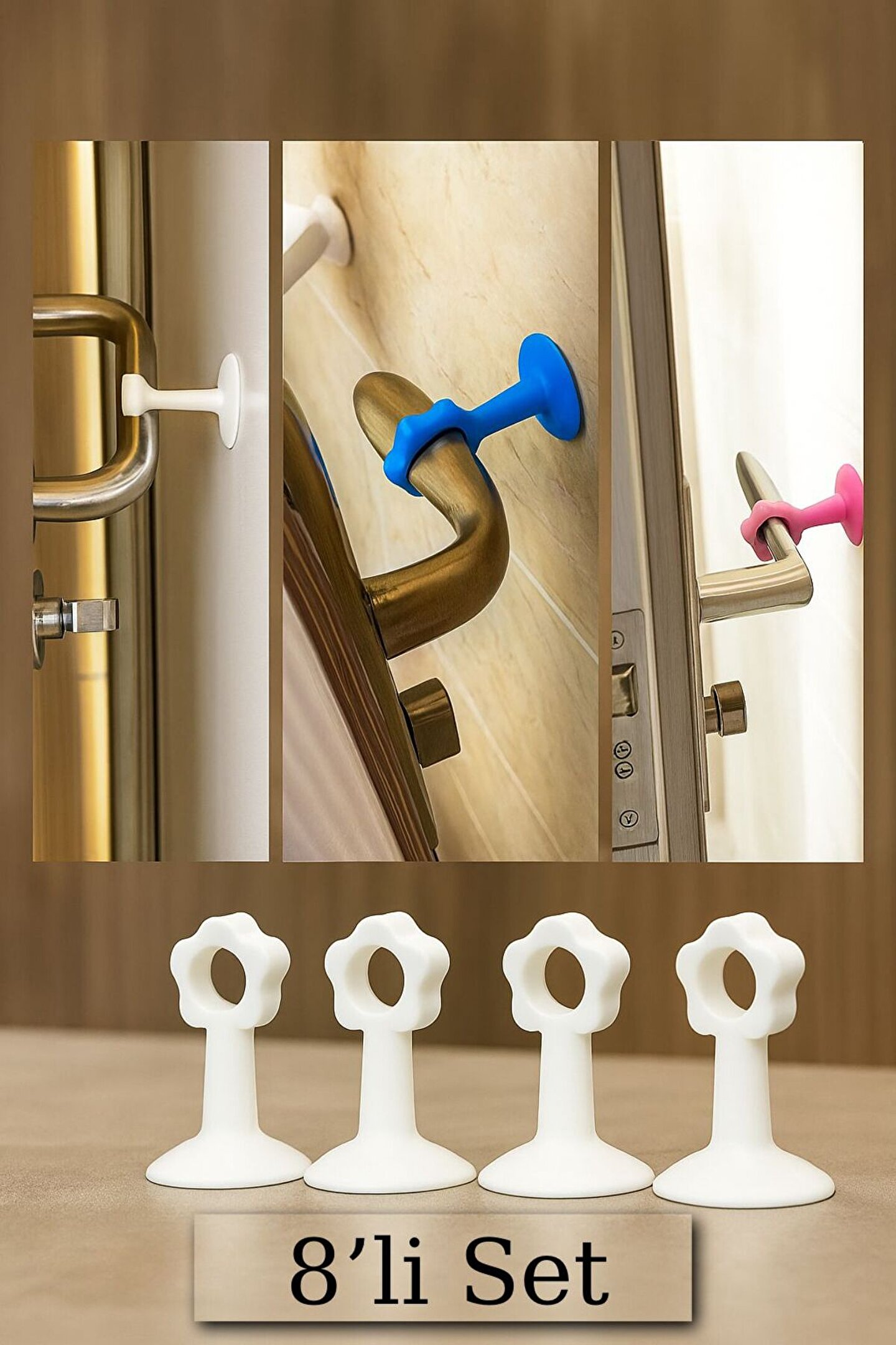 Kapı çarpmalarına karşı güçlü koruma sağlayan bu 8’li silikon kapı kolu tamponu seti, hem estetik hem de fonksiyonel çözüm sunar.; Güçlü vantuzlu yapısı sayesinde duvara sıkıca tutunur, kapı kollarının duvarlara zarar vermesini önler.; Çiçek şeklindeki modern tasarımı ile dekoratif görünüm sunar.; Çocuklu evler, yaşlılar için düzenlenmiş ortamlar ve ofisler için idealdir.; ; Özellikler: •Paket içeriği: 8 adet •Malzeme: Yumuşak ve dayanıklı silikon •Renk: Beyaz •Kolay montaj – vantuzlu tasarım •Dekoratif çiçek formu •Sessiz ve darbesiz kapı kullanımı
