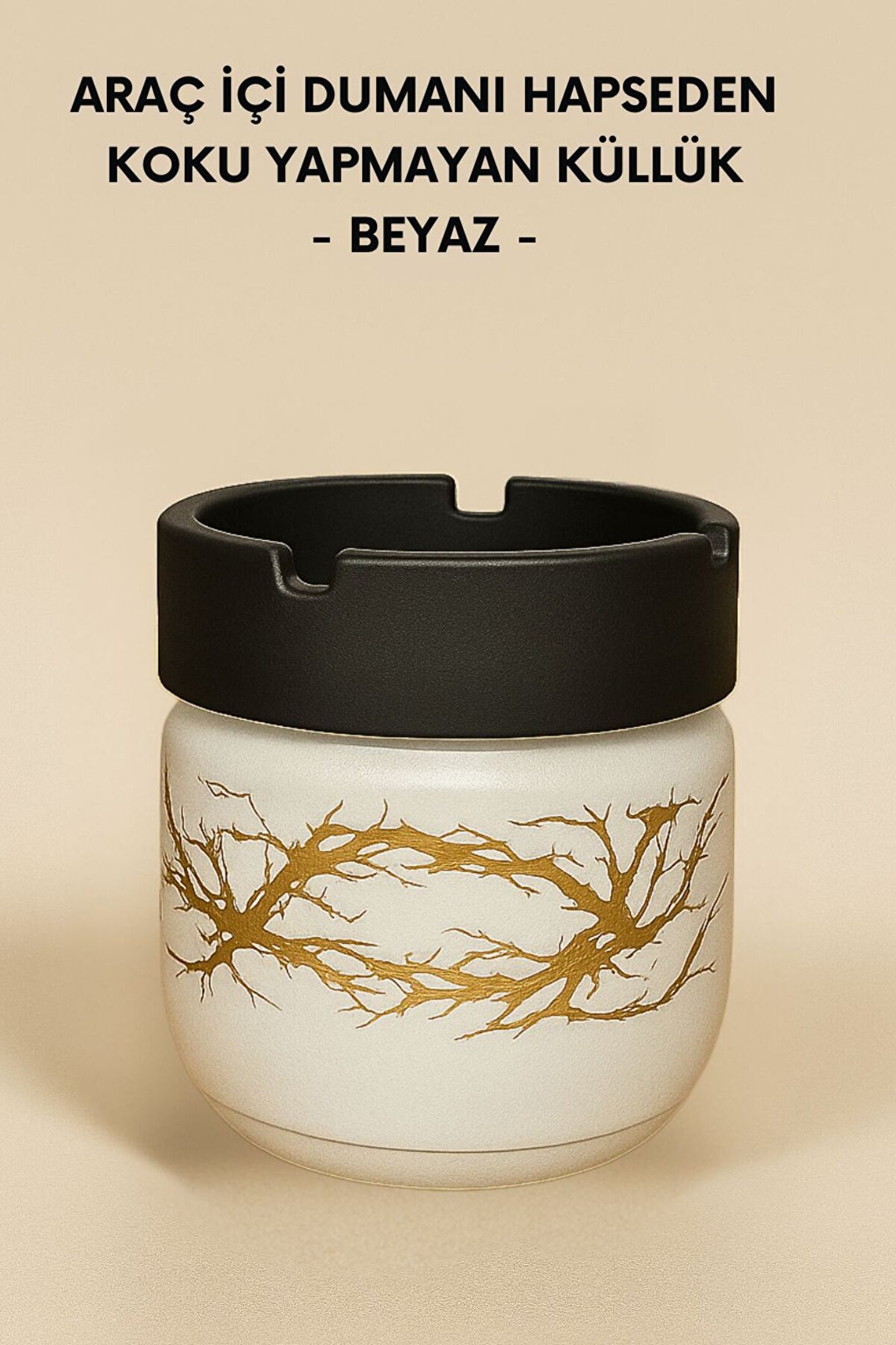 Şıklığı ve fonksiyonelliği bir arada sunan bu cam hazneli beyaz küllük, altın desen detaylarıyla bulunduğu ortama zarafet katıyor.; Dumanı içine hapseden özel yapısı sayesinde sigara kokusunu minimize eder.; Cam gövdesi hem modern bir görünüm sunar hem de kolay temizlenebilir yapısıyla kullanım kolaylığı sağlar.; Kapak kısmı ısıya dayanıklı malzemeden üretilmiş olup, izmaritleri güvenli şekilde içinde tutar.; Evde, ofiste veya araçta hem dekoratif hem de işlevsel bir çözümdür.; ; Ürün Özellikleri: •Ürün Tipi: Cam hazneli küllük •Renk: Beyaz gövde, siyah kapak •Desen: Altın yaldızlı şık motif •Malzeme: Isıya dayanıklı plastik kapak + cam gövde •Koku hapseden tasarım •Kolay temizlenebilir •Kullanım Alanı: Ev, ofis, araç içi