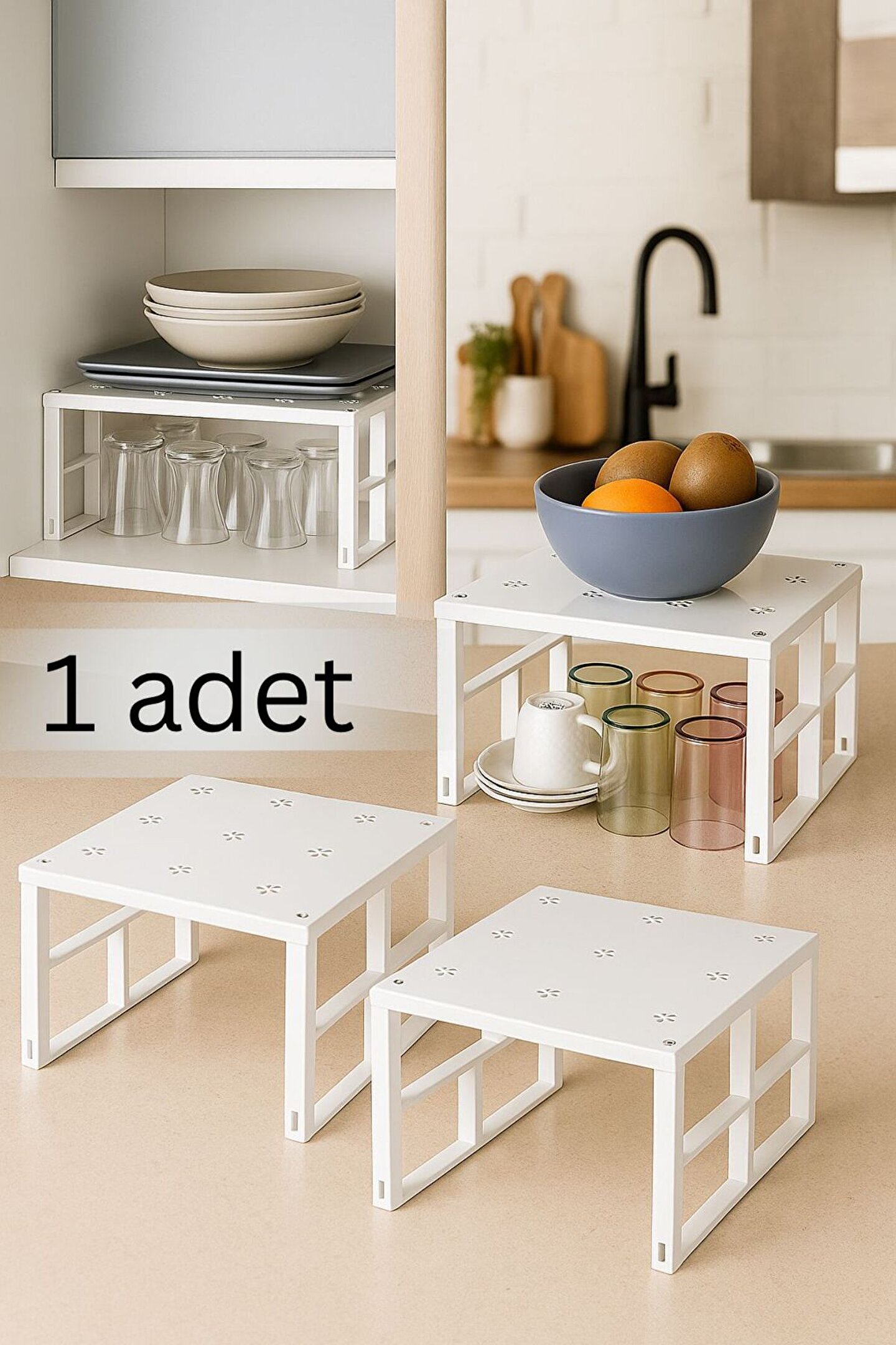 Mutfağınızı daha düzenli hale getirir ve dolaplarınızdan tasarruf yapmanızı sağlar.; ; Mutfak dolabında, tezgah üzerinde vb alanlarda kullanıma uygundur.; Darbelere ve ağırlığa karşı dayanıklıdır.; Tabak,bardak vb tüm mutfak gereçlerini rahatlıkla taşıyabilir.; Demonte halde gönderilir.; Montajı kolaydır.; Ürünün üst kısmı paslanmaz metal, ayakları ise sağlam abs plastiktir.; Ürün Ölçüleri: 31,5 x 27,5 cm Yükseklik: 15 cm Paket İçeriği: 1 adet Dolap İçi Raf Düzenleyici