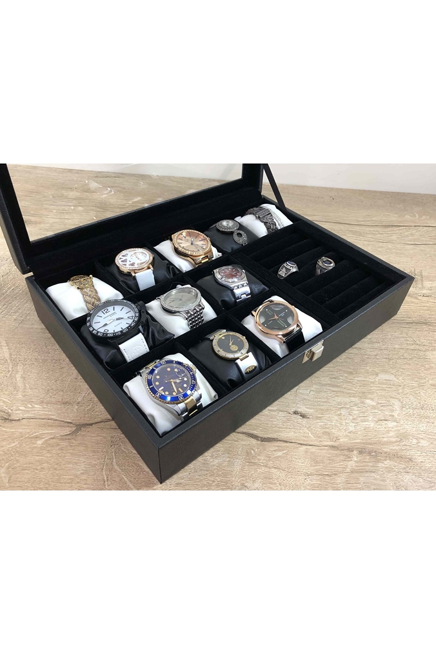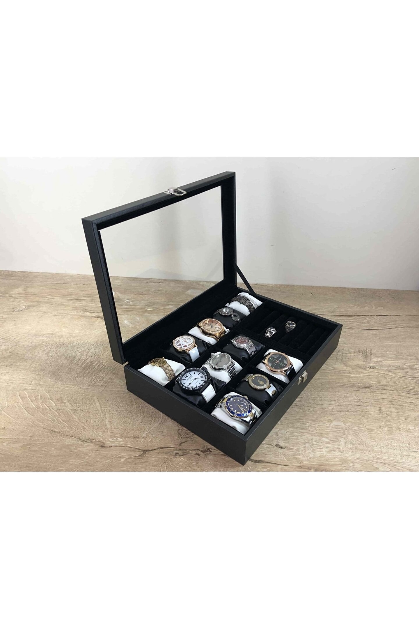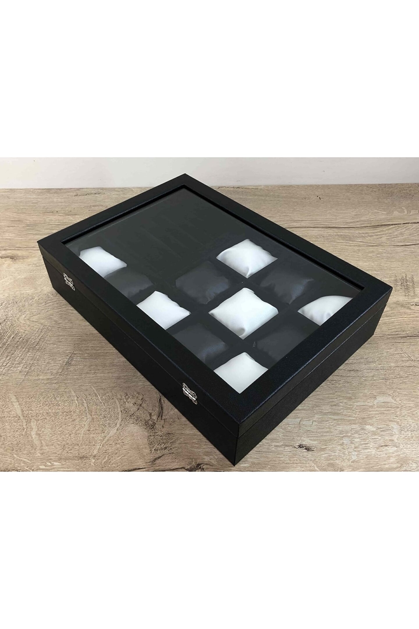 11 Bölmeli Özel Üretim Deri Görünümlü El Yapımı Camlı Görsel Kol Saati Bileklik Kolye Yüzük Taki Alyans Kutusu Display Stand %100 Orjinal Türk Malıdır Türkiyede Üretilmiştir Çin Malı Değildir İmalattan Halka Satış Tamamen El Yapımıdır 11 adet Büyük Boy Gözlüdür 7 Sıra Özel Yüzük ve Takı Bölümü Özel Üretim Deri Görünümlü Vinlex Kaplama 11 Adet Beyaz Vinlex Kaplama Yastık Silikon Dolgulu Yumuşak yastıklar Her Boyuttaki Saatlere Kolaylıkla Uyar Spor ve Klasik Saatler için Uygundur Bayan ve Erkek Modellerine Uyumludur BOYUTLARI : Dış Kutu Boy : 241mm Dış Kutu En : 341mm; Dış Kutu Yükseklik : 81mm; İç Göz Boy : 7; 1mm; İç Göz En : 6; 1mm; İç Göz Yükseklik : 7; 1mm; İç Takı Yüzük Bölümü Boy : 149mm; İç Takı Yüzük Bölümü En : 95mm; İç Takı Yüzük Bölümü Yükseklik : 45mm; Kilit En : 25mm; Kilit Boy : 32mm; Mentese Boy : 18mm; Mentese En : 21mm; Resimler Orjinal kendi çekimlerimizdir Resimdeki Saat Kutusu Gönderilicektir Ürünlerin Hepsi Stoklarımızda Mevcuttur Ana Gövde : 5mm; Ahşap Gövde Üstü : 2mm Mukavva İç Kaplama : Özel Tüy Dökmez Siyah Kadife Yastıklar : Siyah & Beyaz Yumuşak ince Vinlex Yastık Dolgu : Beyaz Yumuşak Silikon Dış Kaplama : PU Leather Vinlex Cam : 1; 8mm Kalınlık Kilit : Metal Menteşe : Metal DİĞER ÜRÜNLERİMİZE BAKMANIZI TAVSİYE EDERİZ;