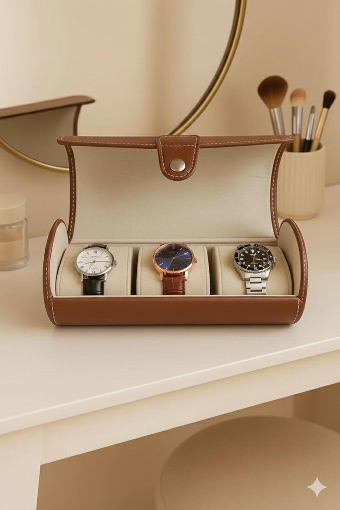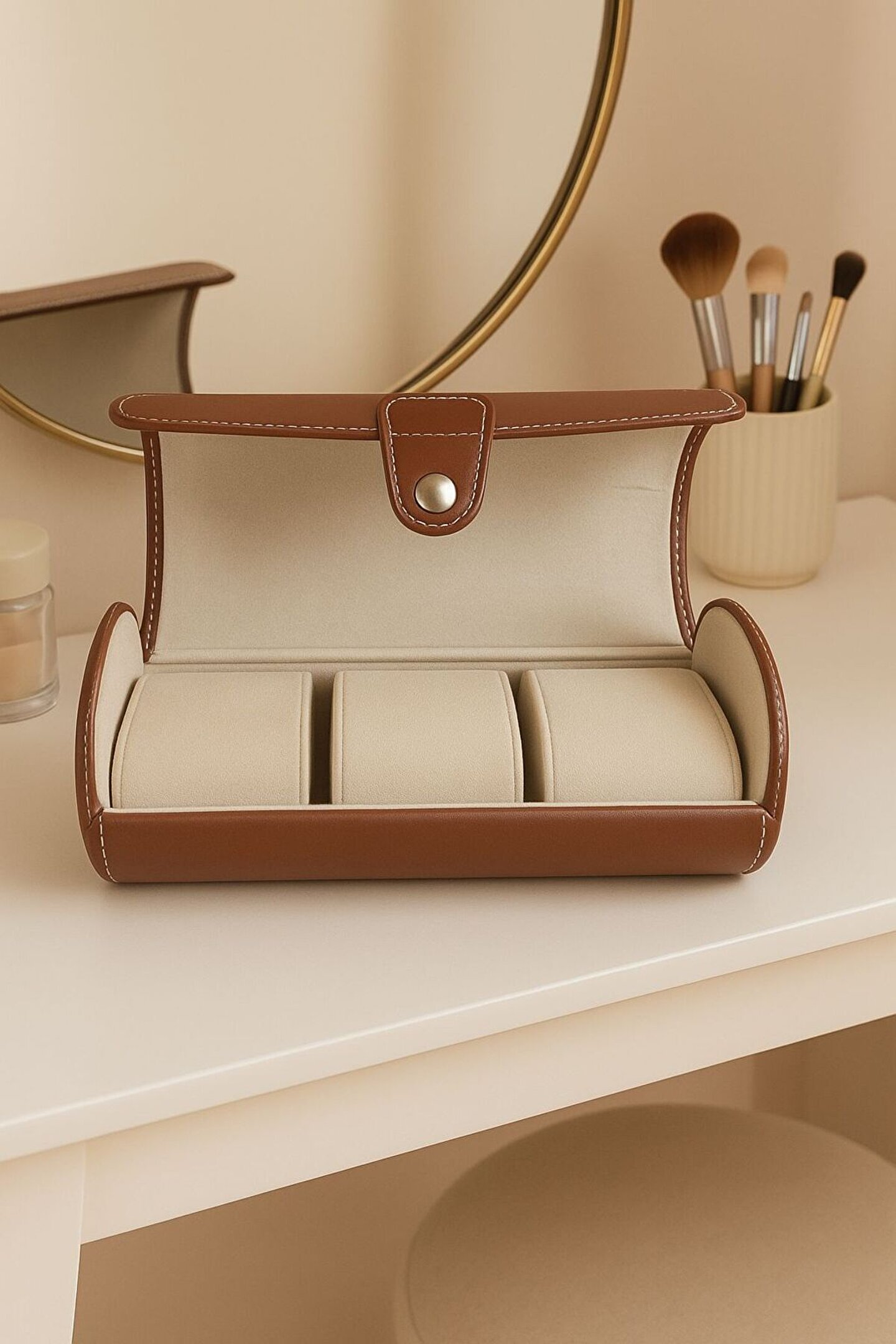 Şık ve kaliteli tasarımıyla öne çıkan kahverengi deri 3’lü saat kutusu, saat koleksiyonunuzu düzenli ve güvenli bir şekilde saklamanızı sağlar.; Yumuşak iç astarı sayesinde saatlerinizi çizilmelere karşı korur.; Hem evde hem seyahatlerde kullanıma uygundur.; Saat severler ve koleksiyonerler için mükemmel bir hediye seçeneğidir