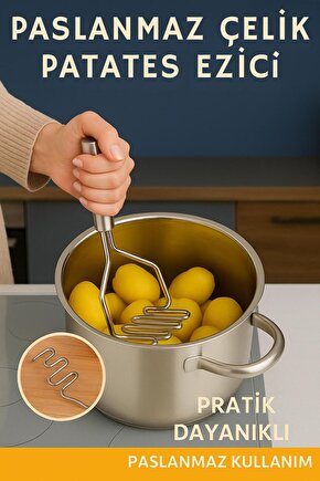 Mutfakta pürüzsüz patates püresi hazırlamanın en pratik yolu! Dayanıklı paslanmaz çelikten üretilmiş bu patates ezici, ergonomik tutma sapı sayesinde rahat kavrama ve güçlü ezme imkânı sunar.; Patatesin yanı sıra havuç, kabak, karnabahar gibi sebzeleri de kolayca ezebilirsiniz.; Bulaşık makinesinde yıkanabilir yapısı ile hijyenik ve uzun ömürlü bir mutfak yardımcısıdır.; ; Ürün Özellikleri: •Yüksek kaliteli paslanmaz çelik gövde •Ergonomik, rahat tutuş sağlayan sap •Püre, ezme ve karıştırma işlemleri için ideal •Patates, havuç, kabak gibi sebzelerle uyumlu •Bulaşık makinesinde yıkanabilir •Uzun ömürlü ve sağlam yapı •Pratik ve kullanımı kolay tasarım