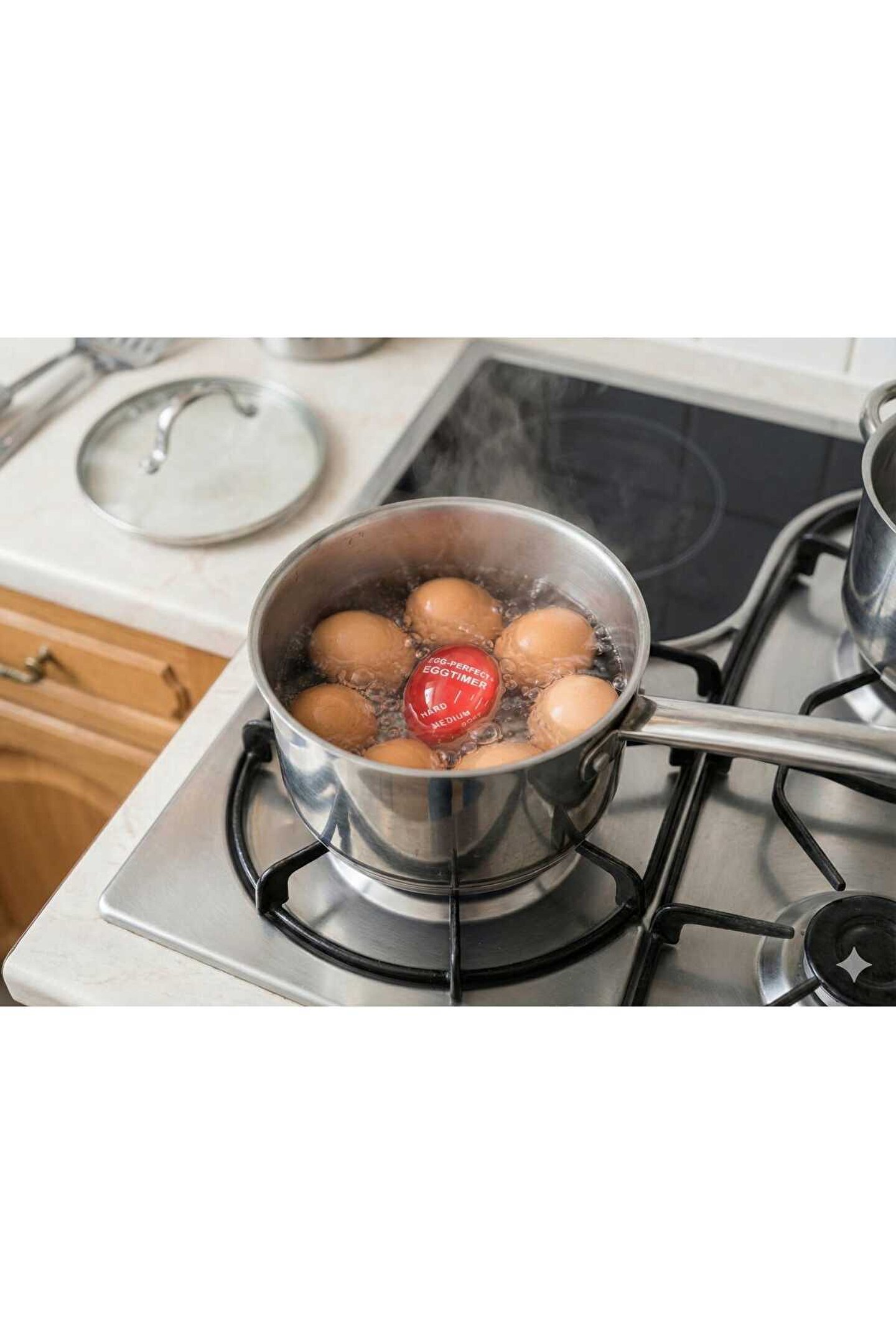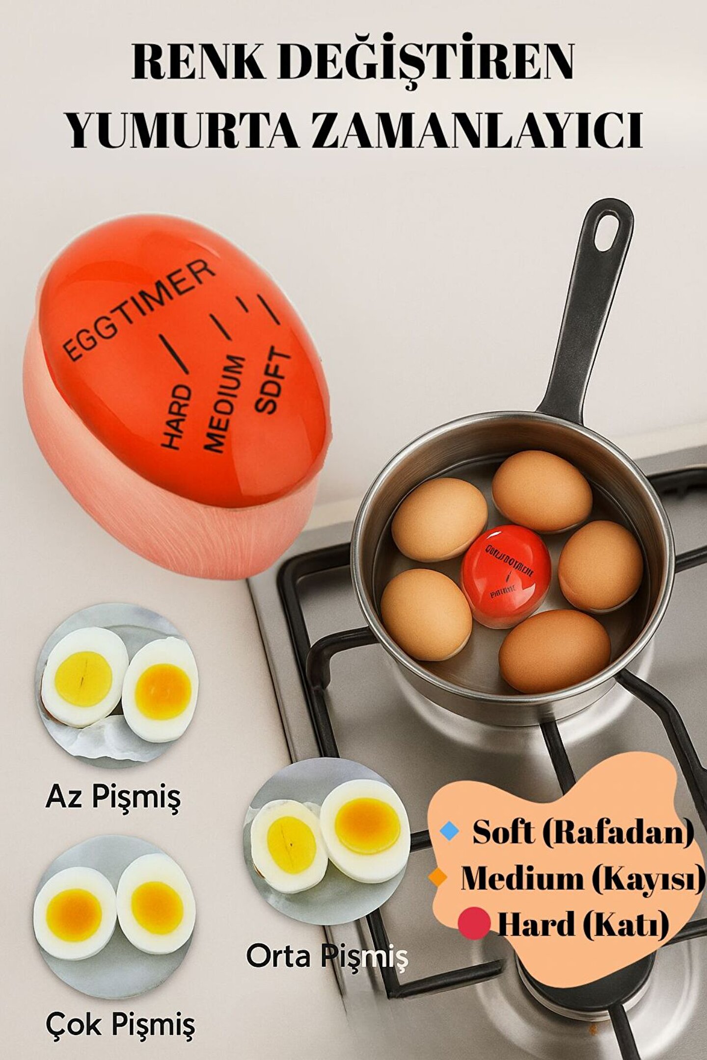 Yumurtalarınızın tam istediğiniz kıvamda pişmesini sağlayan pratik bir yardımcı! Renk değiştiren yumurta zamanlayıcıyı tencereye yumurtalarla birlikte koyun ve pişirme sürecini kolayca takip edin.; Üzerindeki renk göstergesi sayesinde rafadan (soft), kayısı (medium) ve katı (hard) kıvamlarını anında görebilirsiniz.; Artık yumurtalarınız ne çok pişmiş ne de az pişmiş olacak – her seferinde tam kararında! Ürün Özellikleri: •Isıya duyarlı özel tasarım •Rafadan, kayısı ve katı ayar göstergeli •Tencere içinde doğrudan kullanım •Tekrar tekrar kullanılabilir •BPA içermez, sağlığa zararsız malzeme •Kolay temizlik için dayanıklı yüzey