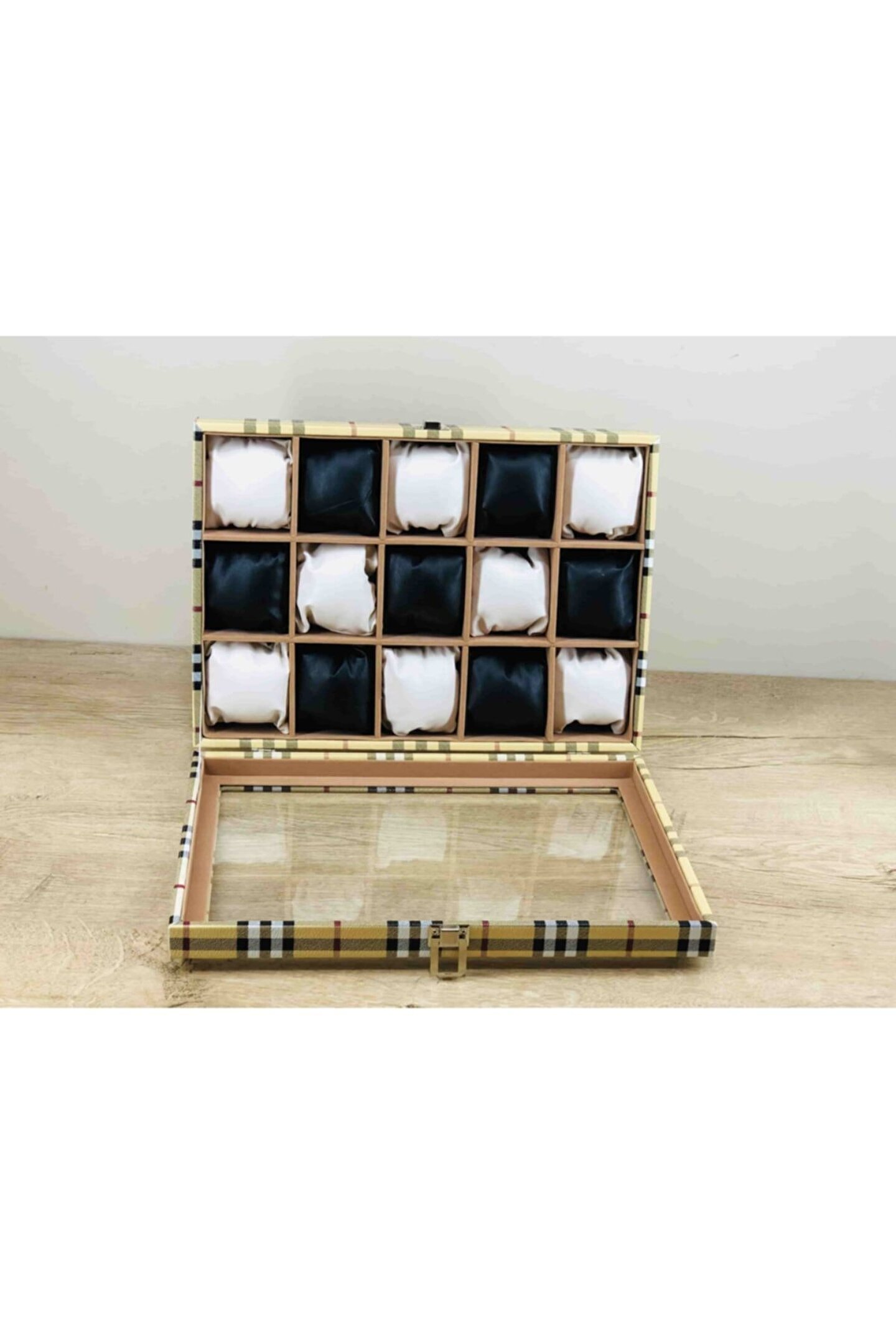%100 orijinal türk malıdır türkiye'de üretilmiştir çin malı değildir imalattan halka satış fabrikasyon yapımı değildir tamamen el yapımıdır 15 adet büyük boy gözlüdür 15 adet siyah bayez vinlex kaplama yastıklar silikon dolgulu yumuşak yastıklar her boyuttaki saatlere kolaylıkla uyar spor ve klasik saatler için uygundur bayan ve erkek modellerine uyumludur yurt dışına gönderim ve imzalı teslimat vardır boyutları : Dış kutu boy : 241mm dış kutu en : 341mm. ; Dış kutu yükseklik : 81mm. ; Iç göz boy : 7.1mm. ; Iç göz en : 6.1mm. ; Iç göz yükseklik : 7.1mm. ; Kilit en : 25mm. ; Kilit boy : 32mm. ; Mentese boy : 18mm. ; Mentese en : 21mm. ; Resimler orjinal kendi çekimlerimizdir resimdeki saat kutusu gönderilicektir ürünlerin hepsi stoklarımızda mevcuttur stoktan aynı gün anlaşmalı kargo ile adresinize gönderilmektedir ana gövde : 5mm. ; Ahşap gövde üstü : 2mm mukavva iç kaplama;