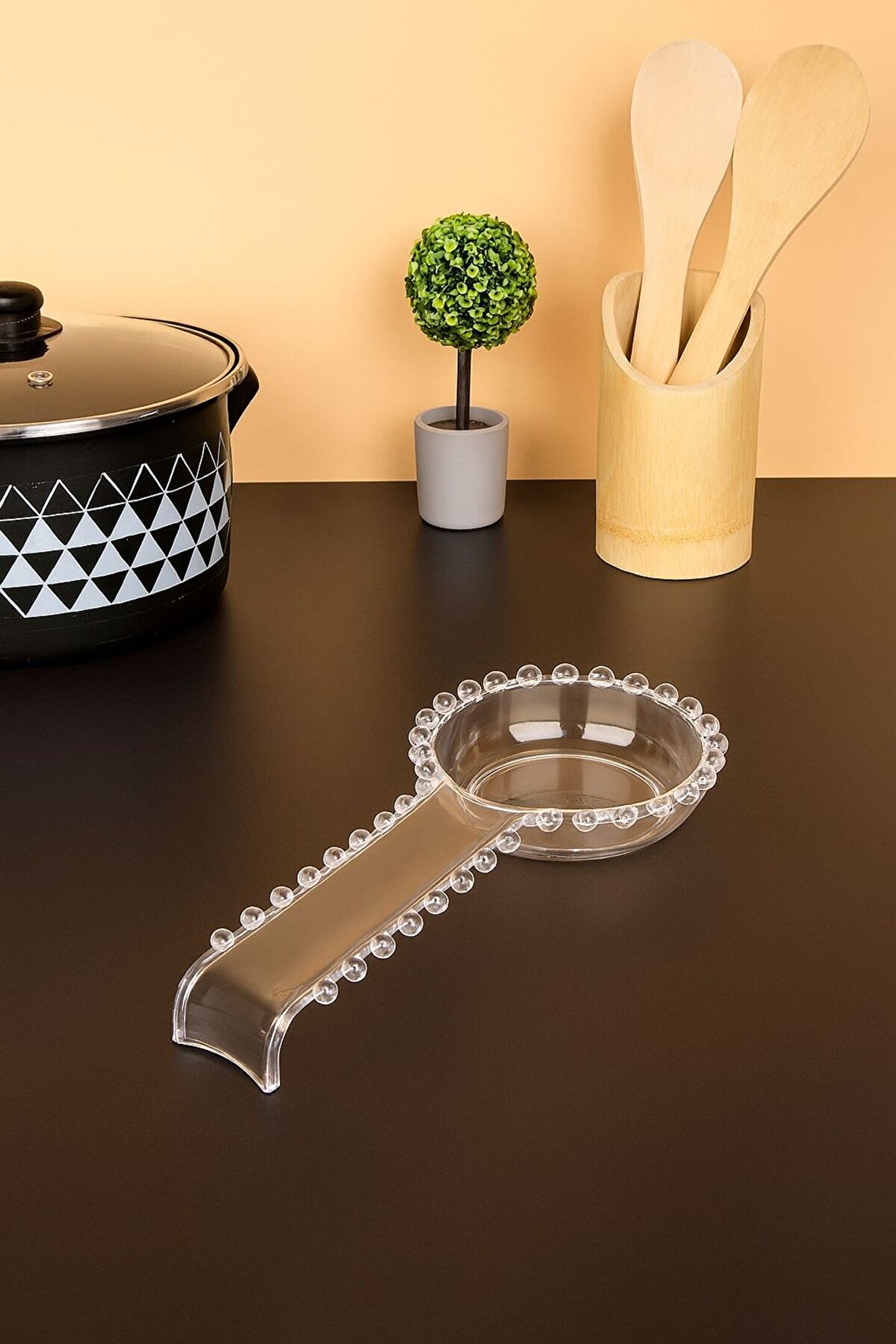Mutfakta düzeni ve hijyeni bir araya getiren şeffaf cam görünümlü kaşık altlığı, şık tasarımı ile tezgahlarınıza estetik bir dokunuş sunar.; Yemek yaparken kullanılan kaşık, spatula gibi mutfak gereçlerini temiz ve düzenli bir şekilde yerleştirmenizi sağlar.; Modern ve zarif detayları sayesinde her mutfak dekorasyonuna uyum sağlar.; Temizliği kolaydır ve uzun ömürlü kullanım sunar.; ; Ürün Özellikleri: •Şeffaf cam görünümlü plastik malzeme •Zarif boncuk detaylı kenarlar •Kaşık, spatula ve kepçe için ideal boyut •Kolay temizlenebilir yüzey •Kaymaz ve dengeli taban •Mutfak tezgahı üzerinde estetik görünüm sağlar