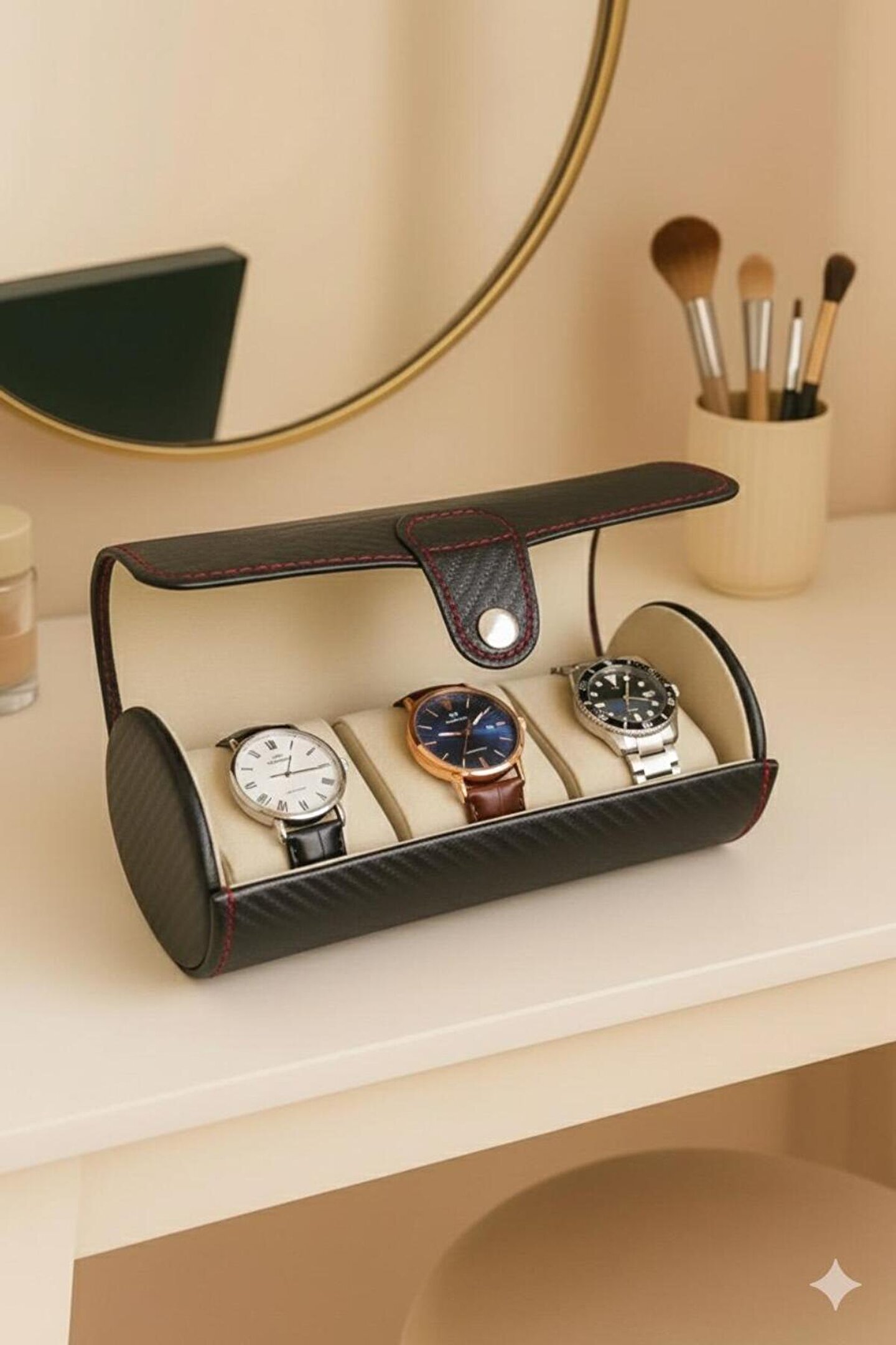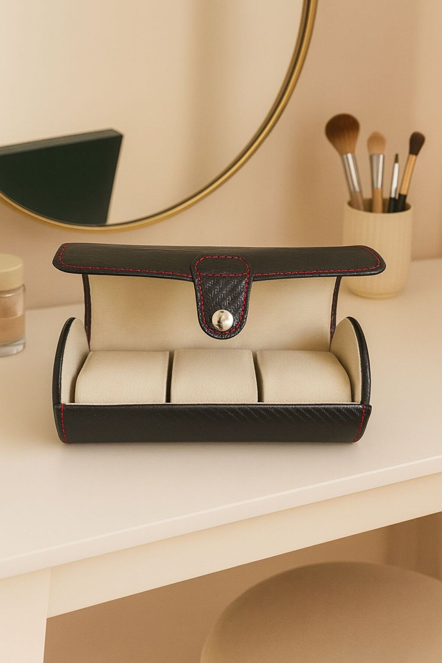 Modern tasarımıyla dikkat çeken siyah deri kırmızı dikişli 3’lü saat kutusu, koleksiyonunuzu hem korur hem de estetik bir sunum sağlar.; Dayanıklı dış yüzeyi ve yumuşak iç yapısıyla saatlerinizi uzun süre güvenle saklayabilirsiniz.; Seyahatlerde pratik taşıma imkanı sunar.; Erkek ve kadın saat koleksiyonları için ideal tercihtir.;
