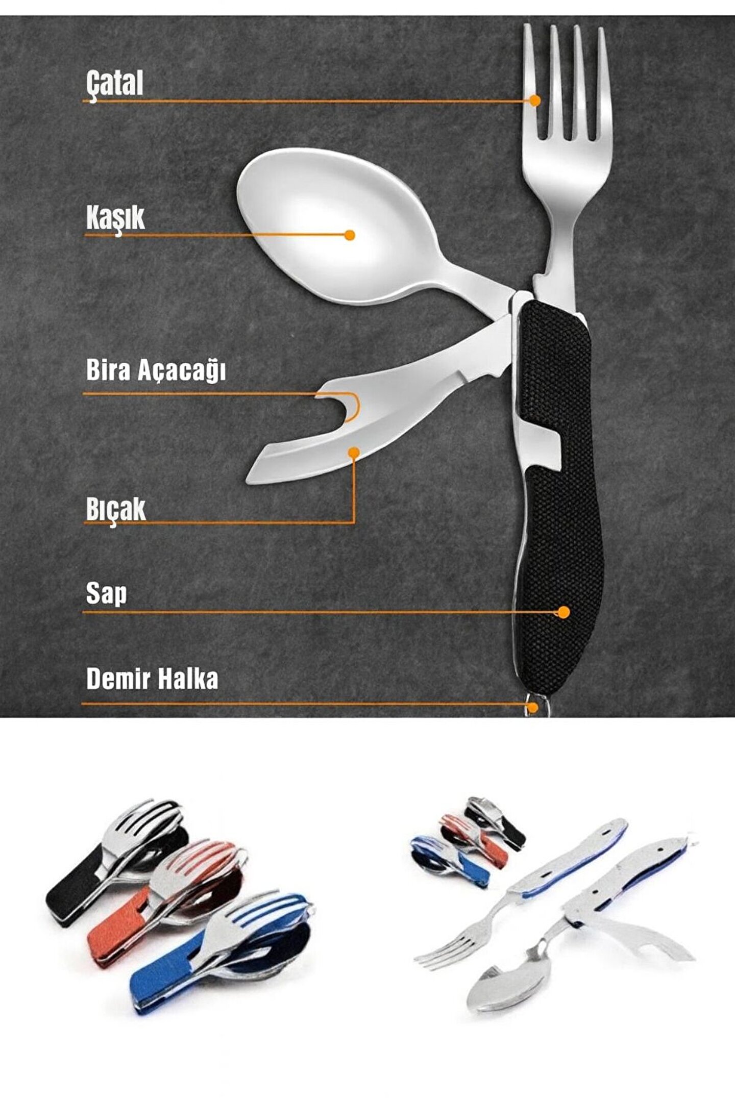 Taşınabilir Katlanabilir Kamp Çatal-Kaşık-Bıçak Seti, outdoor ve kamp aktiviteleri için tasarlanmış kompakt ve çok fonksiyonlu bir üründür. Bu set, çatal, kaşık ve bıçak işlevlerini tek bir üründe birleştirir ve açacak gibi ek fonksiyonlarla da kullanıcıların kamp ortamında ihtiyaçlarını kolayca karşılamasına yardımcı olur. Katlanabilir yapısı sayesinde cepte veya çantada rahatlıkla taşınabilir. Dayanıklı paslanmaz çelikten üretilmiş olması uzun ömürlü kullanım sunarken, ergonomik tasarımı sayesinde kullanımı son derece pratiktir.