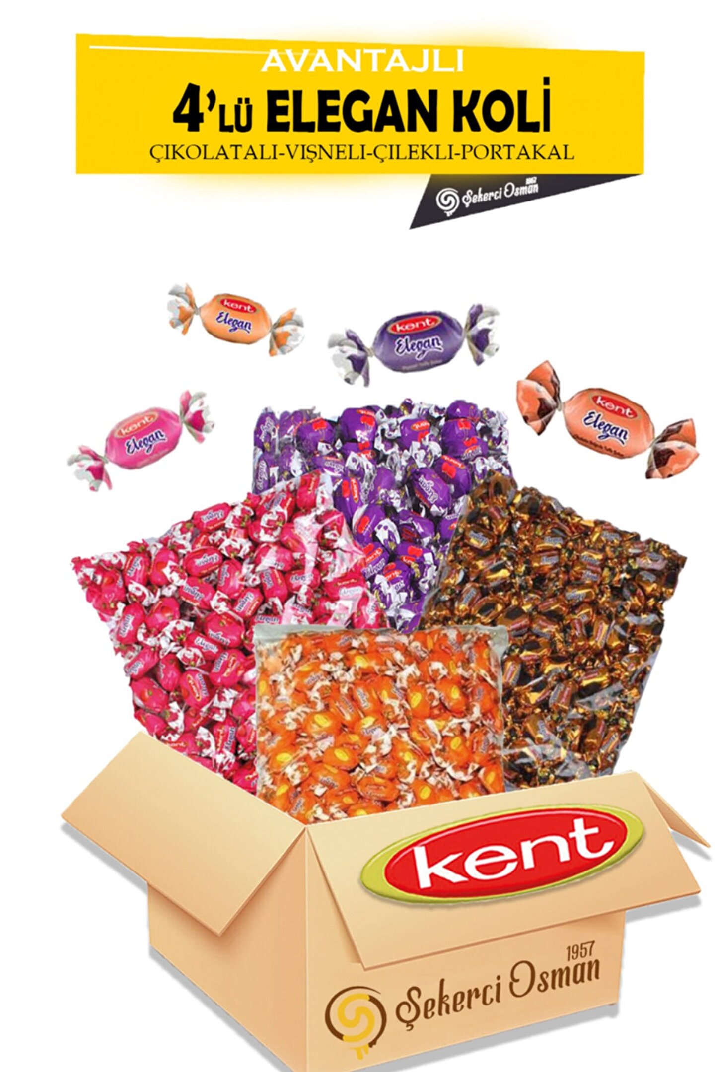 Şekerci Osman Mağazaları Avantajlı Kent paketi; İÇERİK 1; KG Elegan Çikolata Aromalı 1; KG Elegan Portakal Aromalı 1; KG Elegan Çilek 1; Kg Elegan Vişne;;